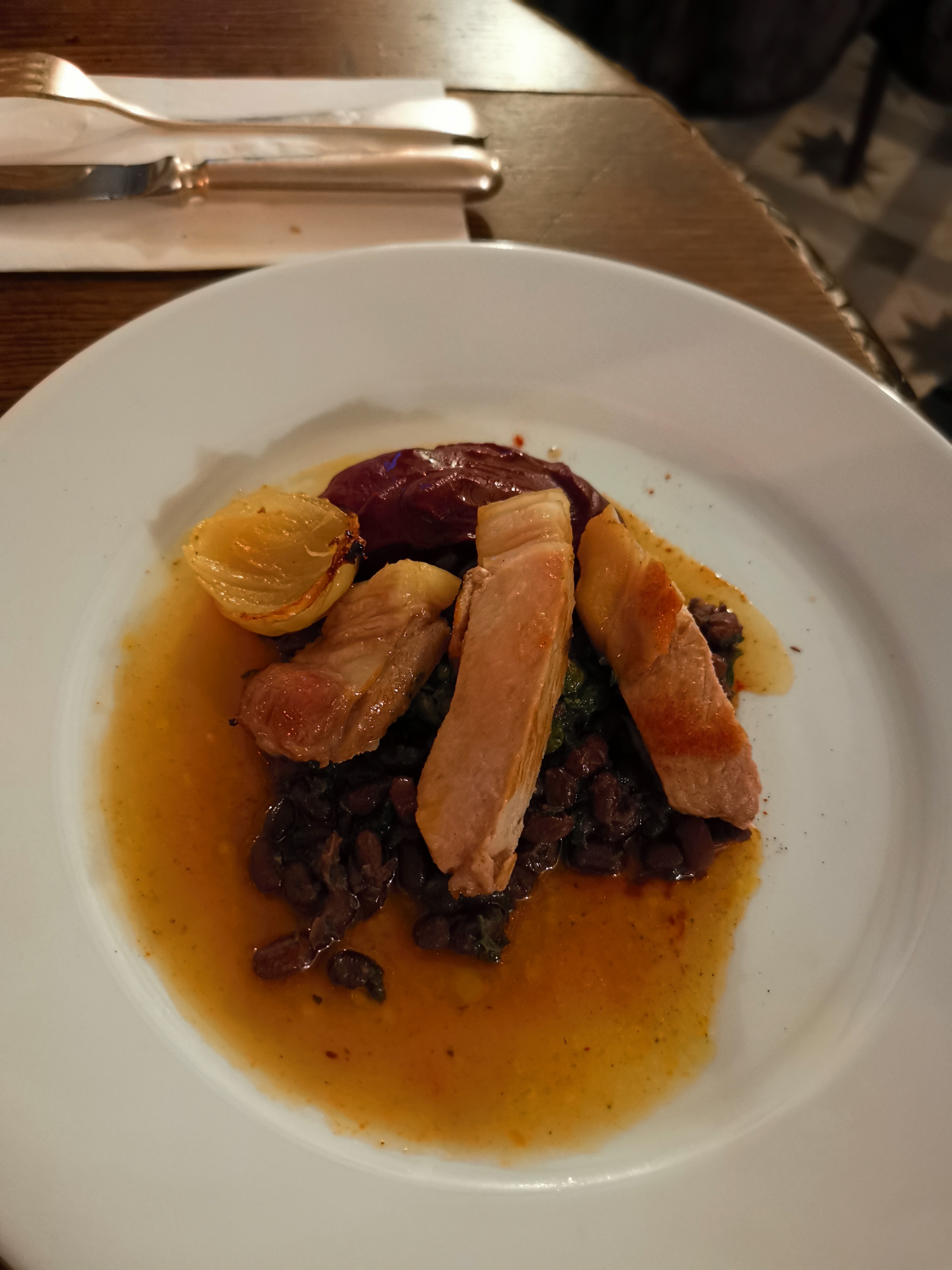 Très bon accueil, nous étions en avance. La bouchée proposée avant l'entrée a été le meilleur plat de tout le repas. En entrée nous avons choisi Saint Jacques et trompettes de la mort, ce qui est en fait une Saint Jacques coupée en fines tranches sur une sauce et quelques trompettes de la mort. Le plat était un magret de canard coupé en tranches, servi avec un petit carré de gratin de pommes de terre et des légumes dans une sauce aigre. La bouteille de cidre facturé 18€...