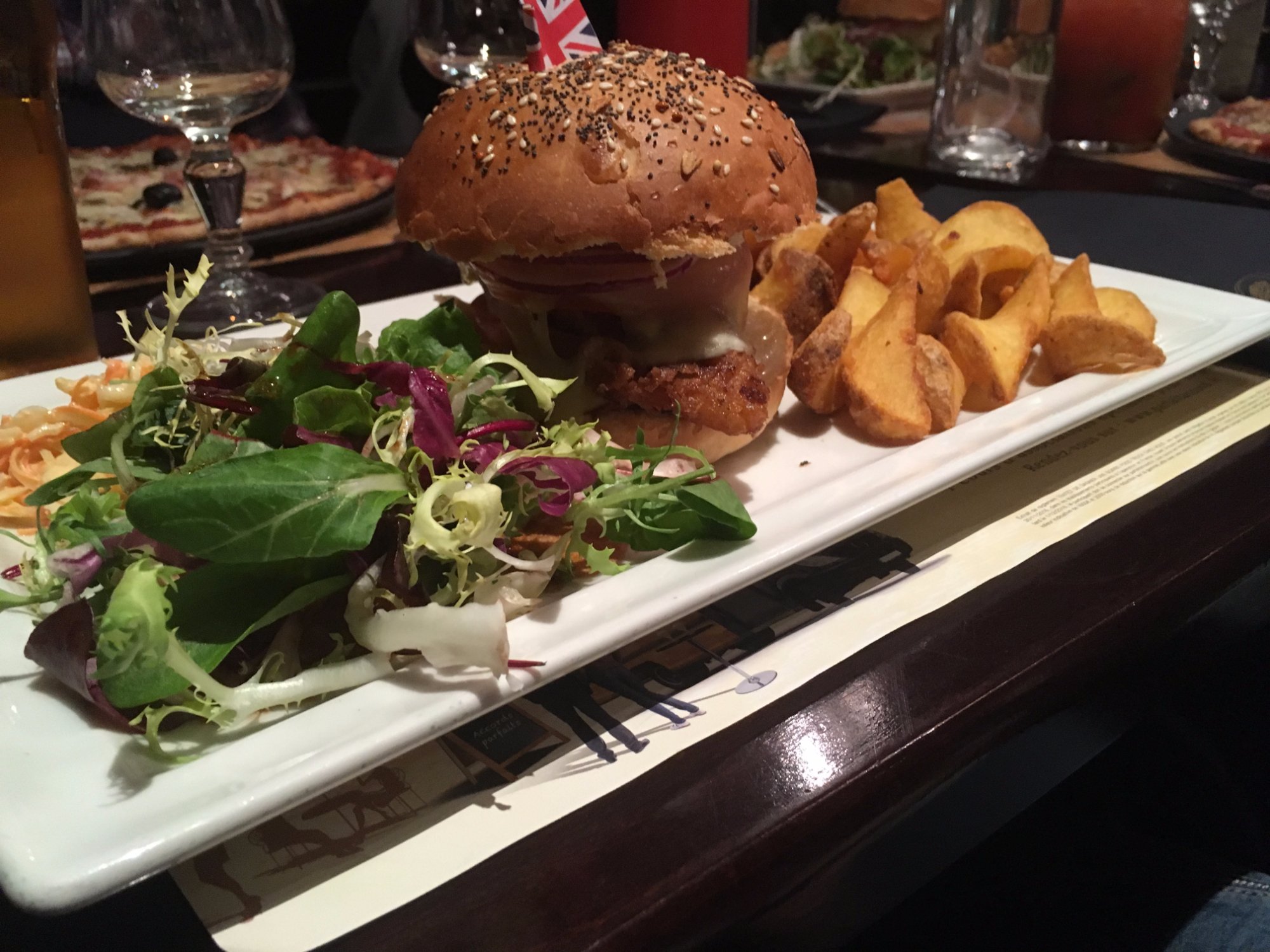 Pub très sympa. Service relativement rapide pour un jour de match. Burger savoureux et copieux. Frites maison. Le personnel est accueillant est sympathique, hormis notre serveuse qui devait être mal lunee ce jour là. Nous reviendrons