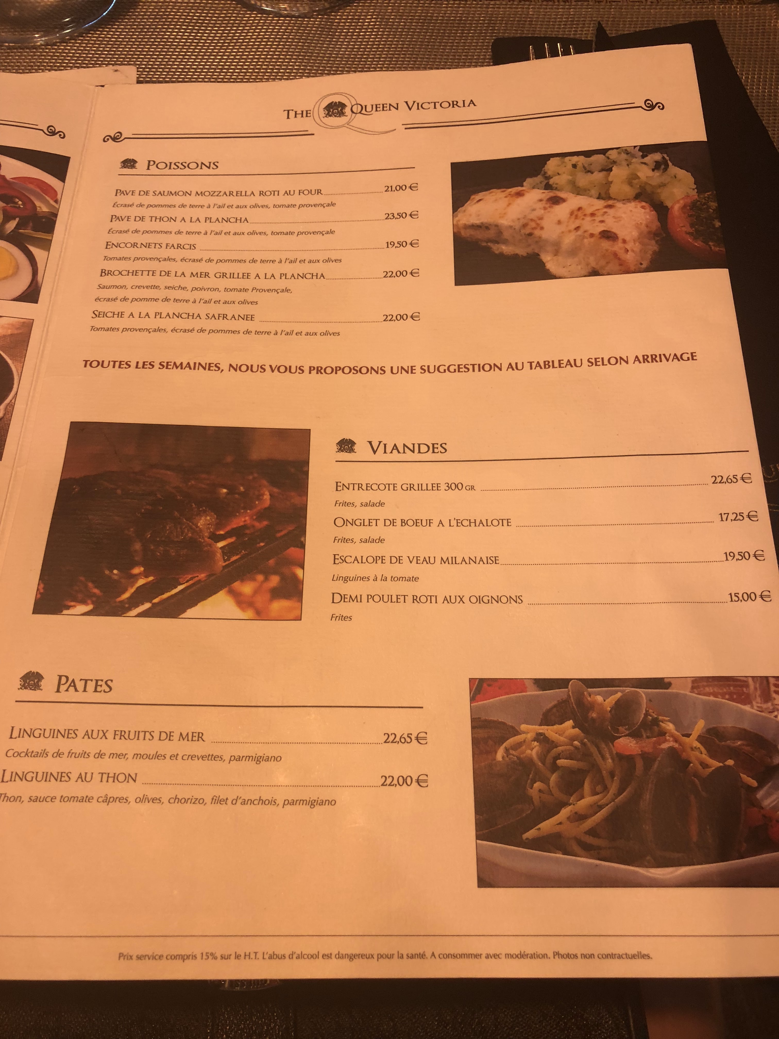 C'est la deuxième fois que je viens au queen car j'avais bien aimé la première. Cette fois il n'y avait personne à l'accueil et j'ai interpellé une jeune serveuse un peu perdue mais sympa qui nous a finalement installé aprés recherches un peu en panique. La pinacolada était bonne mais pas alcoolisée (plutôt un truc pour les enfants ) et le fish and ships était pas mauvais , les frites étant toutefois trop cuites , la salade en sachet et la sauce blanche industrielle. Le baba au rhum sera vite oublié . Un genre de 4/4 imbibé de liquide sentant vaguement le rhum et inondé de fruits rouges et crème chantilly industrielle + un petit verre d'un liquide au rhum à deverser dessus. La carte est beaucoup trop riche et trop variée pour que tout soit frais et trop hétérogène pour un pub anglais . Sinon le décors est très sympa mais le ménage devrait être mieux fait ( présence de poussière blanche épaisse sur les boiseries) Petit budget à prévoir dans cet établissement très touristique.