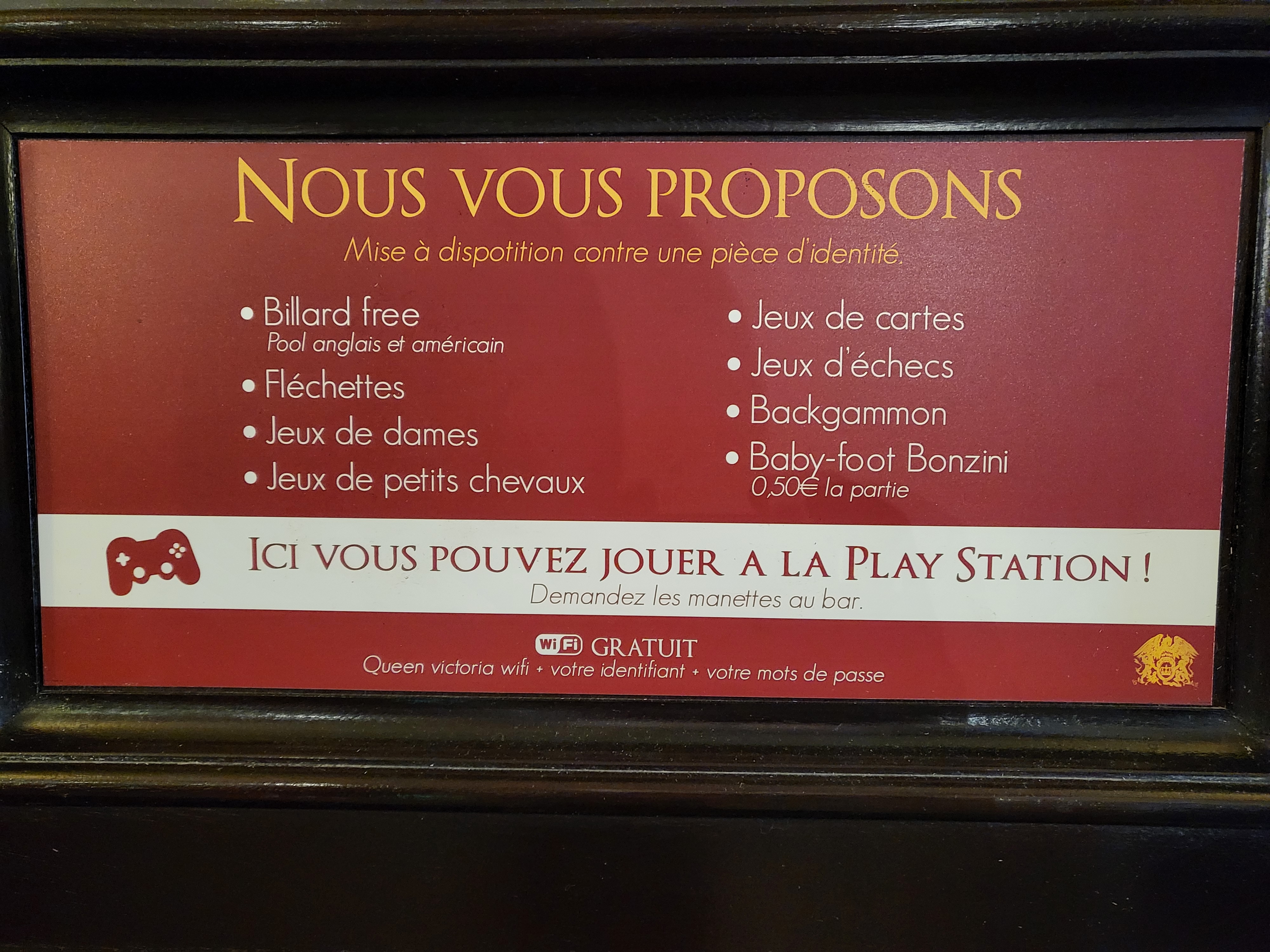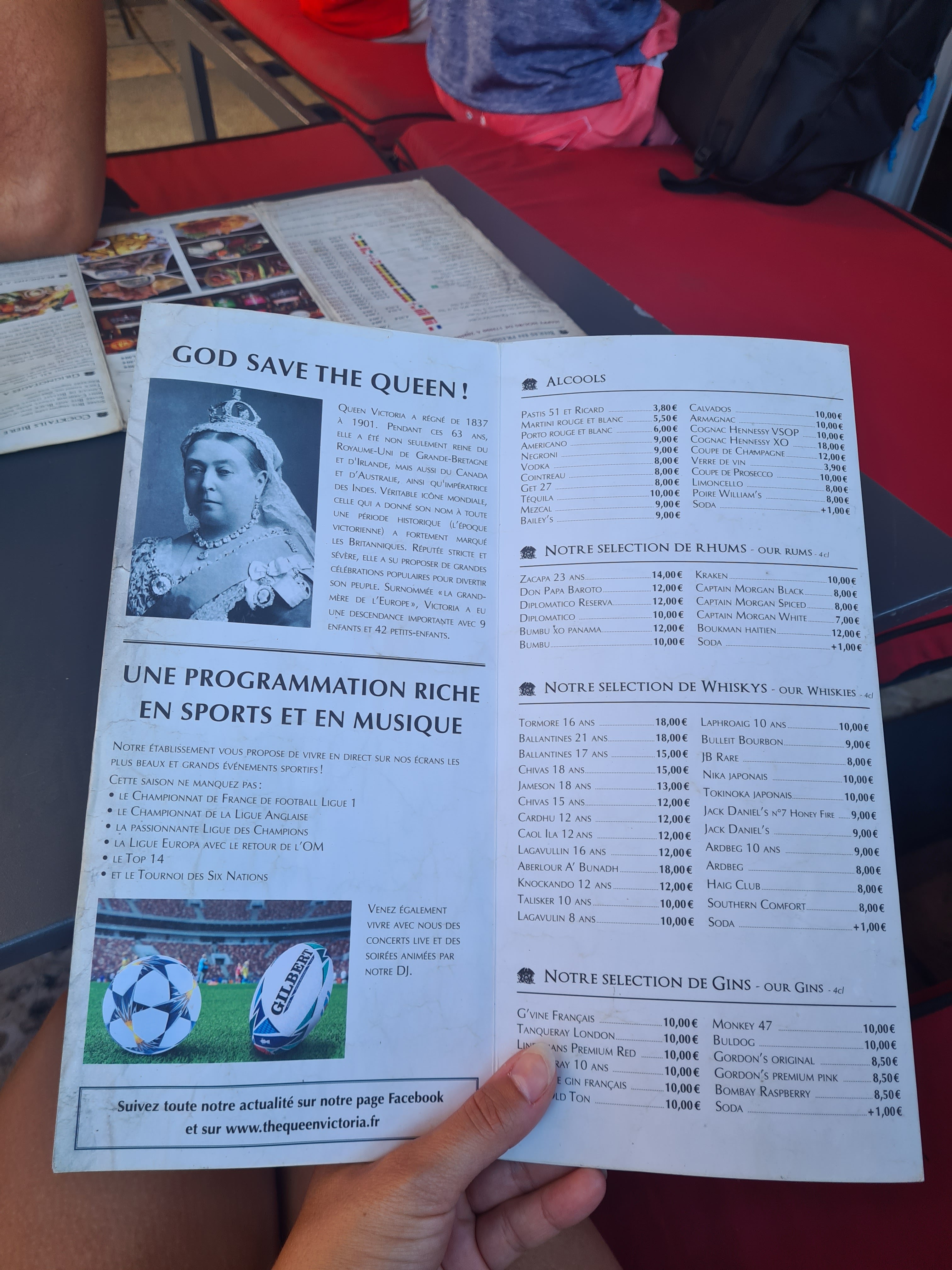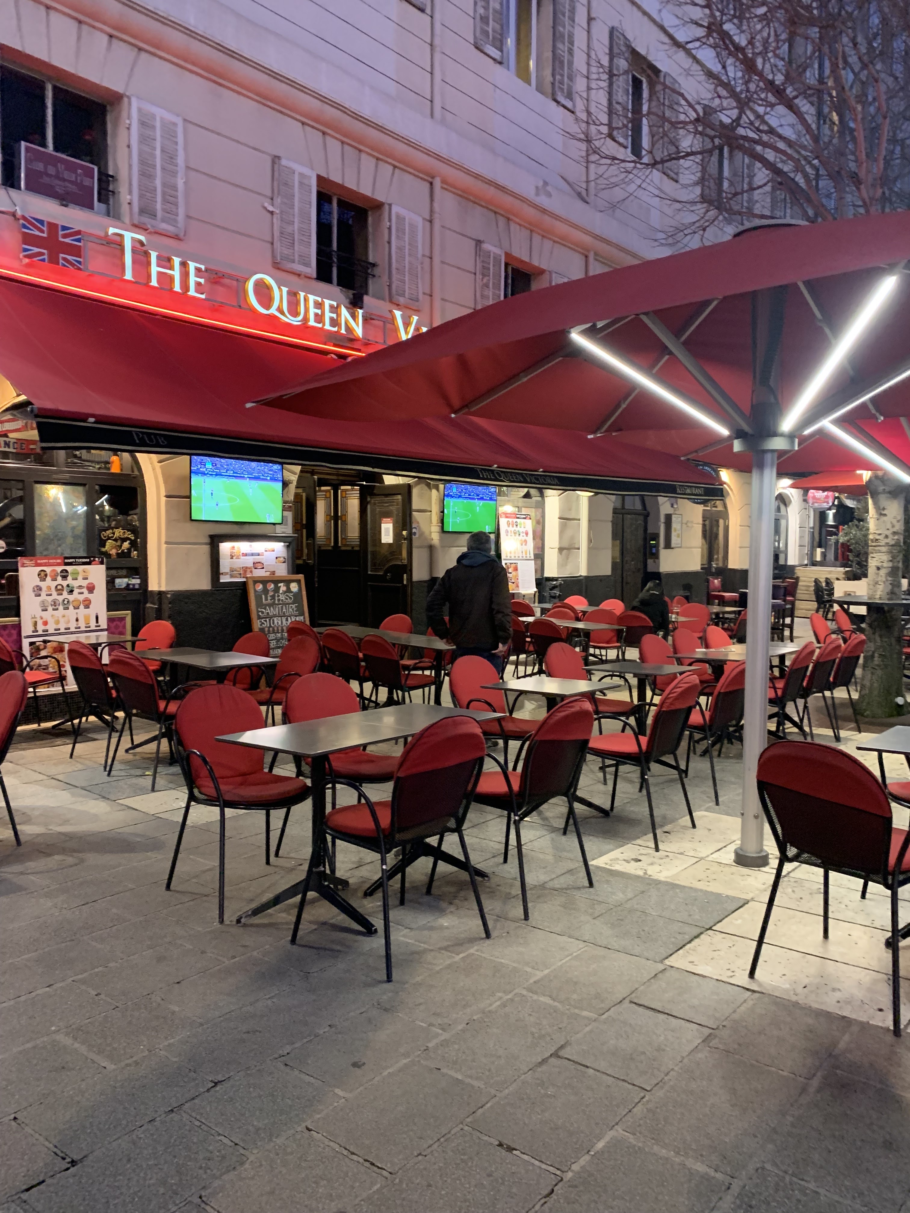 The Queen Victoria un samedi soir à 20h à Marseille et très peu de clients, est-ce un signe ? La bière est très bonne, mais ils confondent Flammekueche et pizza, effectivement ils mettent du gruyère rapé dessus, enfer et damnation dirait un Alsacien, cela enlève tout le charme de la Flammekueche. Les serveurs d’ailleurs sont aussi nombreux que pas aimable et l’un d’entre eux m’a carrément tutoyer ! Si vous aimez les bons restaurants un peu cosy, alors passez votre chemin. Ça pu le restaurant pour touristes !