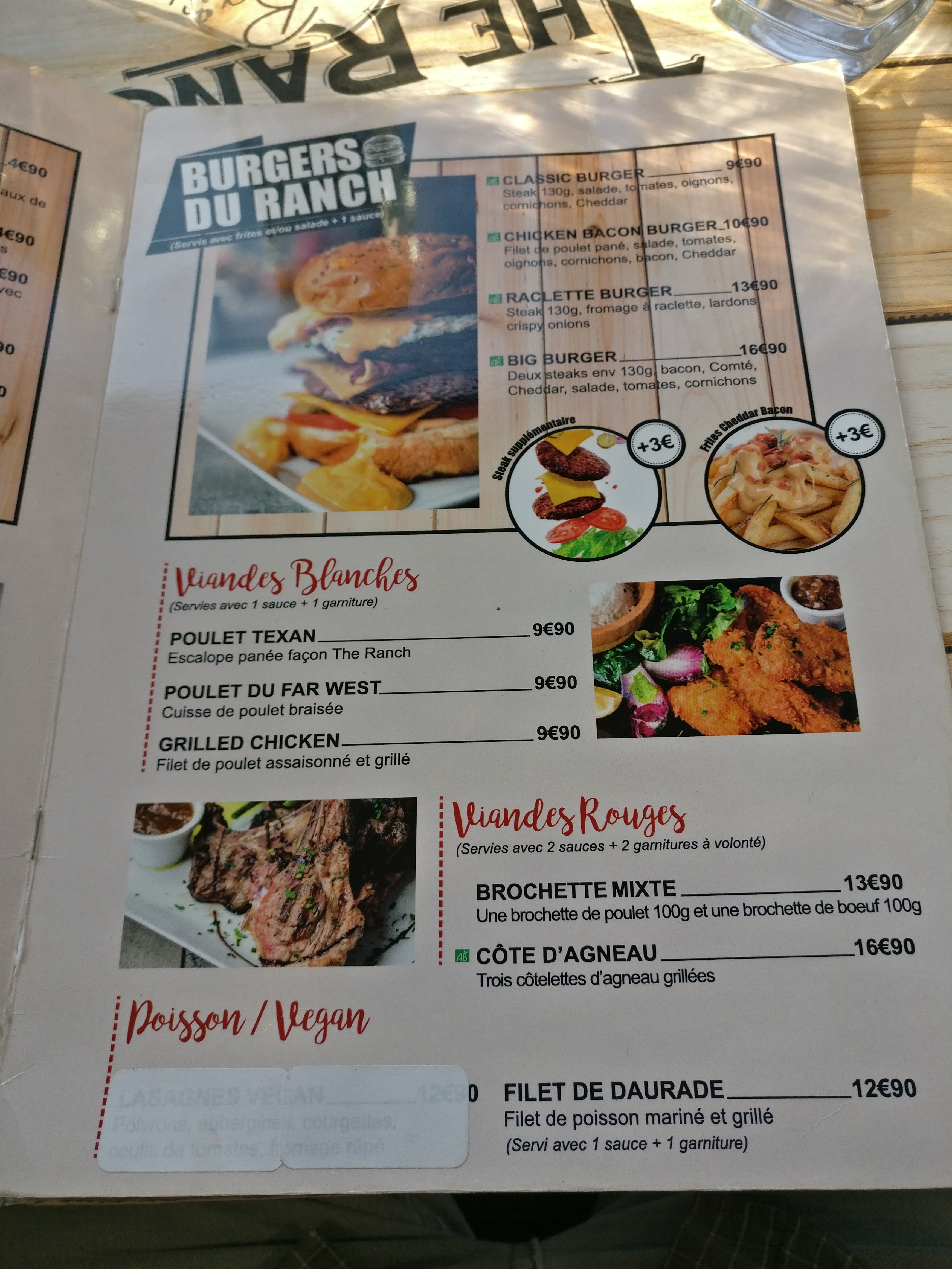 J’aurai pu mettre la moyenne mais j’en n’ai pas les moyens et je suis sorti du restaurant avec un sentiment mitigé donc 1. Mise à part le nom du restaurant et quelques noms des plats, il n’a rien d’un ranch ! Pas de décor de far west, pas de musique country…. Je m’attendais à mieux. Point positif : - la serveuse et le serveur était sympa et demandaient si tout se passait bien - les garnitures (frites, haricots) sont bonnes Points négatifs : - la serveuse n’était pas sereine à la prise de commande et avait du mal à expliquer - problème de cuisson (voir photo). J’ai demandé une cuisson à point … Un autre client avait demandé lui bien cuit… - la salle est vraiment petite et donc les tables sont petites. La place pour les deux plateaux et les verres mais pas pour les cocktails, le pain et les garnitures ! - le prix car j’ai demandé un plateau 2 personnes pour une personne (je pensais que le prix serait divisé) et à la finale en voyant la note, je m’aperçois qu’ils n’ont pas fait de moitié et ont laissé 50 euros. Ce que je reproche c’est le fait de ne m’avoir prévenu que le prix est le même pour 1 ou 2 personnes. - ne prenne qu’un ticket chèque vacances par personne mais c’est indiqué nul part. Quand tu en as pour près de 90 euros et s’il accepte, certes, deux tickets, ça fait beaucoup de reste à payer Pour ma part, c’est la première et dernière expérience chez eux. Pour conclure, ça reste un restaurant simple avec le choix de plusieurs viandes mais vraiment sans plus. Concernant le retour du propriétaire et pour être prescris : - les viandes m’ont été ramenés cuites. J’allais pas demander de me refaire une nouvelle viande - Pour les prix, j’ai bien demandé à la serveuse une planche pour une personne. Elle aurait très bien pu me dire qu’il n’y a pas de différence de prix. Je n’aurai jamais pris la planche, d’autant plus qu’elle ne vaut pas du tout 50 euros !