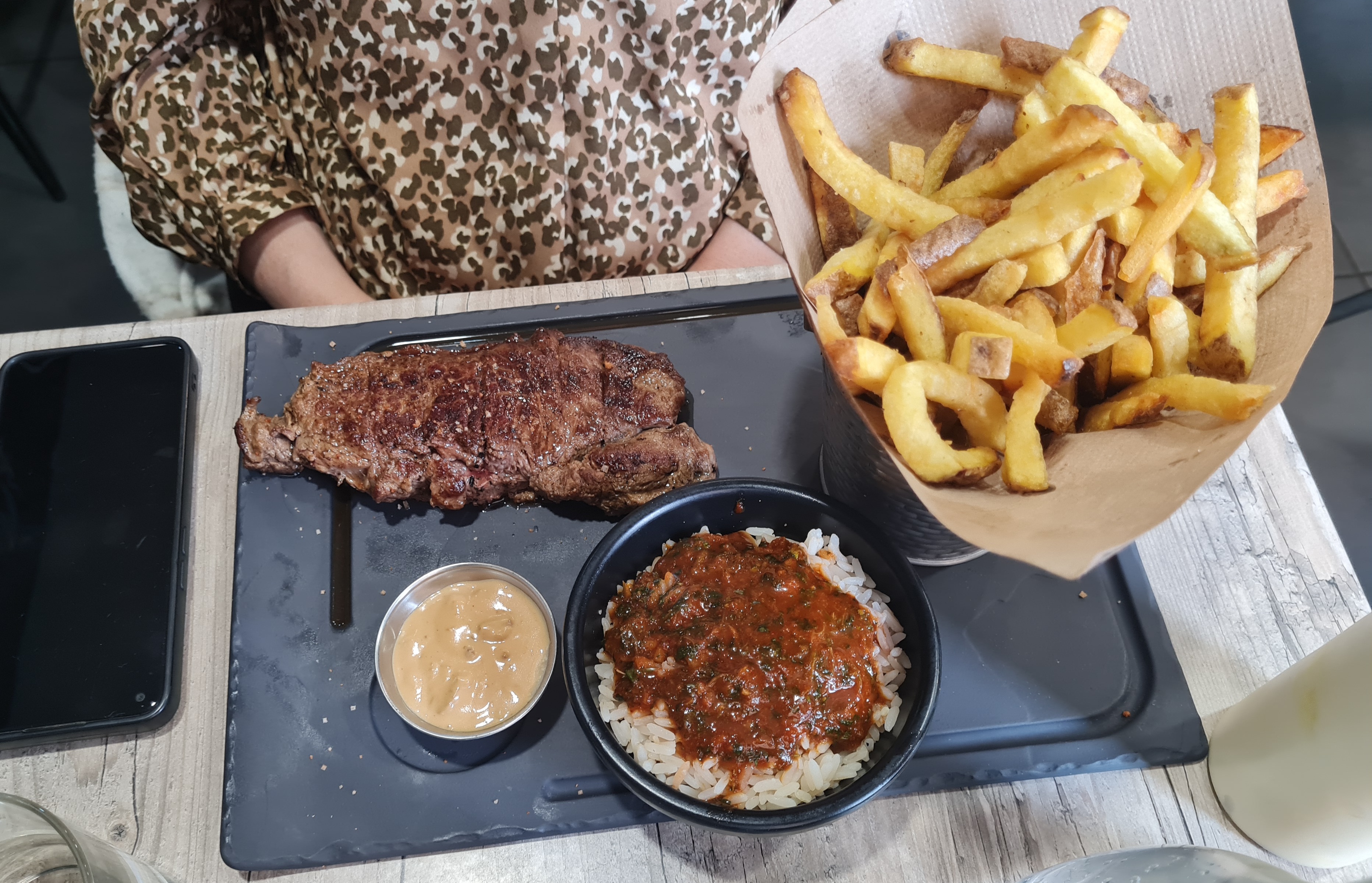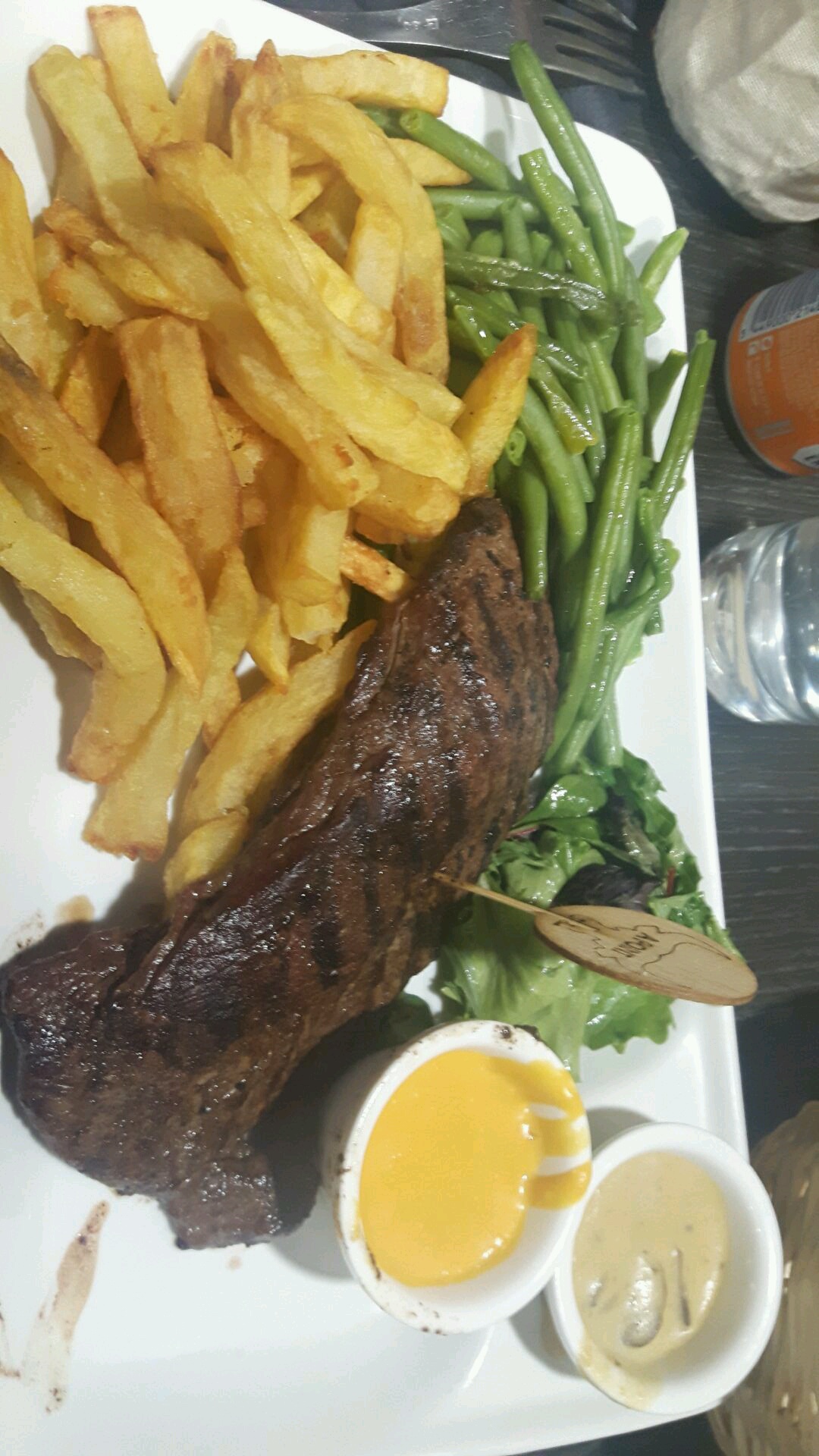 Bavette marinée excellente, frites très bonne, riz sauce forestière très bon . Le dessert et l’entrée bons et frais . Bon service. Mais voilà je me permets de mettre 3 étoiles pour la propreté du lieu, il m’a fait très mauvaise impression à l’arrivée quand j’ai vu le sol sale ( début de service ), les traces sur les chaises, taches de gras , assises et tables abîmées) , je ne m’attendais pas à ça et j’ai même eu envie de changer d’adresse . finalement je suis restée et j’ai très bien mangé mais s’il vous plaît, revoyez un peu le ménage .( attention aux rallonges branchées à hauteur d’homme pour les enfants, elles sont chaudes et sous tension ce n’est pas rassurant ) .