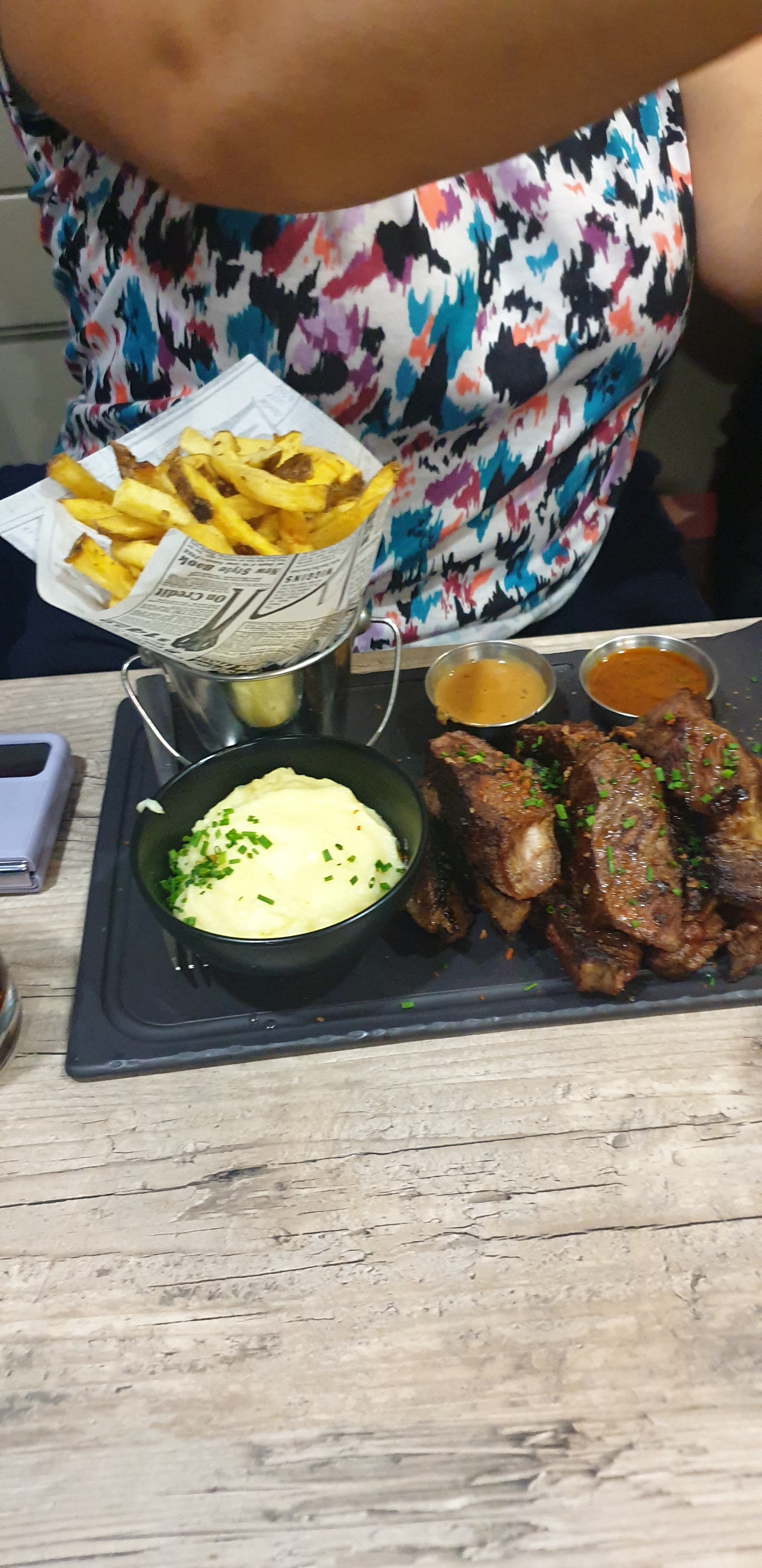 Il est nécessaire de détailler la note car plusieurs éléments sont à prendre en ligne de compte ☺️: 1/ l’accueil et les serveurs méritent un 5 étoiles. Une petite équipe mais qui fait main et pieds pour mettre le client à son aise. Merci à eux 2/ le local: bien décoré mais très très très petit. J’ai été étonnée car les publicités donnent l’impression d’un endroit spacieux. Nous sommes un peu coincé les un à côté des autres de sortent qu’on peut même participer aisément à la conversation du voisin 😂. 2 étoiles pour cela 3/ les plats : frites goûteuses - viandes bien assaisonnées - cocktail magnifique mais ça reste quand même onéreux - 3 étoiles Les posts sur les réseaux sont très alléchants mais il faut se faire son idée qui parfois s’éloigne un peu de la réalité 😊. Bon courage à l’équipe et bonne continuation merci pour tout .