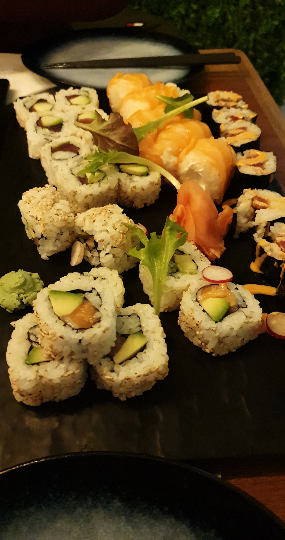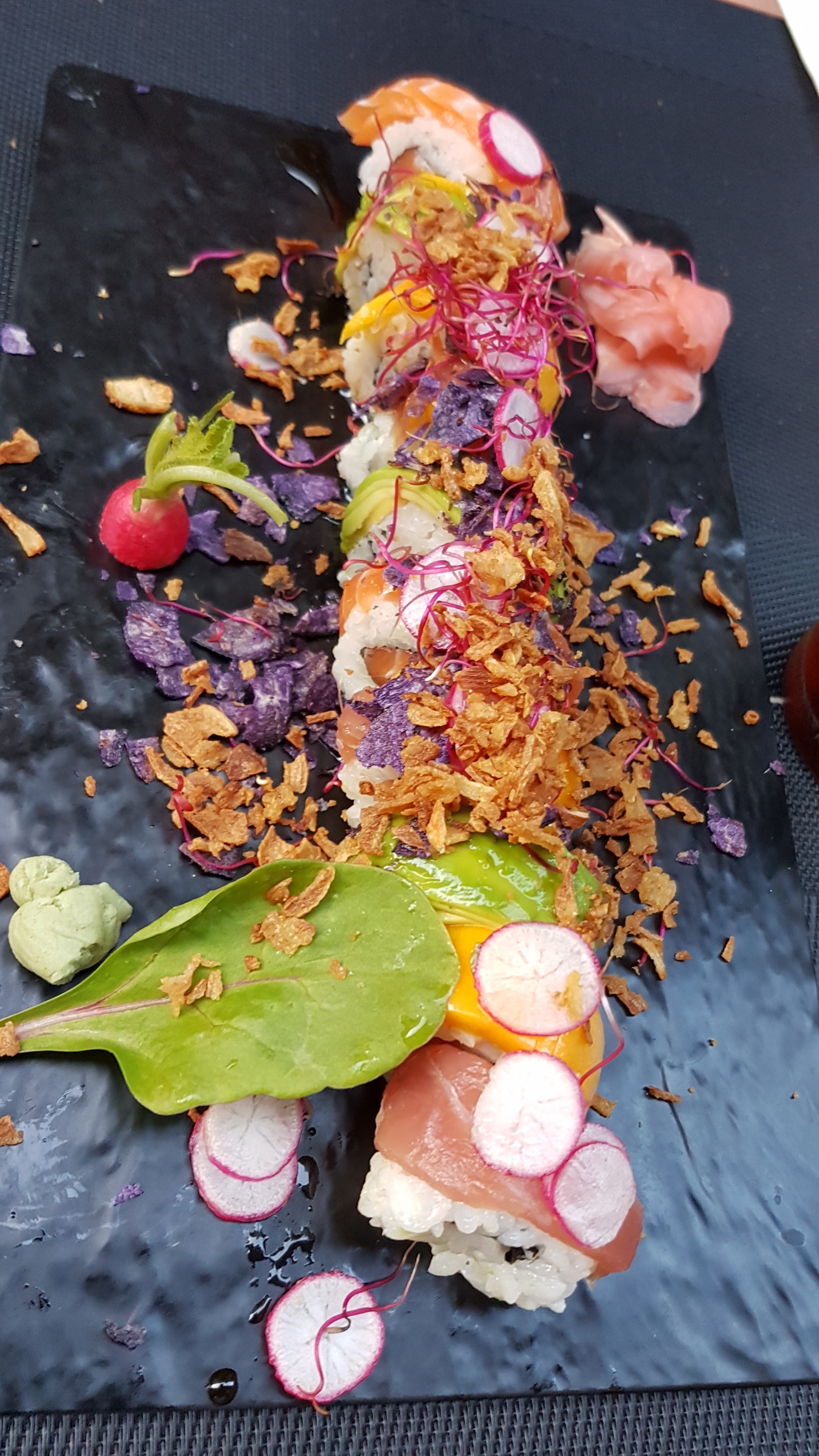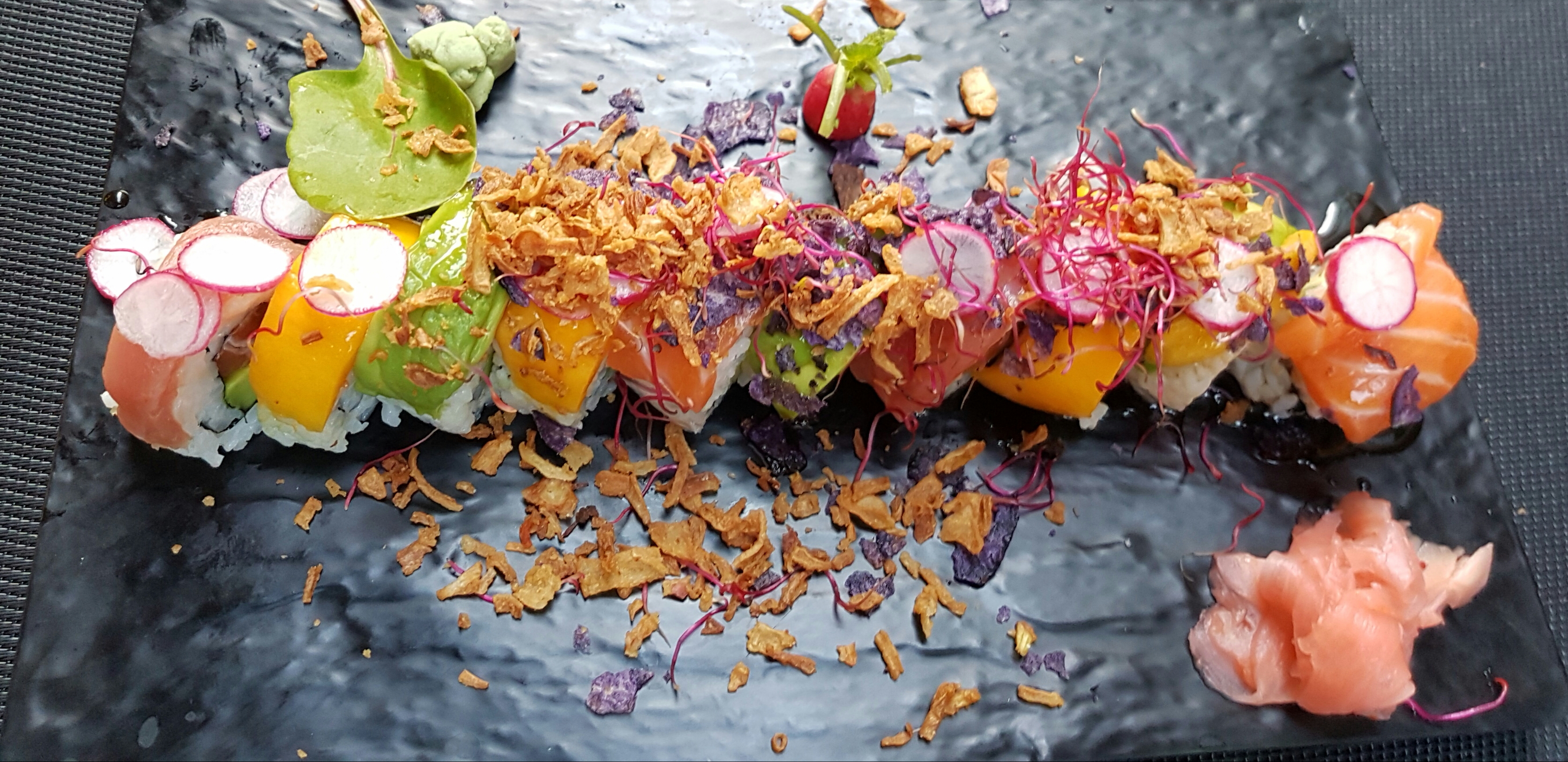 Un restaurant vraiment magnifique. Nous avons pris à emporter le menu L2 pour moi et Y7 pour mon compagnon. Lui il s'est vraiment régalé, il a adoré. Moi, même si mes sushis étaient très bons, toutes les sauces qui accompagnaient n'étaient pas bonnes du tout. Nous avions deux grands bols de sauces aux champignons, quand ni lui ni moi n'aimons les champignons c'est pratique. Surtout que je déteste le gâchis... Et il y avait sinon de la sauce soja, que je n'ai pas aimé non plus. Donc même si mes sushis étaient excellents, sans sauce c'est vraiment fade. Le bol de riz que nous avions était très gluant et trop cuit, nous ne l'avons pas trop apprécié. De plus, je n'ai pas trouvé très pratique la façon de prendre commande dans le restaurant, le menu fait sur tablette est je trouve un peu brouillon.