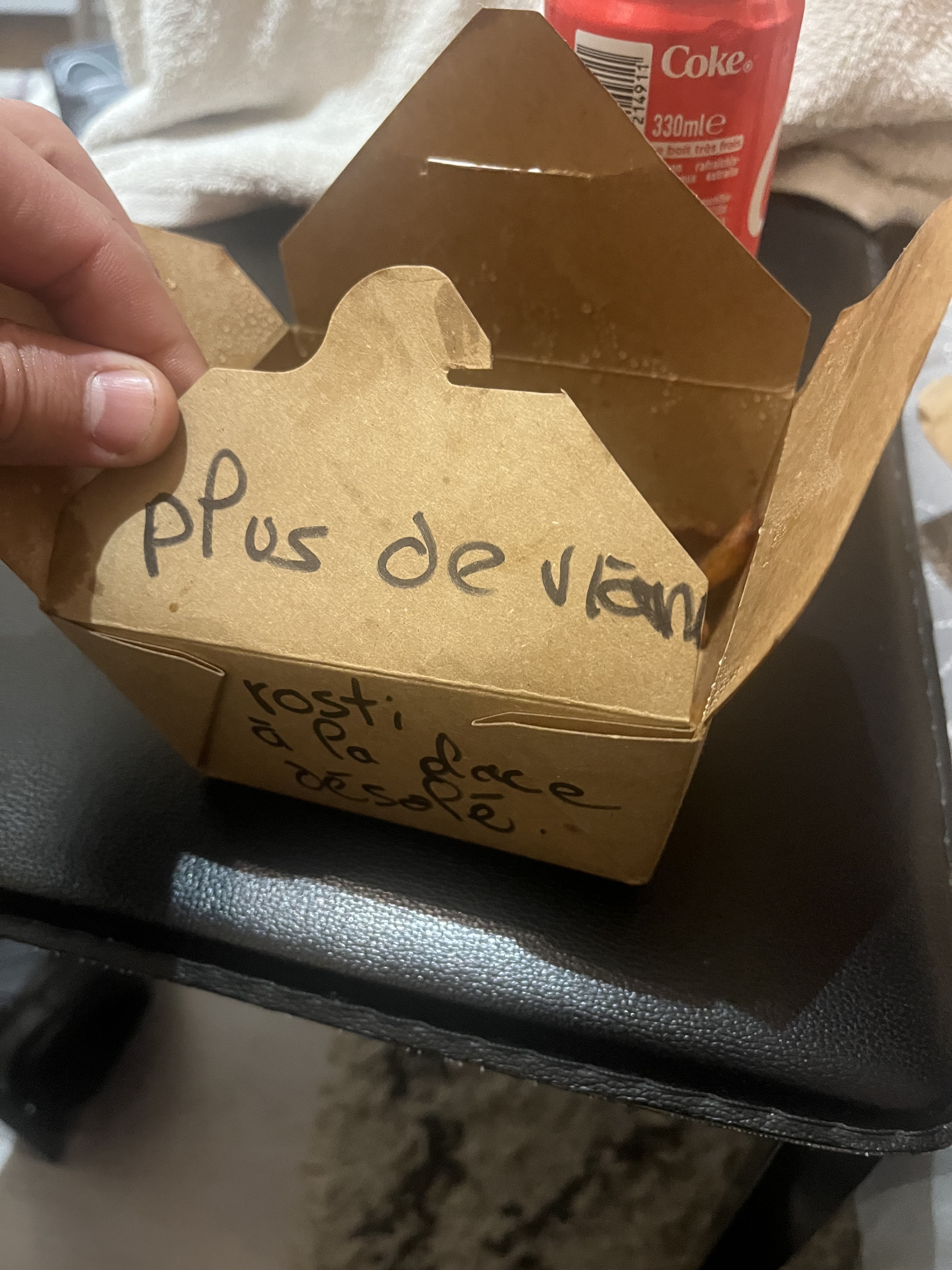 Nous avons passé une commande sur Deliveroo : Plus de viande c’est le message qui était écrit sur la boîte des frites. Nous avons commandé deux hamburgers avec steak haché et poulet. Nous avons reçu deux hamburgers avec des galettes de pommes de terre. Quand la marchandise n’est pas conforme on annule la commande ou on prévient le client! De plus frites molle, pas de serviette, et pas de sauce. 33€ pour une frite deux coca du pain et 2 galettes de patate