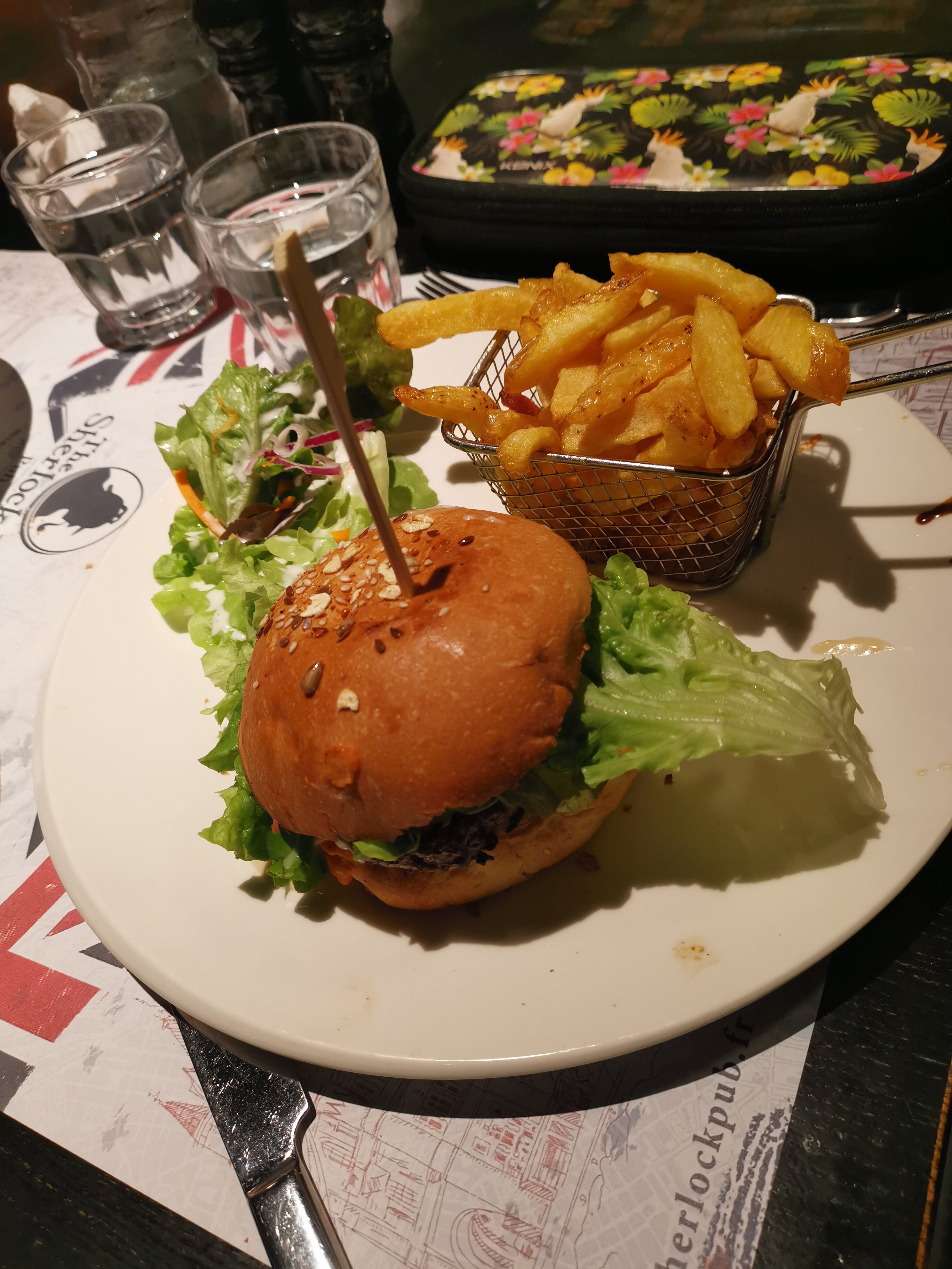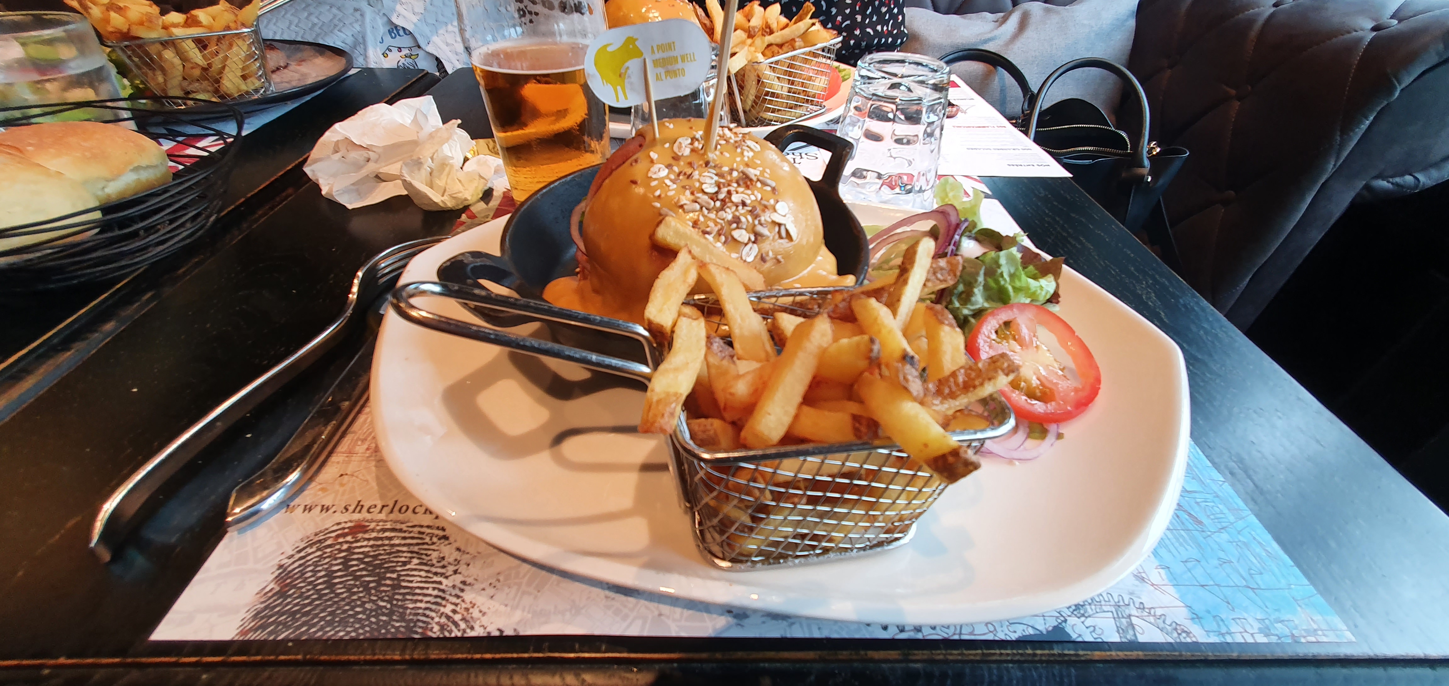 Cadre tellement exotique !!! Sur le thème de Sherlock Holmes. On se croirait presque dans un musée avec tous ces objets et cette décoration. Restaurant sur 2 niveaux. La carte proposée offre un grand choix, tant en plat qu'en boissons. Cocktail alcoolisé ou non, mes enfants en ont choisi un différent. Des choix en bière original, pour les amateurs. Malgré l'affluence, lors de notre passage pendant la semaine entre les deux fêtes, le service est rapide. Le personnel est sympathique et arrangeant. Ma fille végétarienne a pu choisir un burger qui, a l'origine contient de la viande remplacé pour l'occasion par une galette de pommes de terre. Me concernant, j'ai choisi le welsh rarebit servi avec des frites, très copieux. Pas trop de difficulté pour se stationner, car nous sommes au parc Gaumont millésime offrant de très nombreux parkings. Nombreuses activités a proximité : cinéma, bowling, commerces. Bref, merci pour ce moment !!!