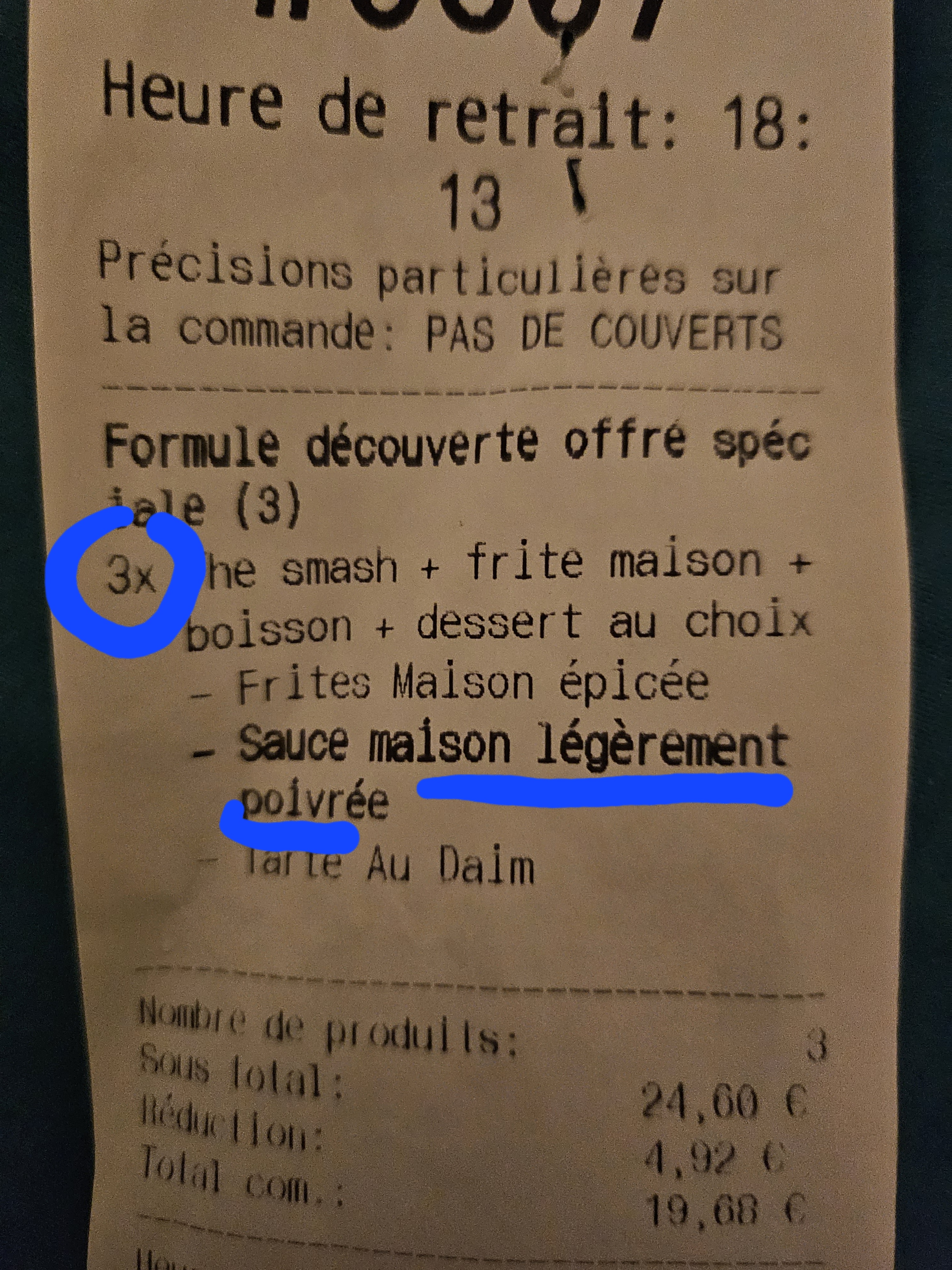 Bonsoir Voila ma 6 eme commande ou 4 je dis bien 4 dentre elle manquait la moitié de la commande. Sur deliveroo on vous propose une formule, une formule !! decouverte avec sandwich fritte dessert et sur mes 4 commandes je nest que le sandwich avec 1 dessert ou 1 fritte ou rien sa dépend le hasard. On paye egalement des supplements de sauce ou de boisson pour etre sur de les avoirs mais on a toujours rien sur quand meme je le rapelle 4 commande sur 6. Voici des preuves en images ci dessous de ce que javance. Japelle le restaurant et on me dit cest normal, deliveroo sest trompé? Sachant que cest le restaurant qui établis ses menus (jai ete restaurateur avec deliveroo egalement) Il me redemande de passer commande sur deliveroo pour ajouter cela a ma commande. Je rappel quand meme que le minimum de commande sur deliveroo cest 10euro...... Je veux bien laissé le bon soupcon sur 1 ou 2 commandes...mais la 4 sur 6 cest quand meme fort Neanmoins vous me direz pourquoi nest il pas partit. Car je sais au fond de moi que cest un bon restaurant avec une bonne cuisine. Peut etre des nouvelles personnes prepare les commandes chez eux je ne sais pas. Donc je resterais neutre la dessus car il ne faut pas tout melanger. Mais faite un effort svp :( Cordialement