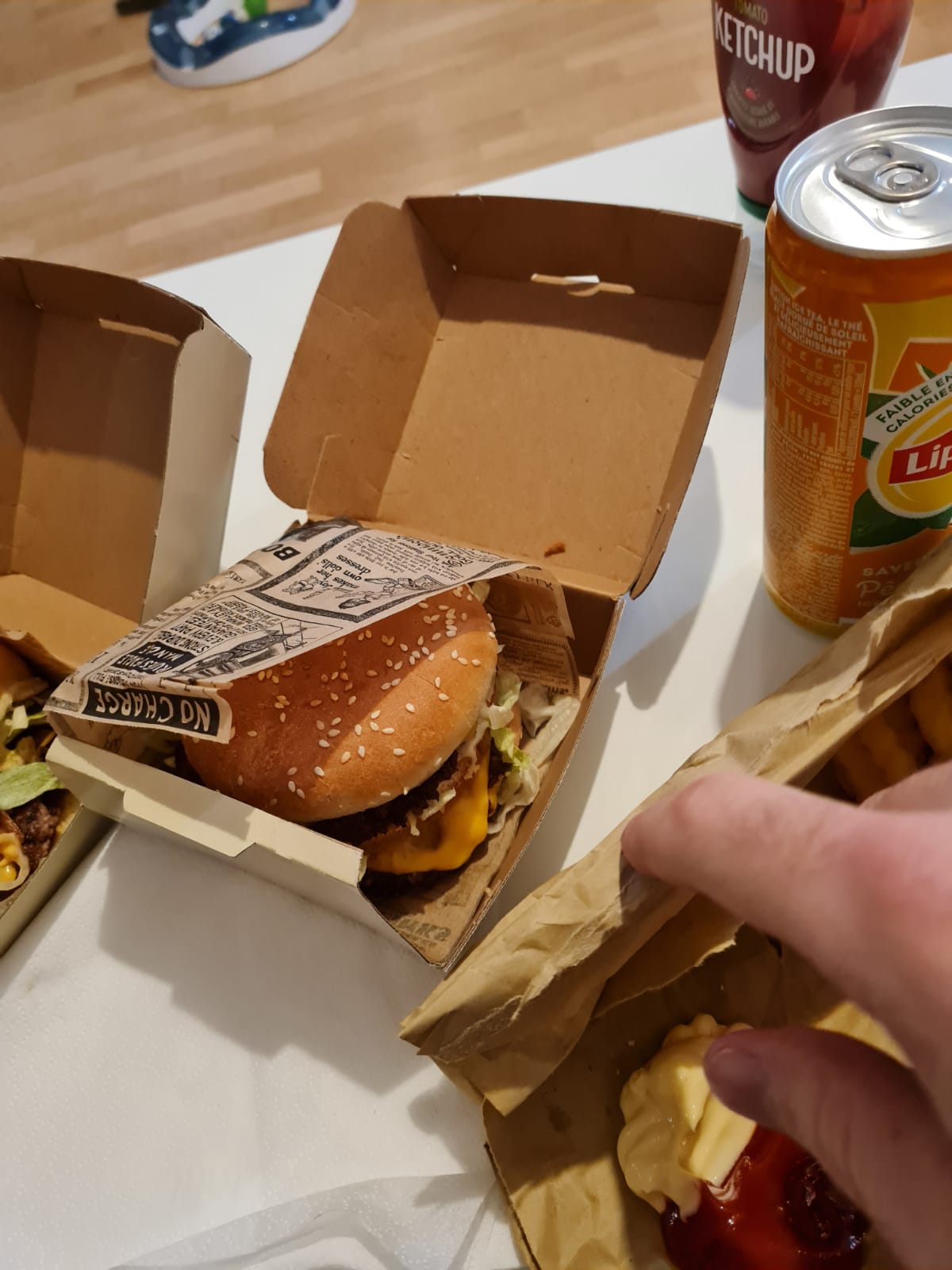 J'ai commandé chez vous ce soir. ENORME surprise! Tout est bon, sandwichs, nuggets, tenders. On retrouve le vrai gout du double cheese, le vrai gout des nuggets etc... un peu comme au mc do. Je repasserai commande c est sûr! (Et on a meme eu une frite offerte!)
