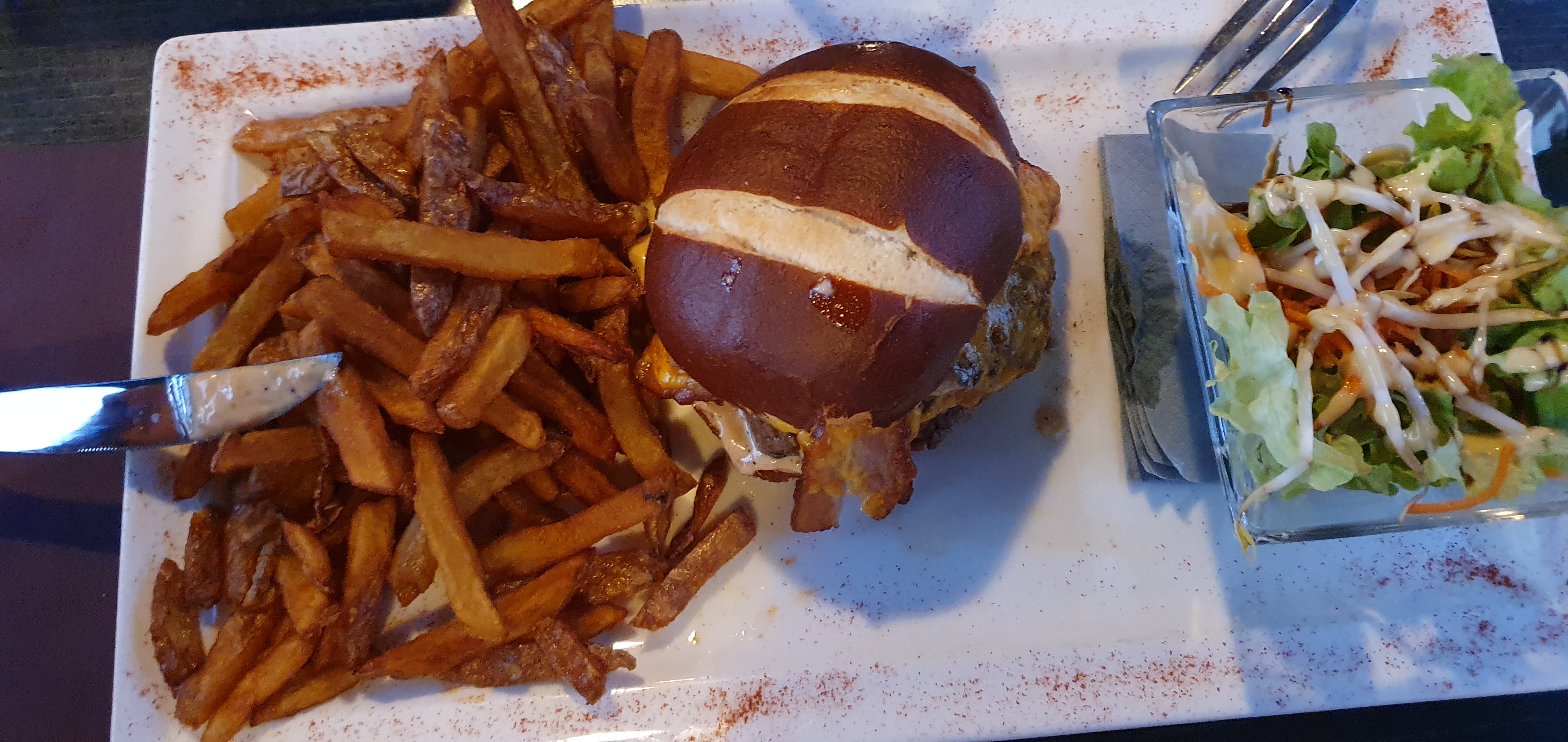 Burger très bon, avec pain délicieux tout comme les frites maison mais manque de crudités. Très bonne salade mais pas assez copieuse et bon dessert avec une belle présentation.
