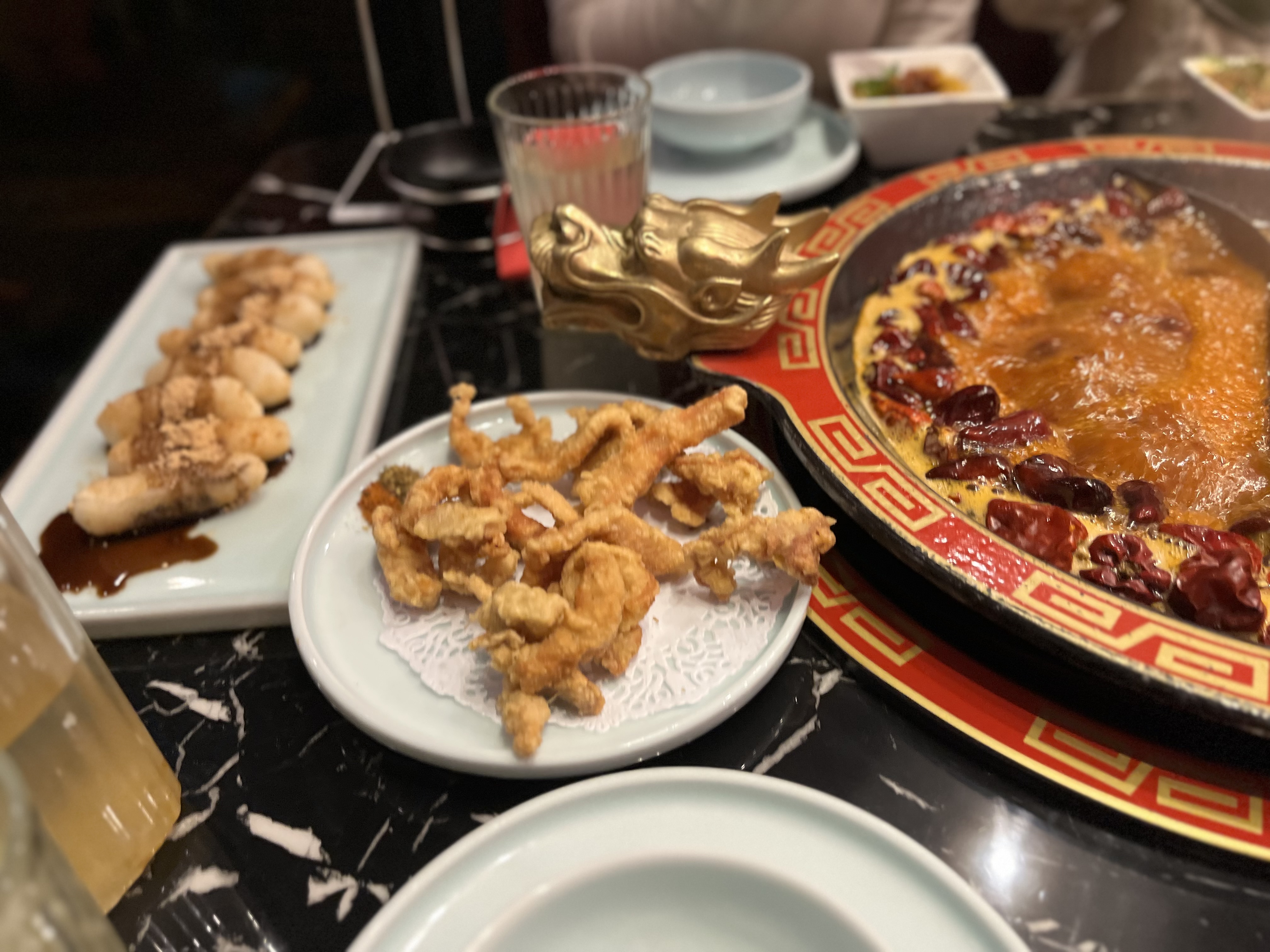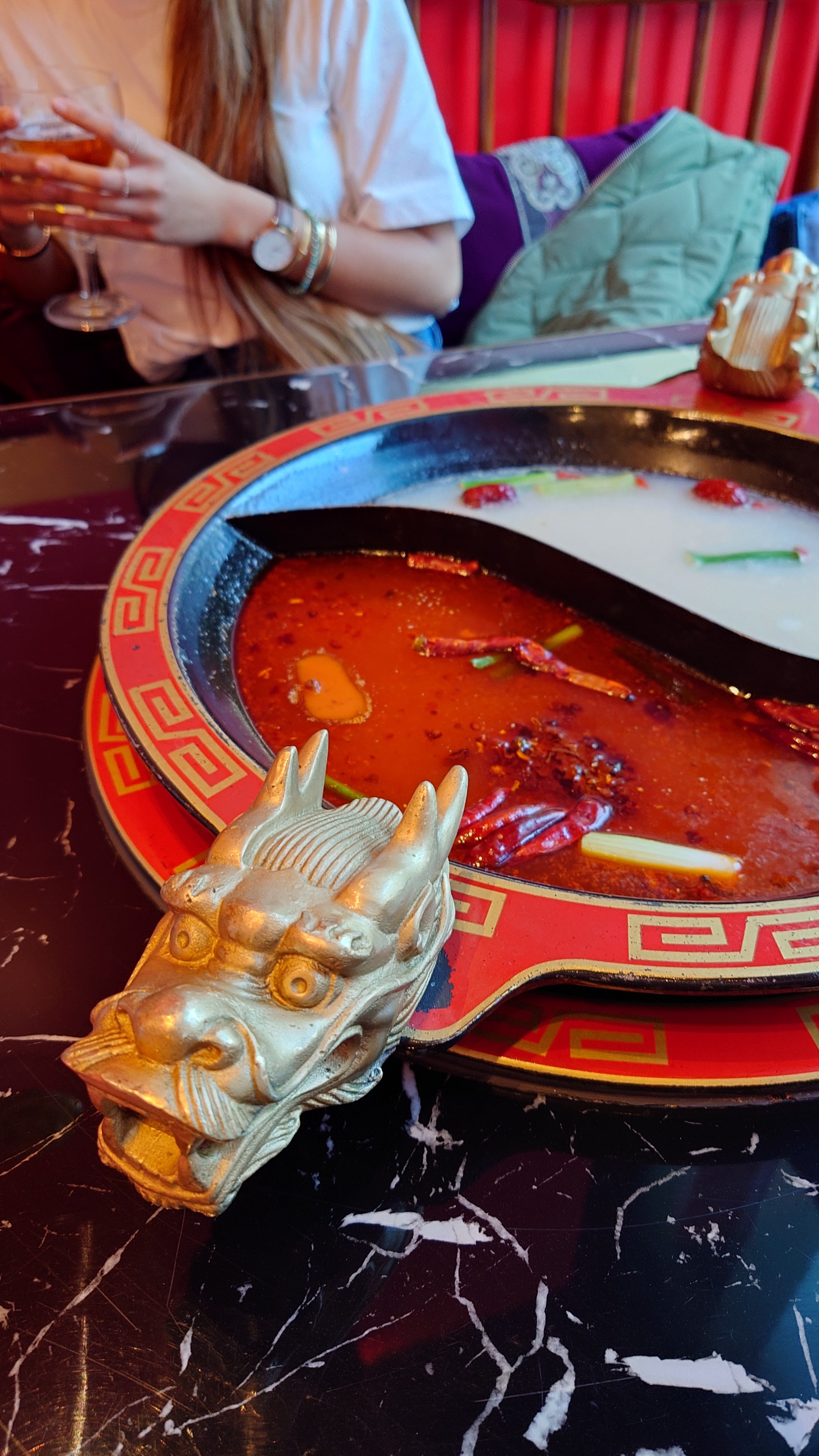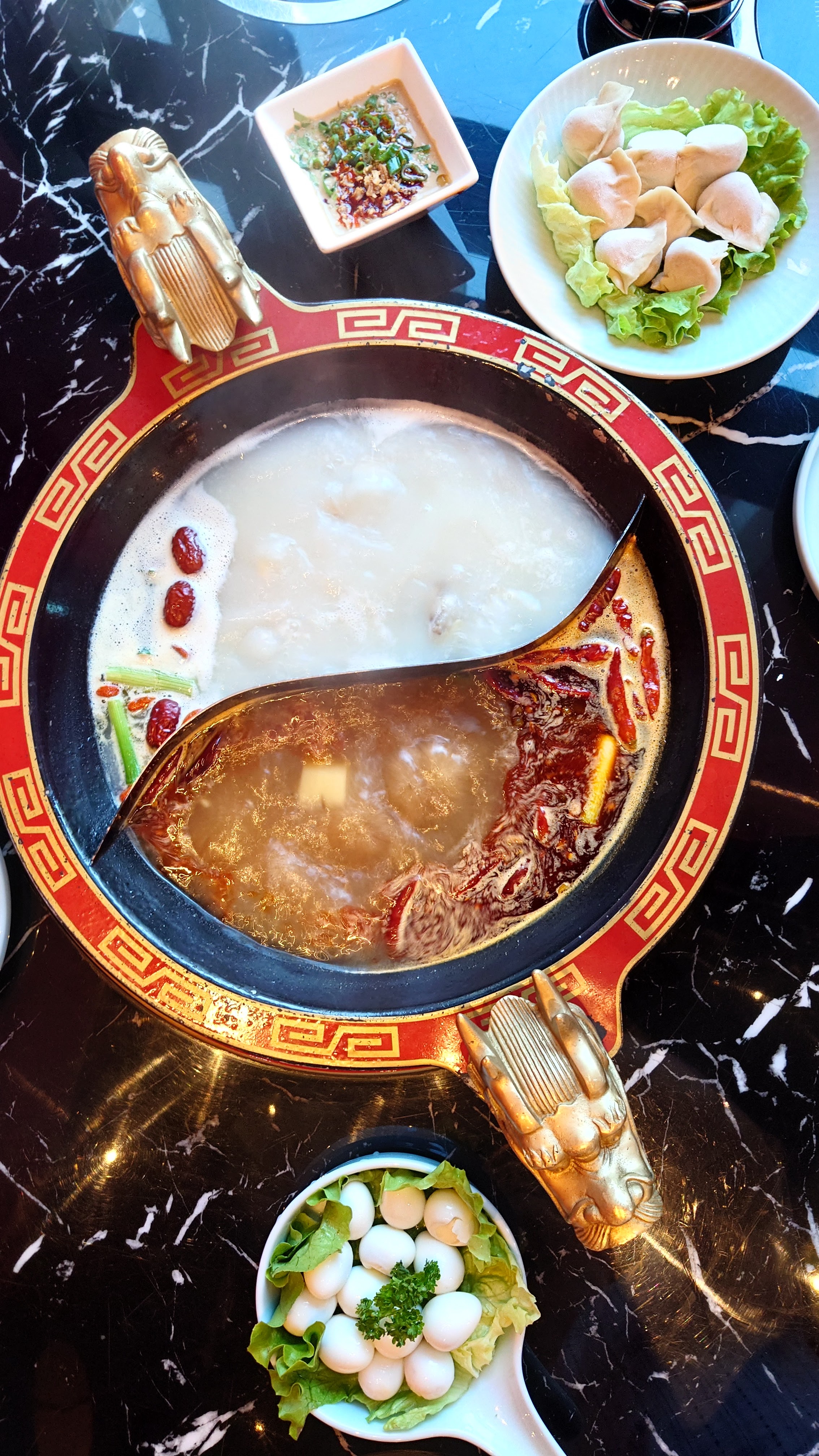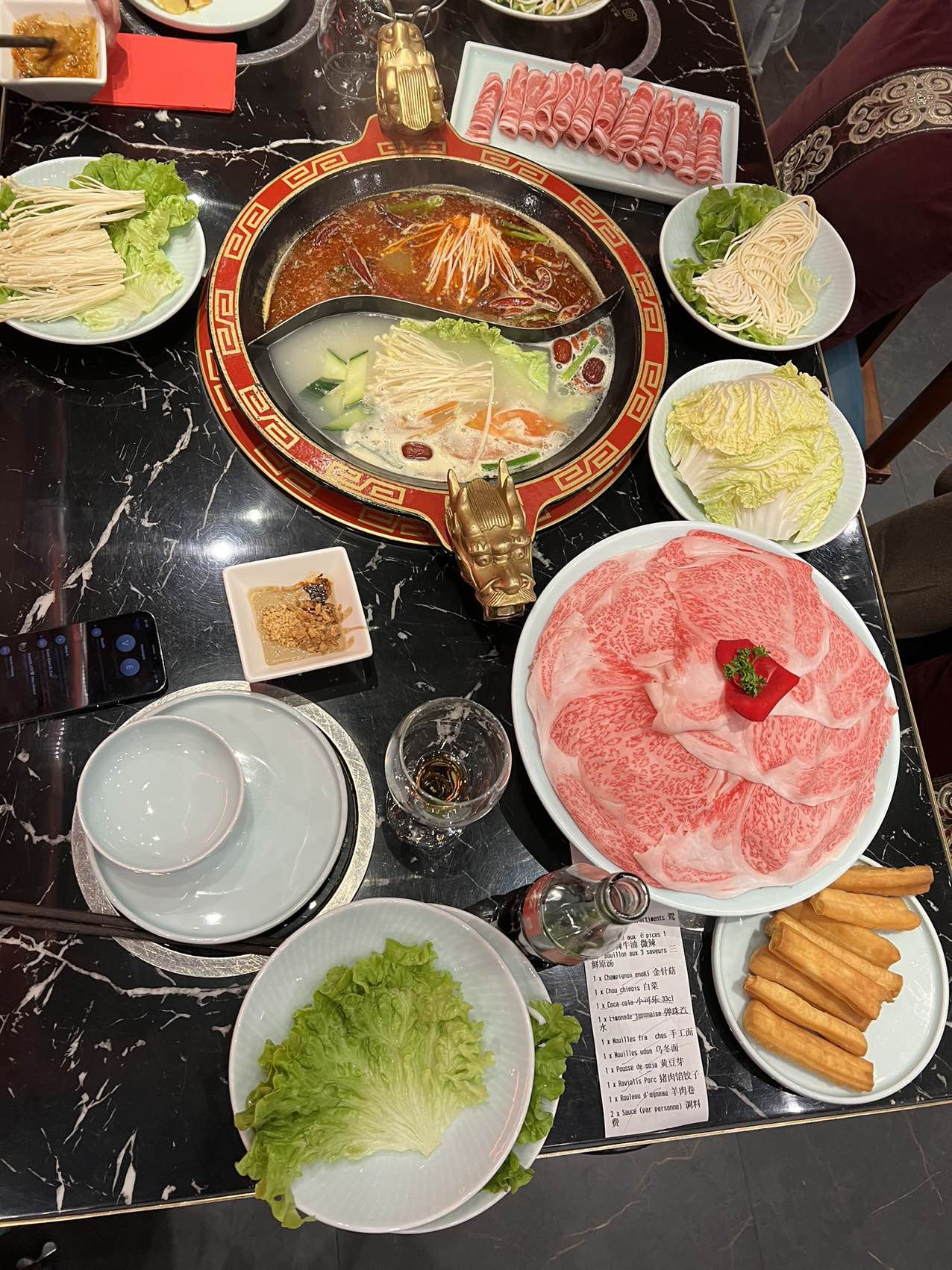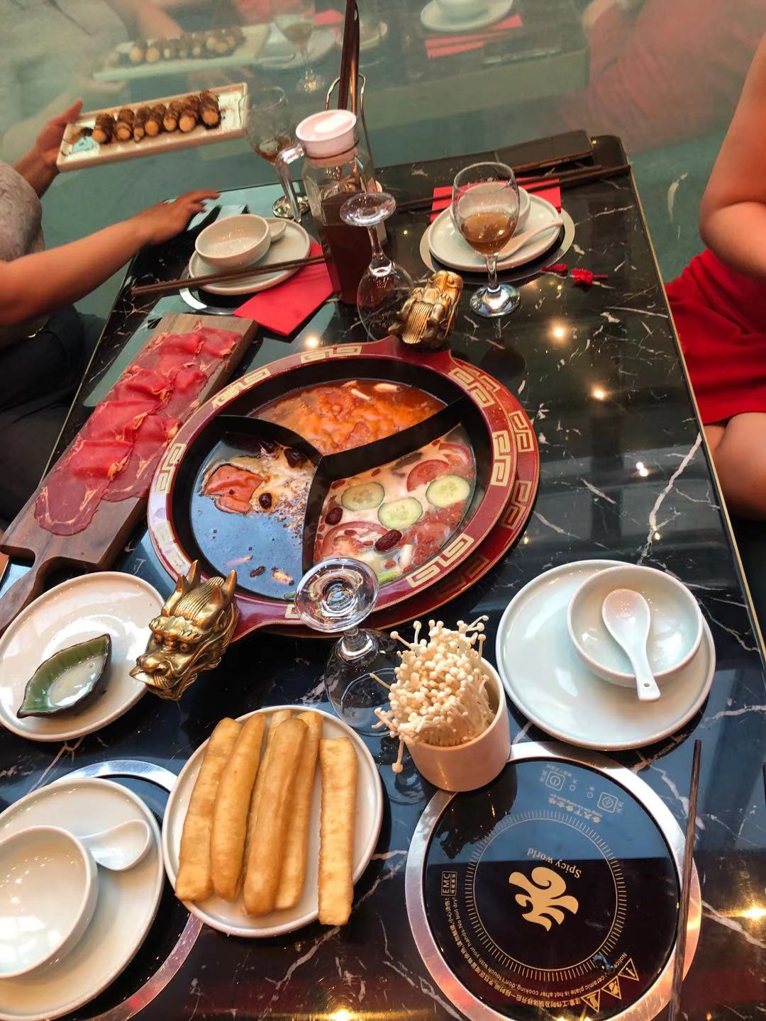Cette fondue Chinoise était moderne en utilisant les tableaux de commander 📱. On peut réchauffer les plats par les chauffe-plats sur la table. 🔥le pot de soup 🍲 était bien décoré en deux dragons d'or 🐉🐲. Je trouve que ils étaient généreux en épices 😋. On profitait de une soupe 🍲 de tomate 🍅 dans laquelle le vitamine c nous stimulait le collagène et une soupe de pied de porc 🐷 qui était plein de collagène. 😅😁 Ils nous ont donné une graaande table pour deux personnes seulement 😮 cependant xiaolongkan et fondue 9 ne l'avaient pas fait. J'étais contente que on a y bien fêté. ✌️🌶️🥳 il faut aller 😍. il faut reviens 😍.