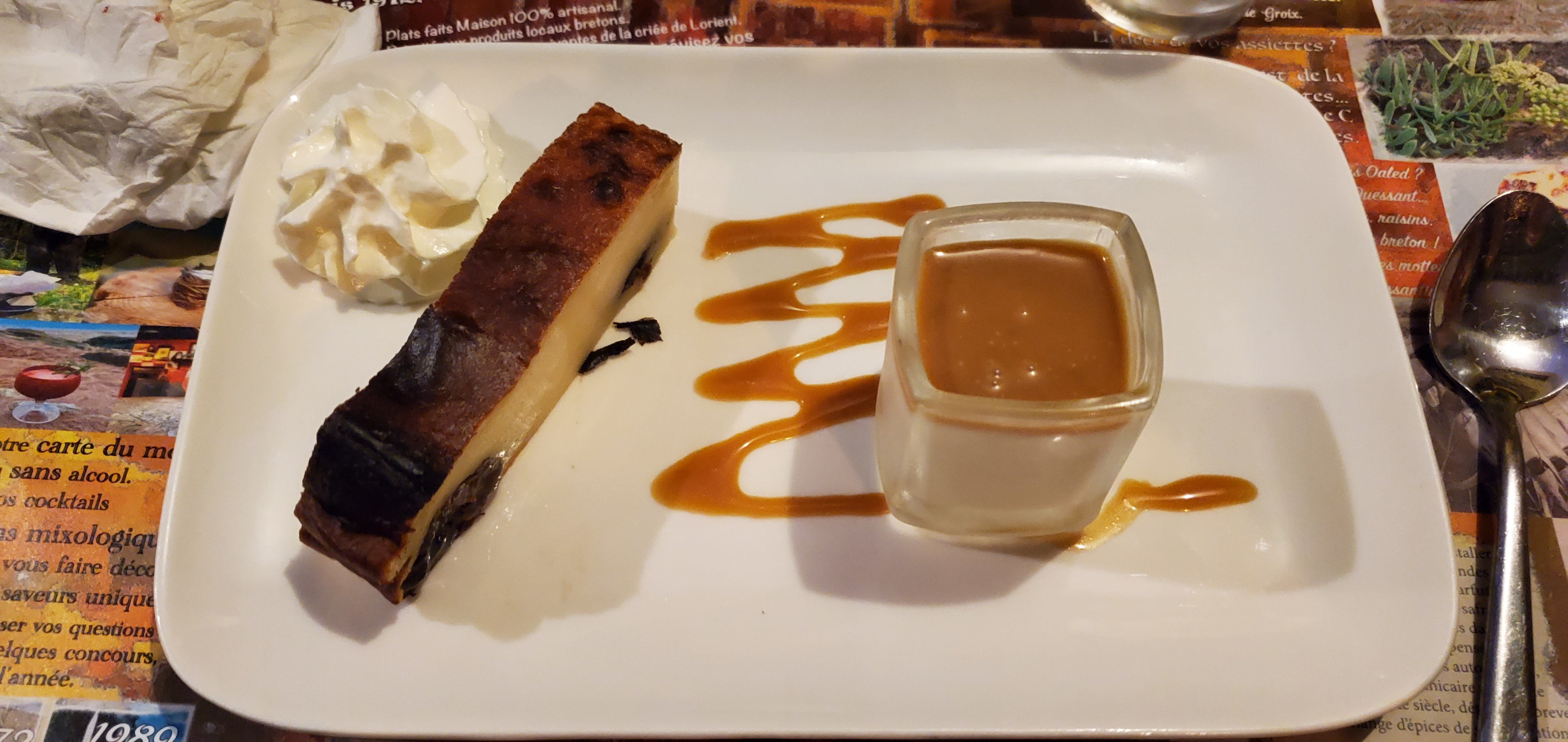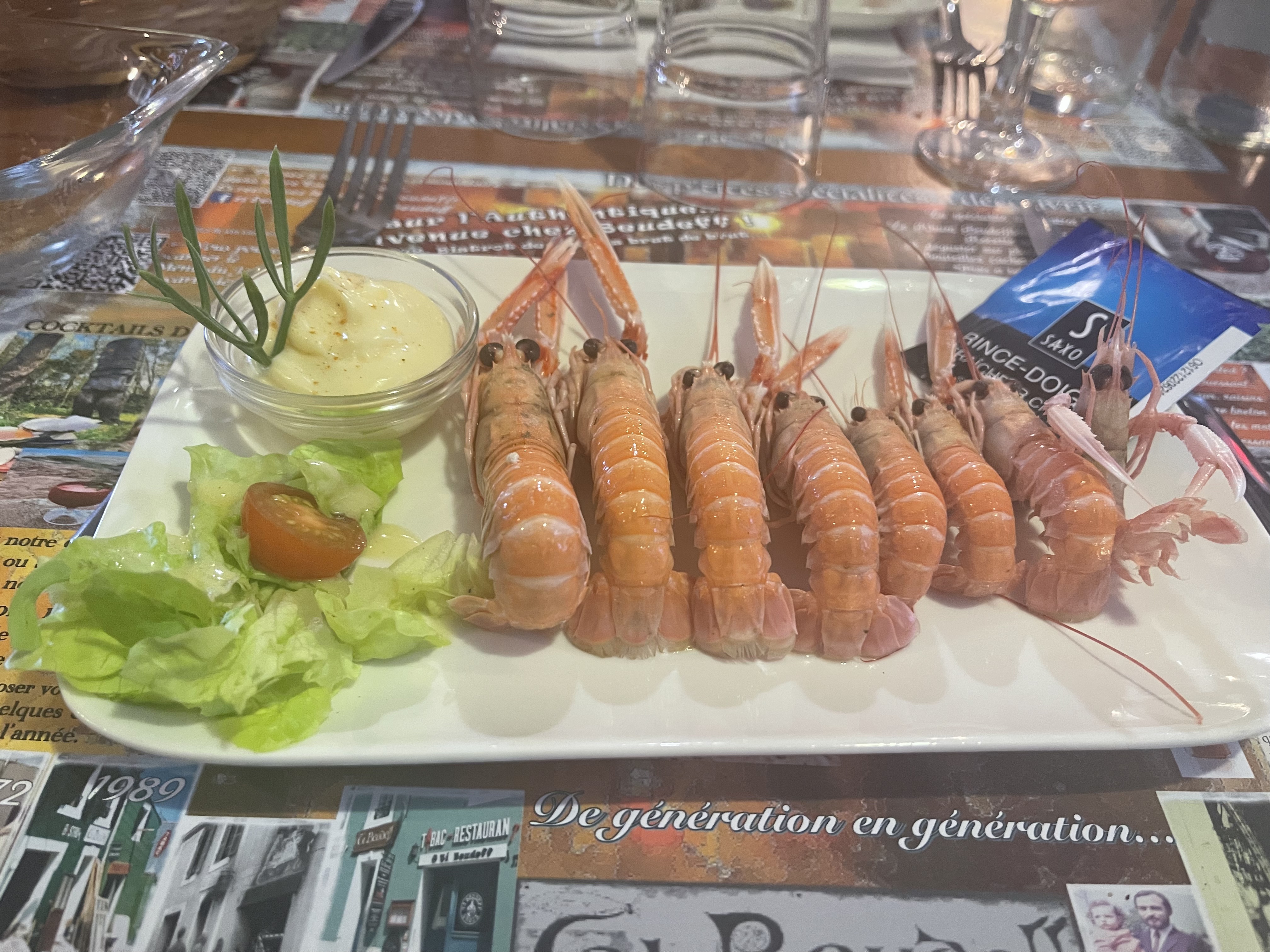 Langoustines accompagnées de pâtes fraîches ou frites. On voit que les langoustines sont fraîches. Le dessert de l'île de GROIX Chum Pot: on recherche la recette. Excellent ! Accueil comme à la maison , déco bistrot.