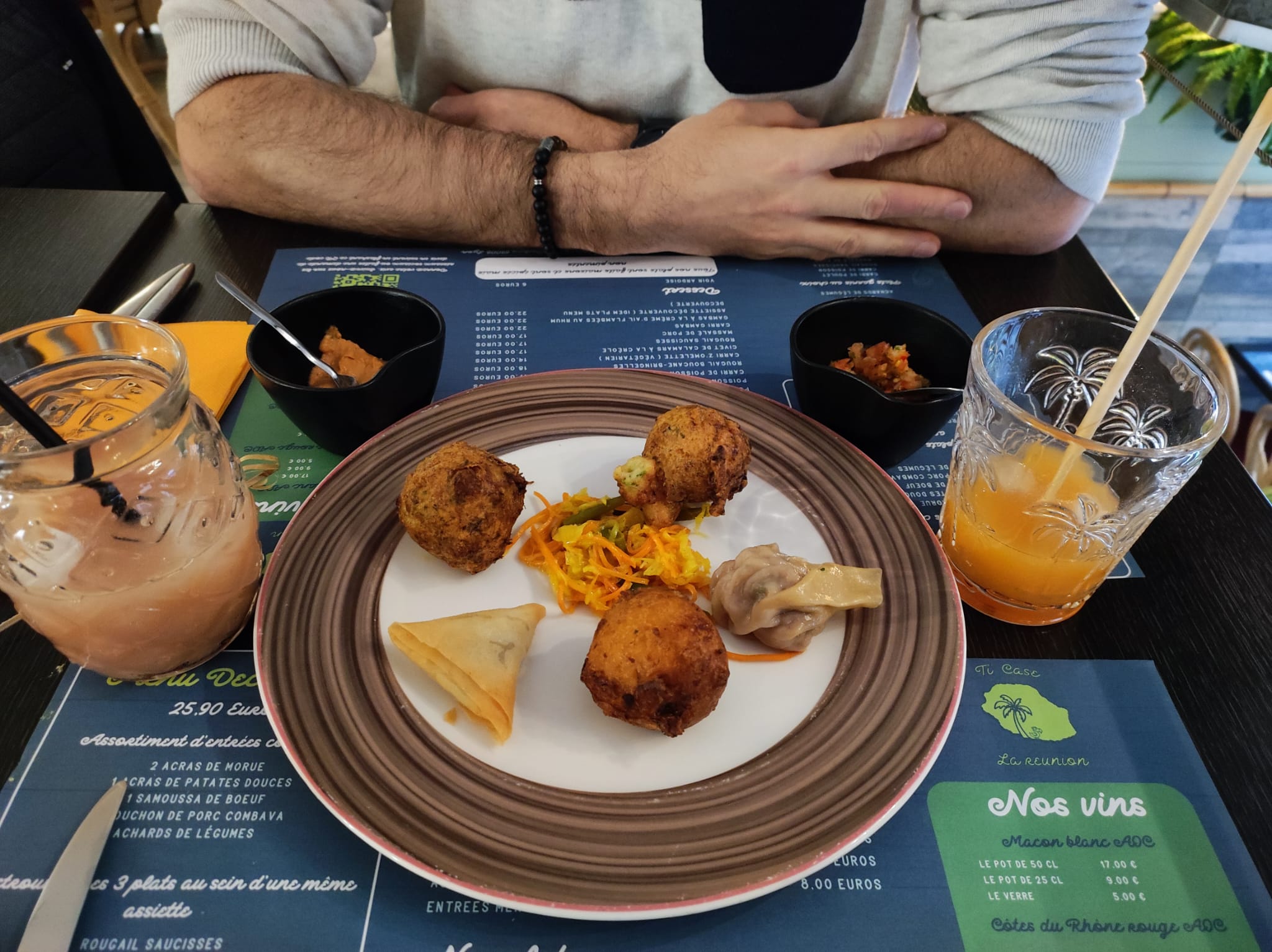 Les entrées (acras, samoussas, bouchons) excellentes et un très grand choix des rhums arrangés ! Je recommande !