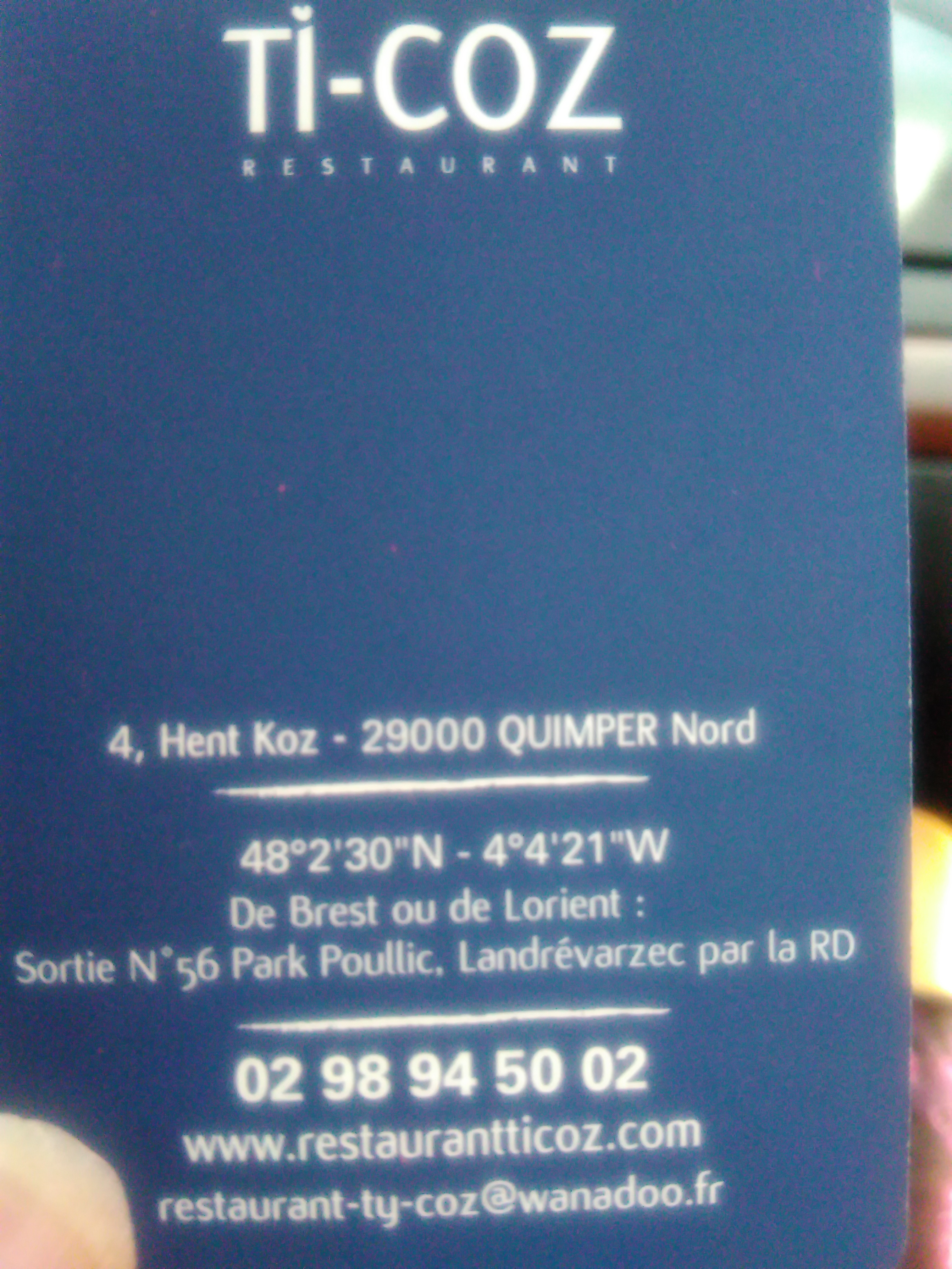 Bonjour, Invités par nos enfants, nous avons découvert Ti-Coz avec grands plaisirs ! Accueil remarquable, service très soigné, mets de choix et de très grandes qualités ! Nous sommes sentis très bien car la simplicité est de mise. Nous y retournerons sûrement 😉 Je vous conseille ce restaurant vivement, vous ne serez pas déçu. Cordialement.