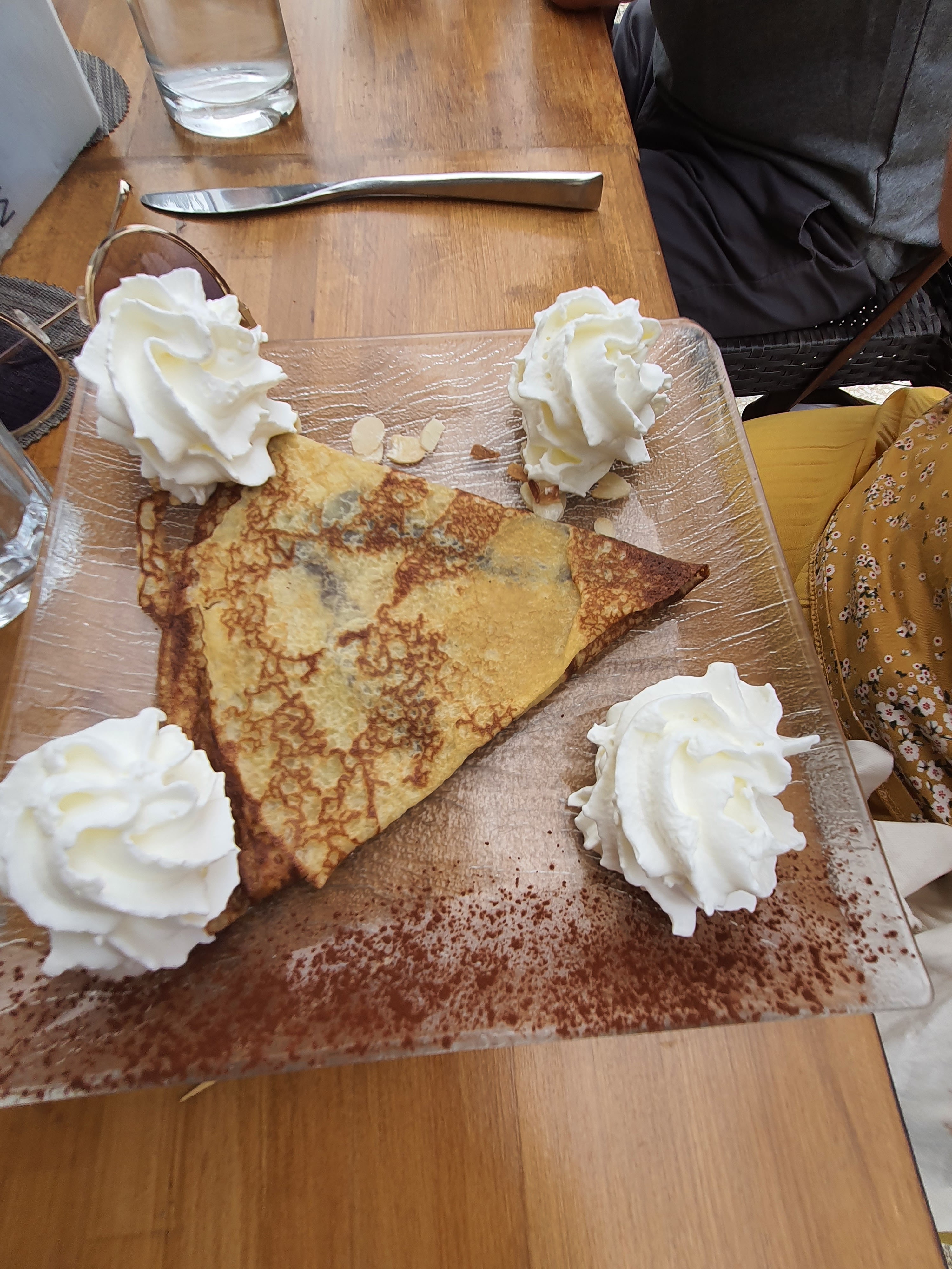 La veille au delà de 20h50 plus possible de dîner..ok Nous revenons .. dîner... plus de gambas ni de dorade ok je me rebat sur une viande rumsteck cuisson saignante...viande dure que nous signalons au serveur bien agréable.dit qu'il va faire remonter.. Puis je commande une crêpe crème fouettée et la ...trop déçu..crêpe très très sèche que je n'arrive pas a couper avec mon couteau ..ce n est malheureusement pas une crêpe du jour..jai même des doutes quand a la nature de cette crêpe qui pour moi est industrielle...crème fouettée qui n'est nul autre que de la crème en bombe.....je signale de retour que ma crêpe est très dure....au serveur qui va faire remonter l'information... Ok...🤔🤔 Très déçue