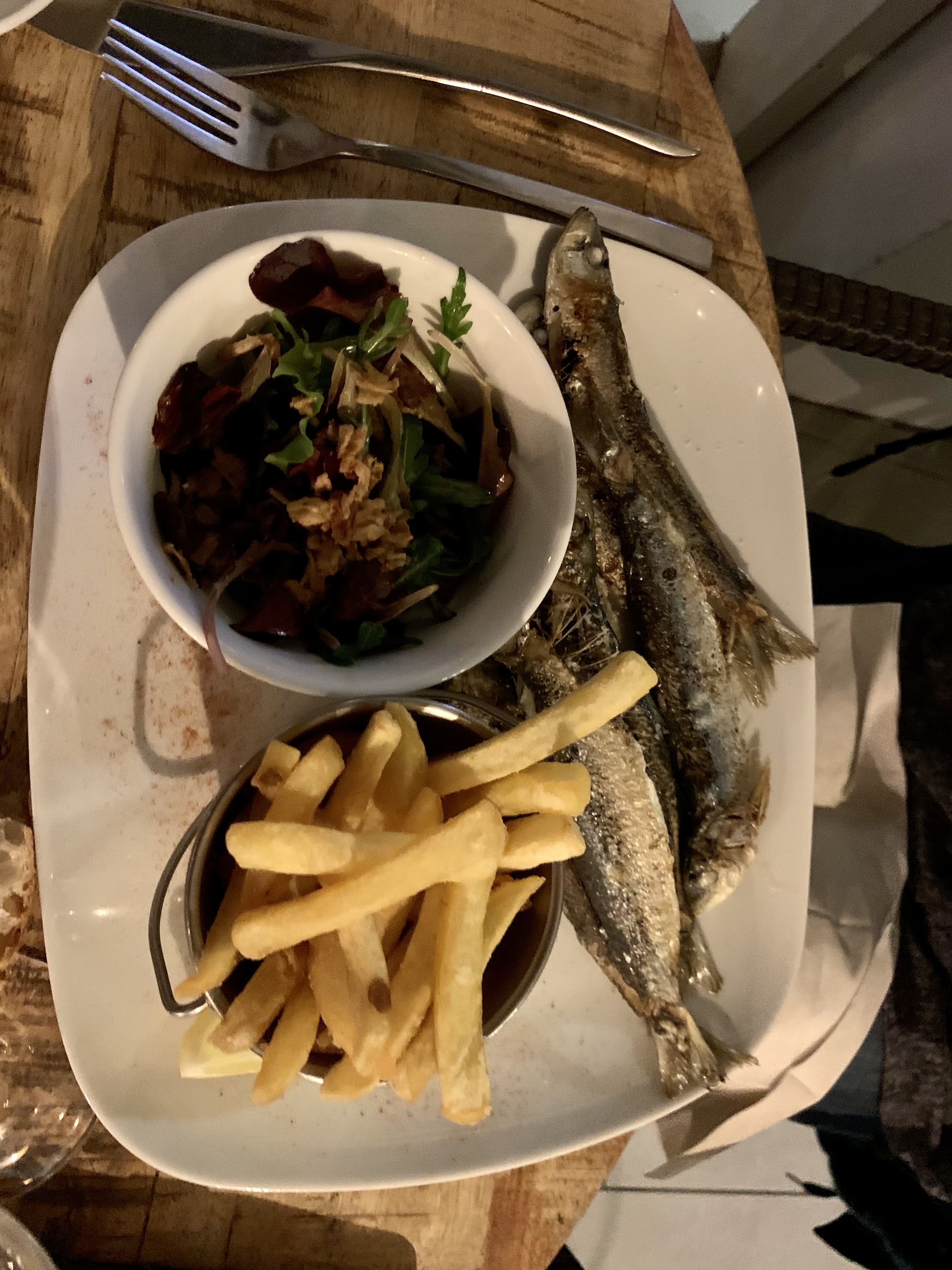 Avec mon mari, nous avons pris en entrée accra de morue (moi) qui était très bonne et légèrement relevé (juste ce qu'il faut) avec possibilité de rajouter du piment très fort (dans un bol à part). Mon mari a pris la persillade de couteaux qui lui a trouvé un peu fade manquer de l'huile et du persil pozr donner d'avantage de goût. En plat, nous avons pris des encornets (moi) qui était bonne en goût niveau ail et persil mais j'ai du rajouter un peu de sel car vraiment pas de sel (je sel très peu en général). Mon mari a pris les tagliatelles aux gambas et l'huilede truffe. Il a moyennement apprécié car les pâtes étaient neutre (elles auraient mérité d'être sautée dans la persillade pour d'avantage de goût) et n'a absolument pas sentie la truffe (pourtant goût très prononcé en général). En dessert, nous avons pris mousse au chocolat avec copeaux de coco qui était très bonne et crêpe à la confiture (pas faite minute ou acheté 🤔) cela dit on ne sentait pas le goût du fait maison. Service impeccable et rapide (hors saison). Restaurant cosy.