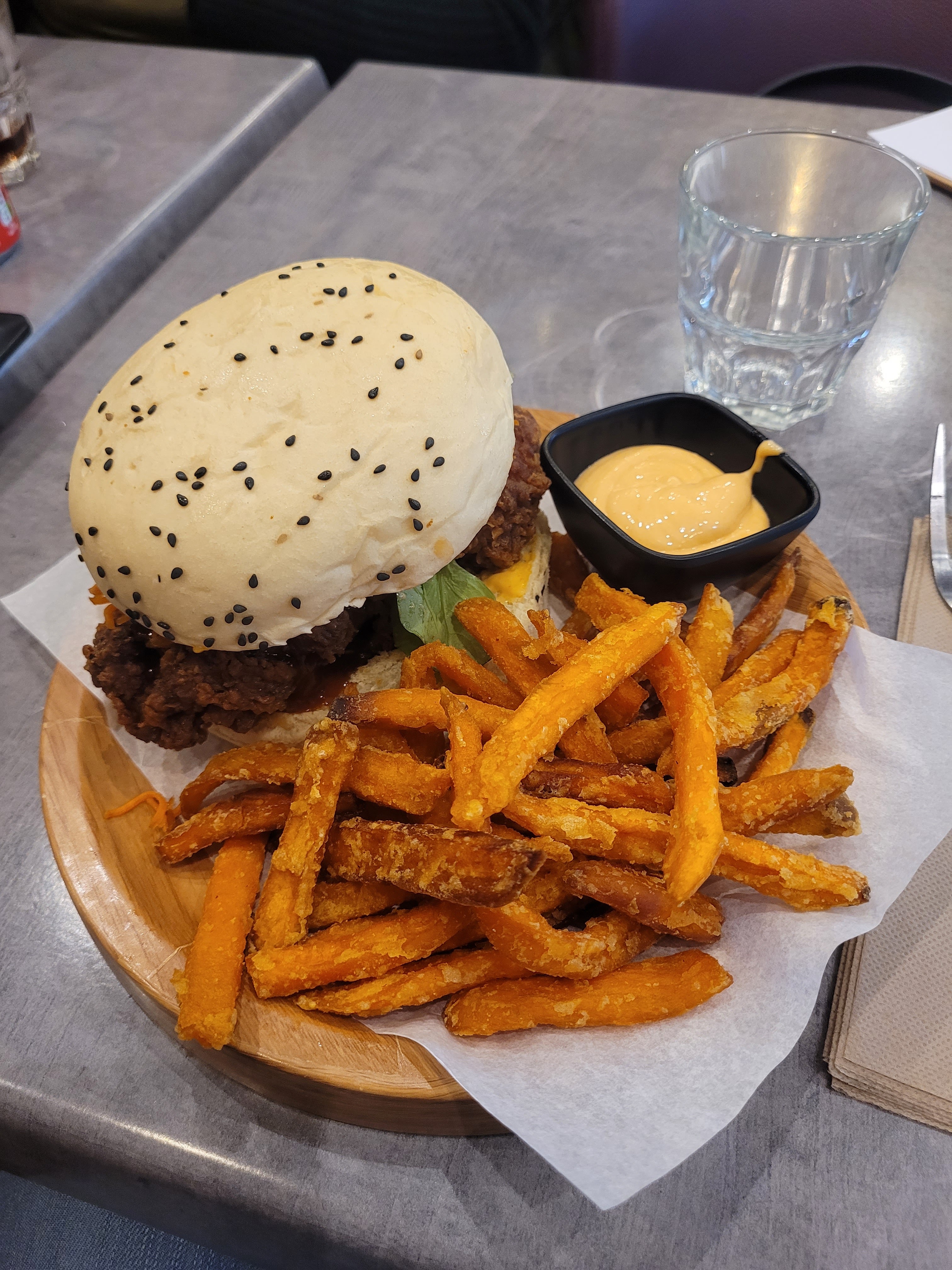 Accueil chaleureux, les patrons sont super sympas ! Je recommande VIVEMENT le taco asiatique poulet satay en entrée c'est un délice... Je me suis orienté par la suite vers les sweet and spicy fried chicken accompagnés de frites de patate douce et je n'ai pas été déçu ! C'est frais et fait maison.