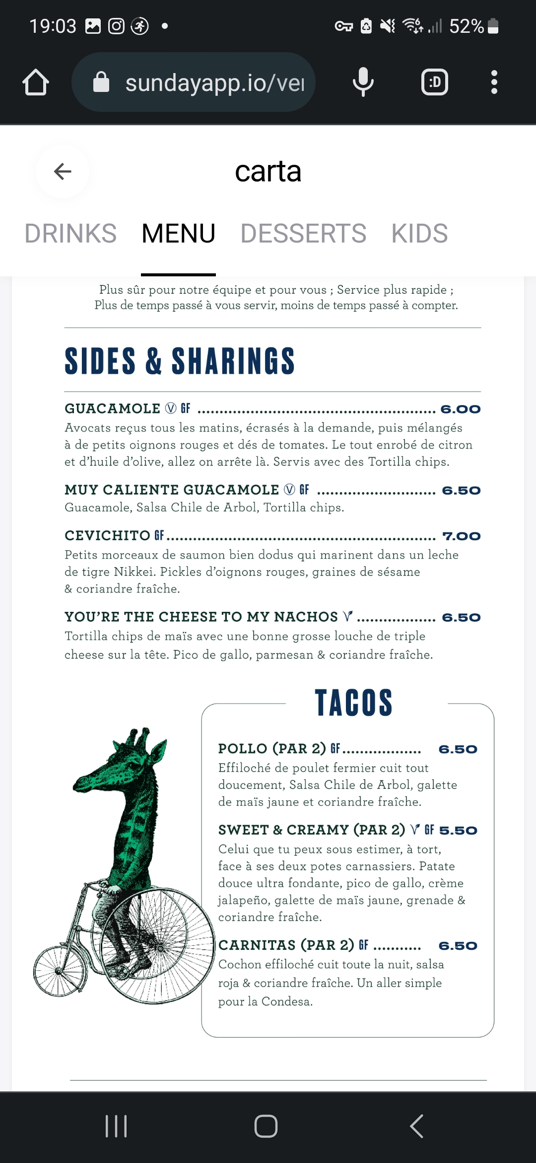 Les plats étaient très savoureux, quesadillas et mini tacos, un peu déçu sur les cocktails, étant une grande fan de pisco j’étais ravie d’en trouver à la carte mais celui-ci était beaucoup trop fort et donc pas très savoureux… Repas très agréable malgré ce petit hic à 9€ :/