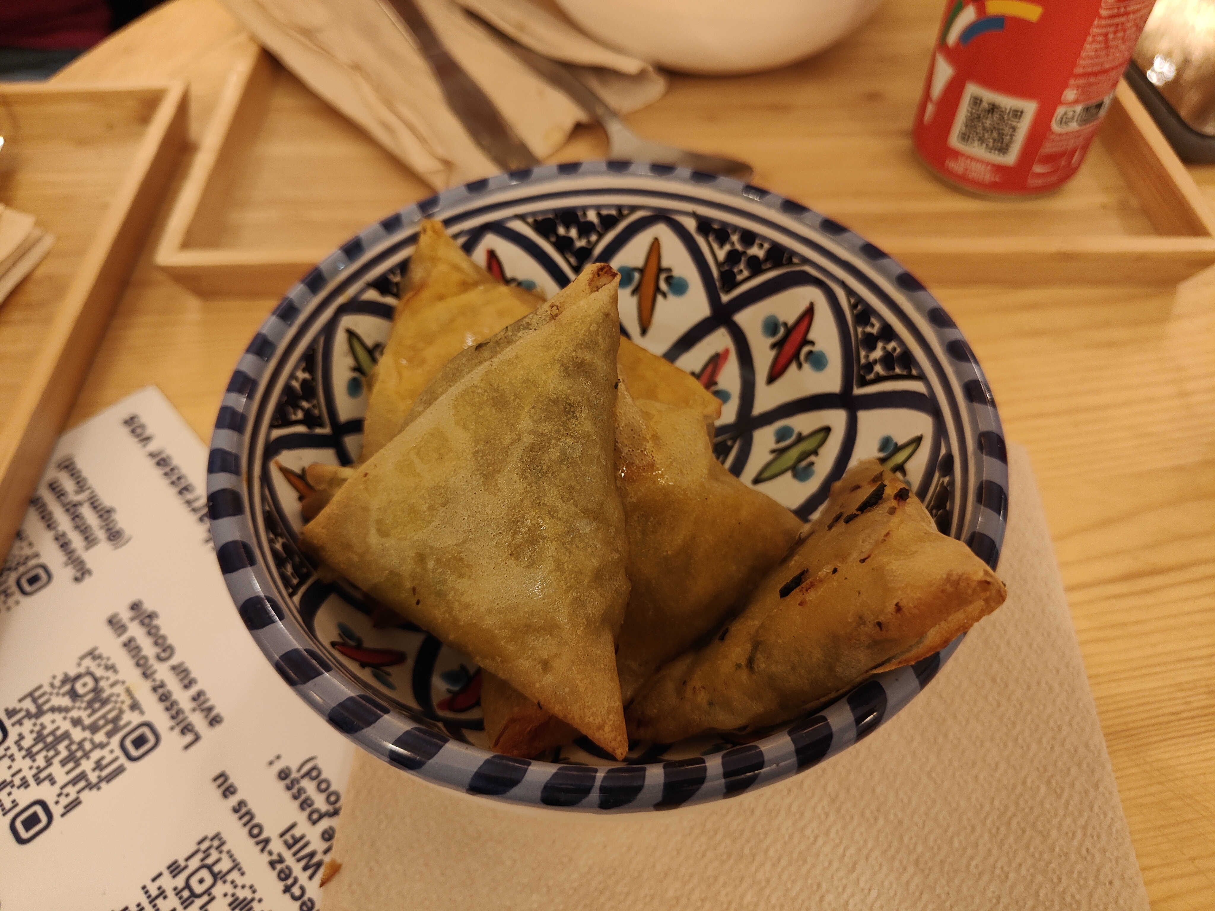 Tajine kefta avec peu de sauce ,une brick pour 2 euros sèche. Plats fades. Dommage, je m'attendais à quand même mieux pour 15 euros de repas. Jolie décoration et le garçon qui prenait les commandes très bien.