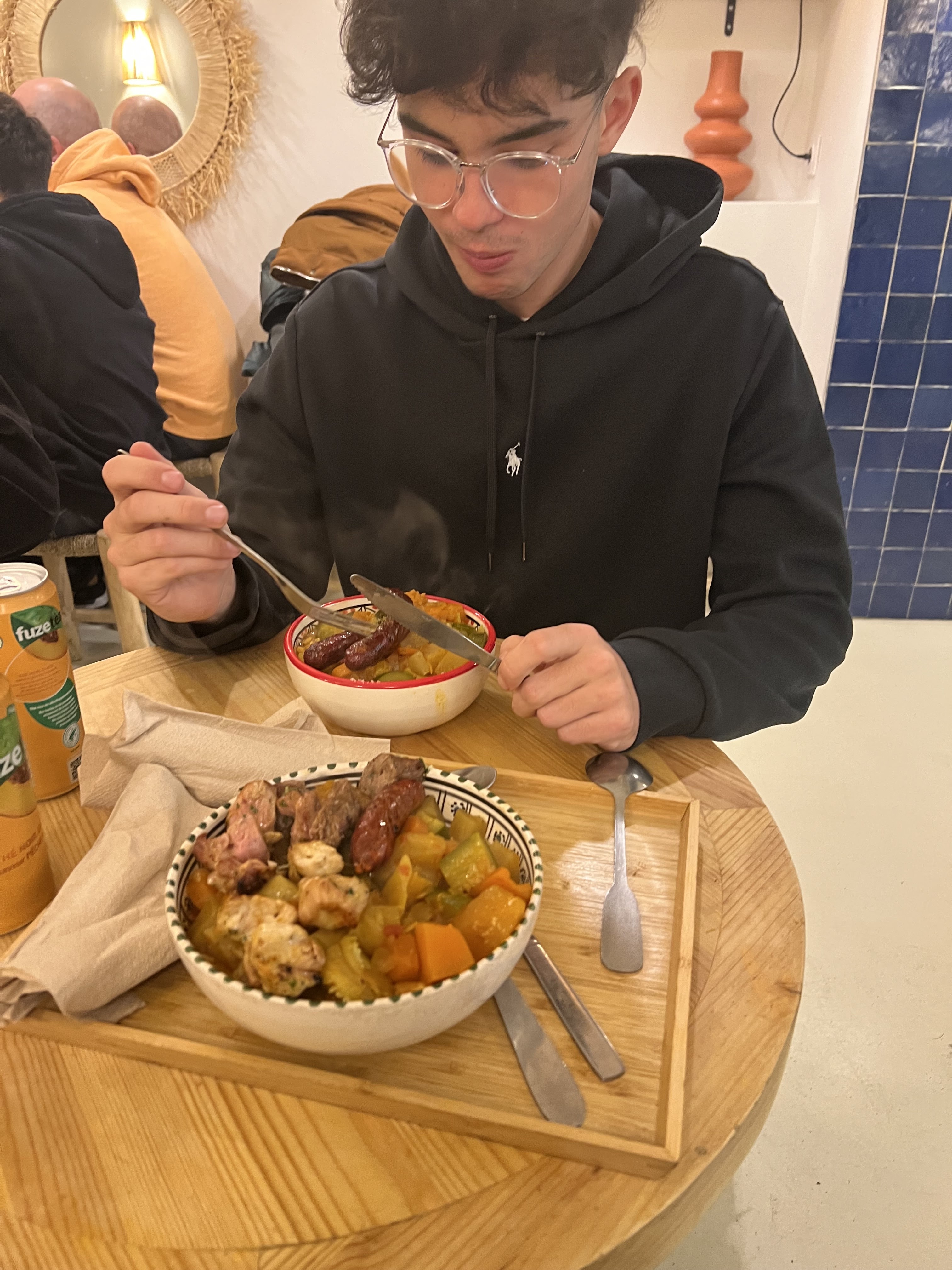 C'était juste excellent ! Je suis pas fan de tout ce qui est couscous et tout d'habitude mais là j'ai trouvé ça excellent ! J'ai pris une tajine à la kefta (boulettes de boeuf) aux oeufs et mon copain un couscous avec brochettes poulet, c'était vraiment trop bon ! Les prix sont aussi très corrects, environ 12€ le plat. Les portions amplement suffisantes. Je recommande et je reviendrais !