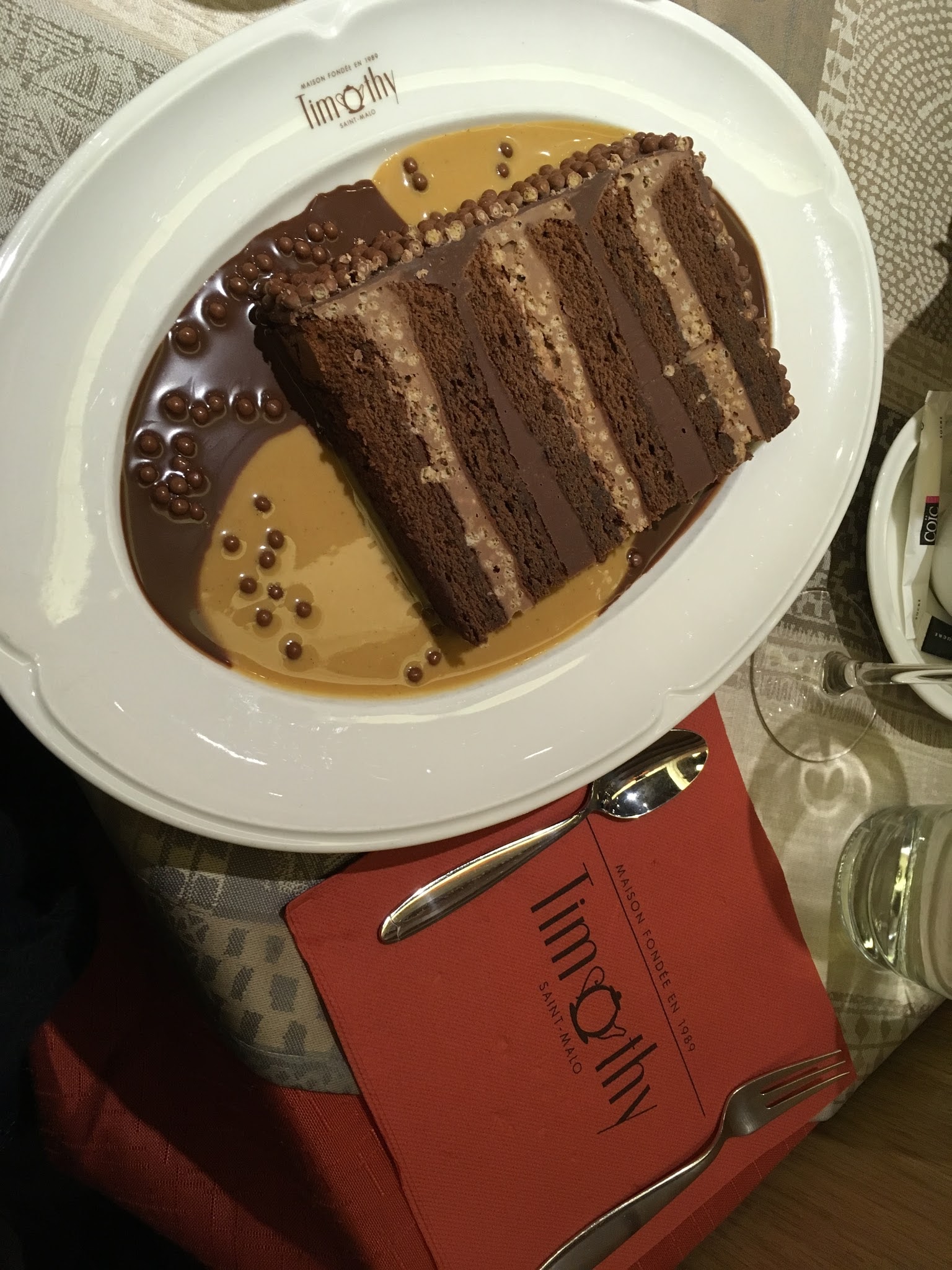 Quel salon de thé/restaurant surprenant ! Vous retrouverez des plats pour déjeuner et/ou dîner ainsi qu'une large sélection de boissons et gourmandises. La signature de Timothy : ses gâteaux incroyables ! Les parts sont gigantesques et vraiment délicieuses. J'ai rarement mangé un gâteau aussi bon. Celui sur la photo est au chocolat Suchard, un véritable délice. Le prix peut paraître légèrement excessif mais le cadre ainsi que le service et la qualité des plats proposés le justifie. N'hésitez pas à découvrir cette pépite de Saint-Malo intra-muros ! PS : carte bancaire acceptée au dessus de 5€ de commande.