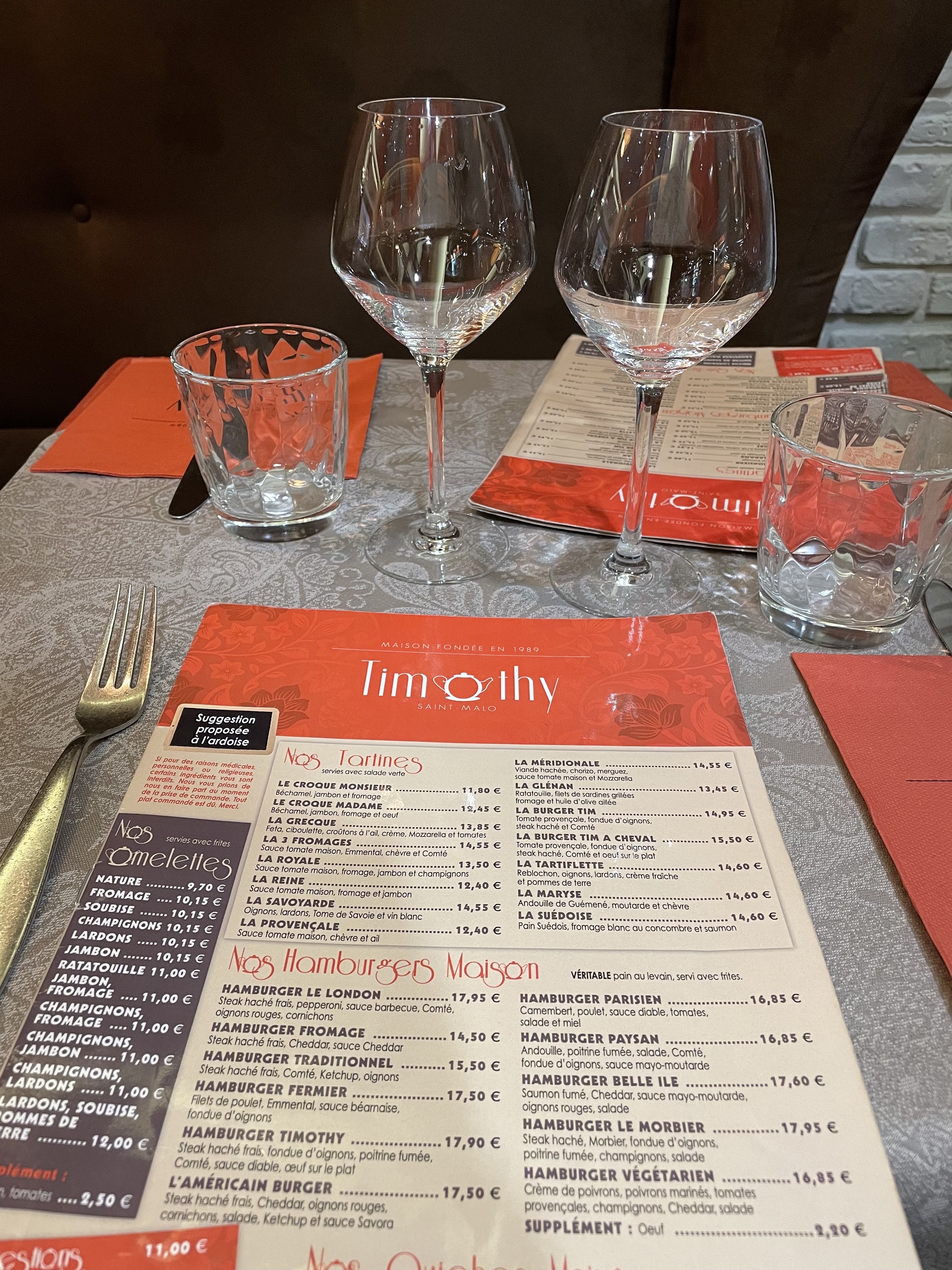 Quatrième année que nous allons mangé au Timothy pendant le week-end de l’ascension, et toujours aussi satisfaite. Cuisine et plat, rien à redire. Personnel accueillant et chaleureux. Toujours prêt à trouver une solution pour être bien installé (fauteuil roulant+pousette avec nous)