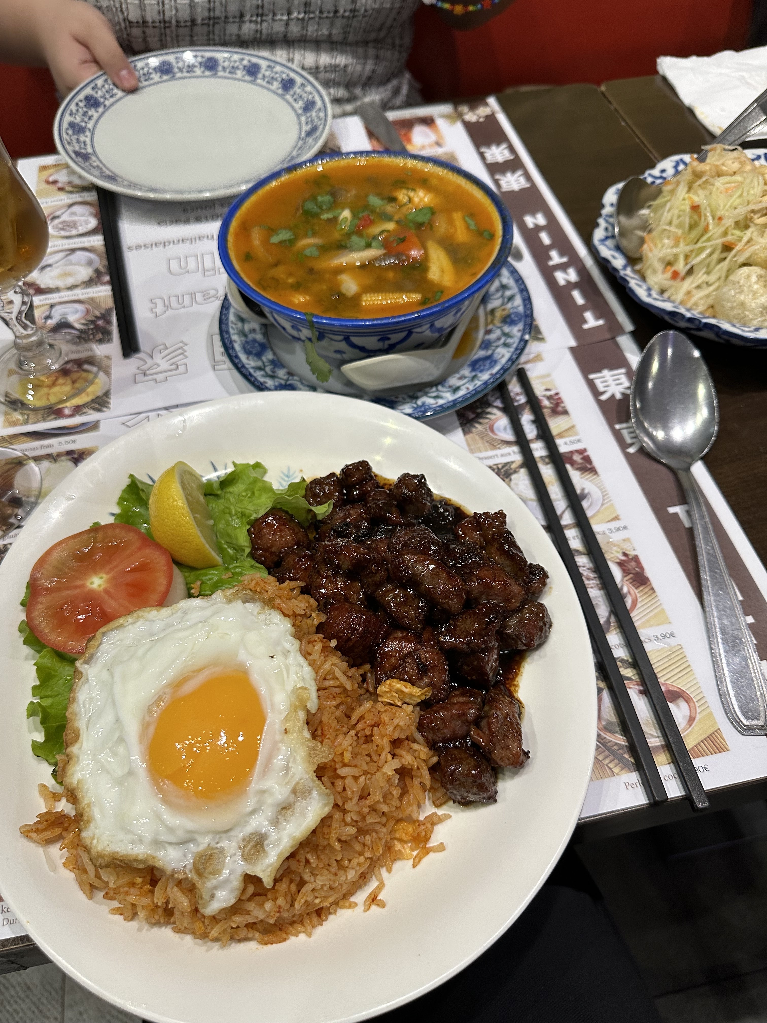 Les nouilles et le riz frit étaient corrects mais la viande... tout simplement horrible. Pas le goût lui-même, mais la consistance ressemblait à du caoutchouc ou à un tapis de yoga. Nous avons mangé en groupe, tout le monde a vécu la même expérience. La seule viande comestible était le poulet rôti, mais même cela était à peine agréable. Je ne le recommanderais pas à 100%.
