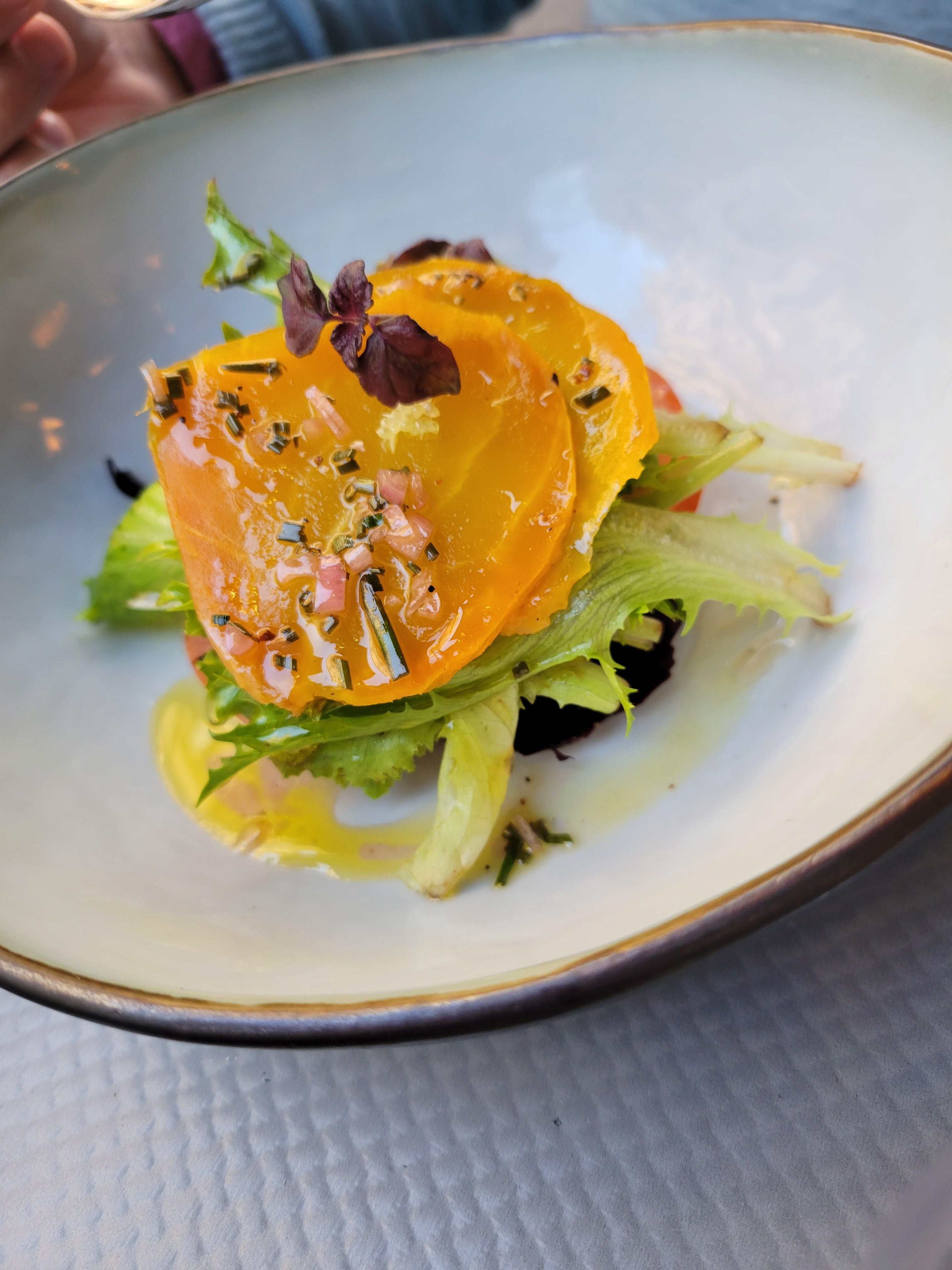 Exceptionnel. Serveur et chef, nous sommes tous les deux exceptionnels. Serveur tellement sympathique. Grand vin. Superbe plat de patates douces avec oignons marinés, betteraves et pommes de terre frites. Miam.
