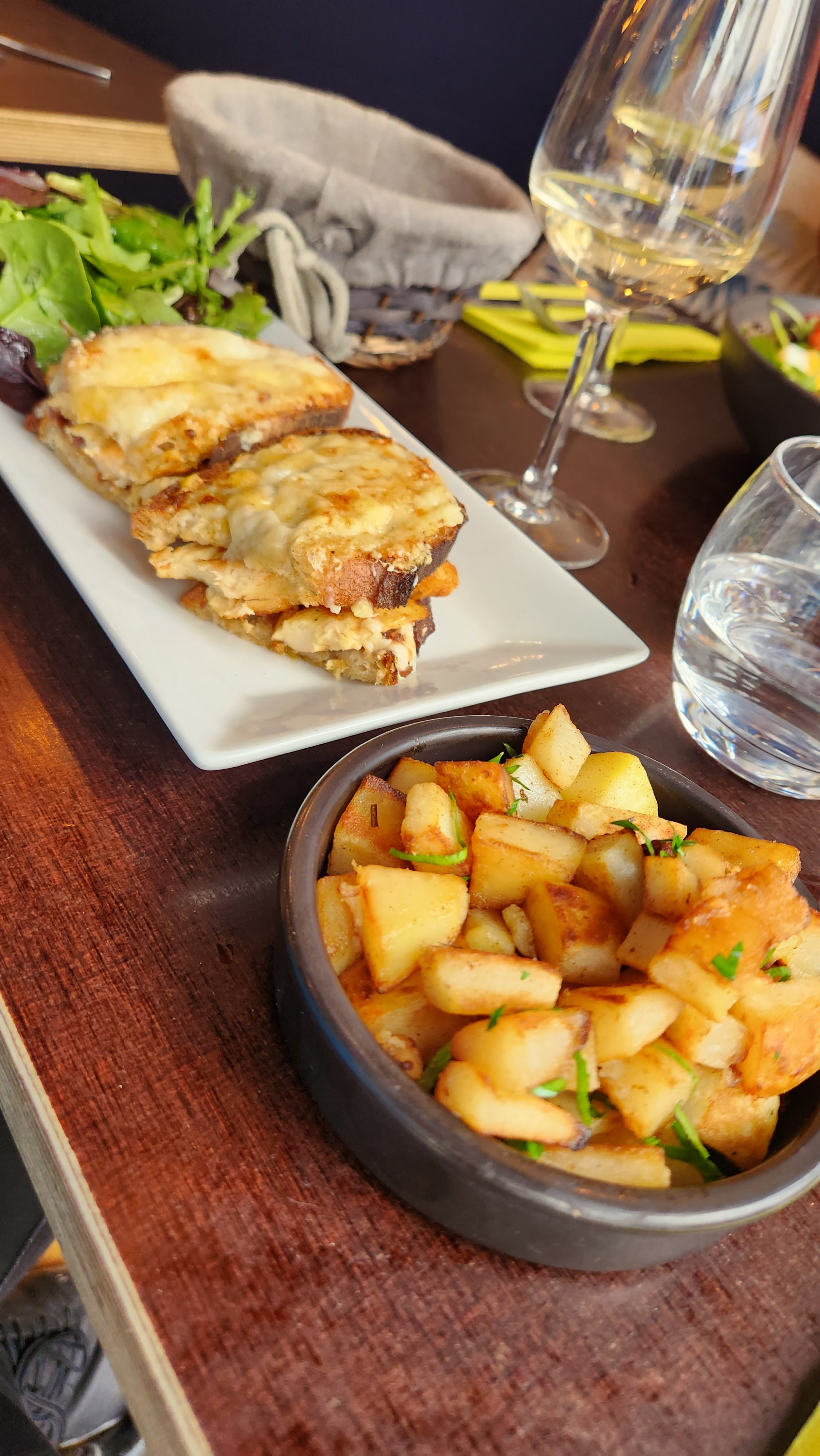 Personnel très agréable. Vin délicieux , salades différentes très bonnes, croque monsieur très goûteux , moules avec pommes de terre sautées excellentes. Très bon moment passé en famille, franco-allemande.