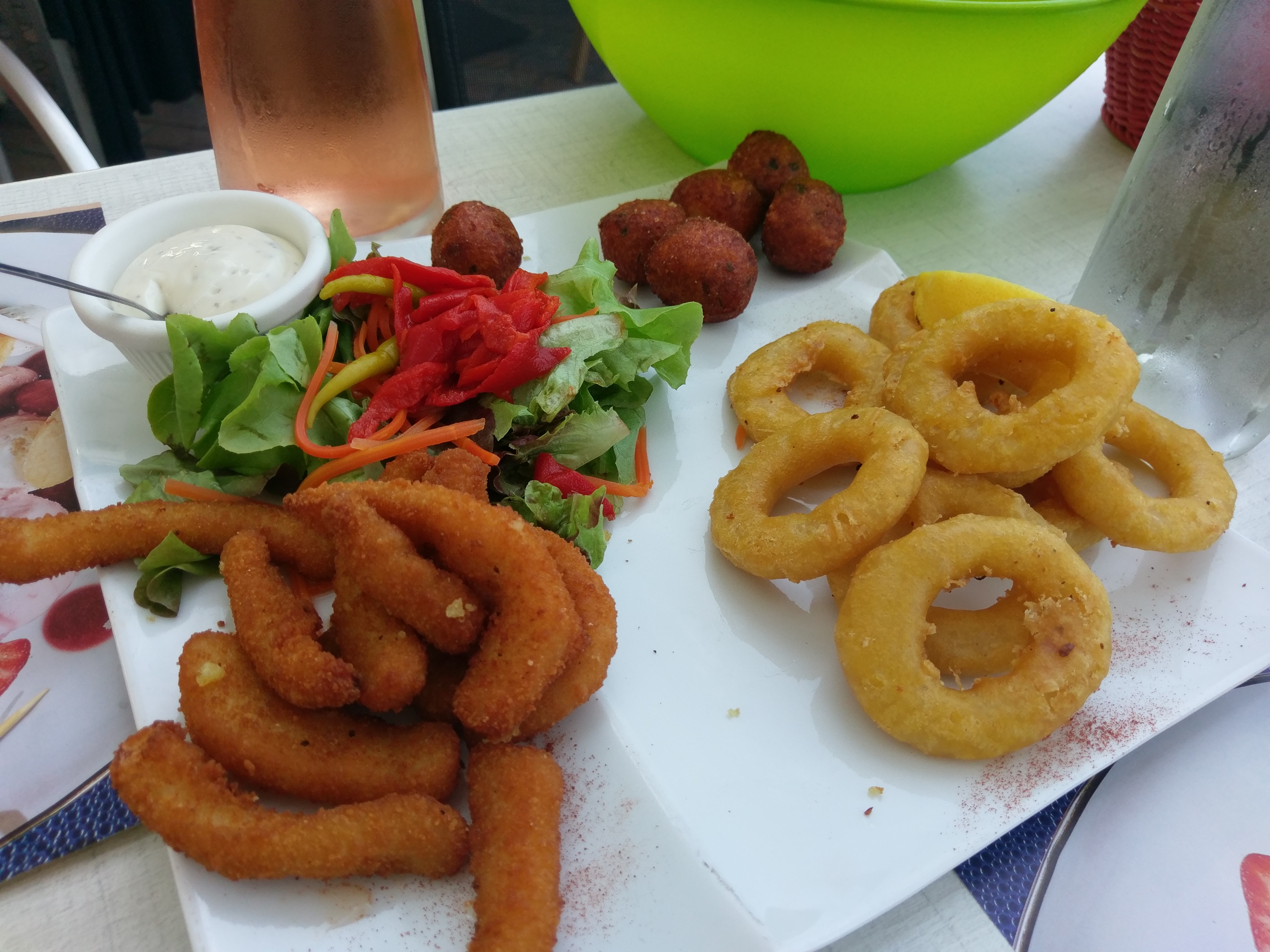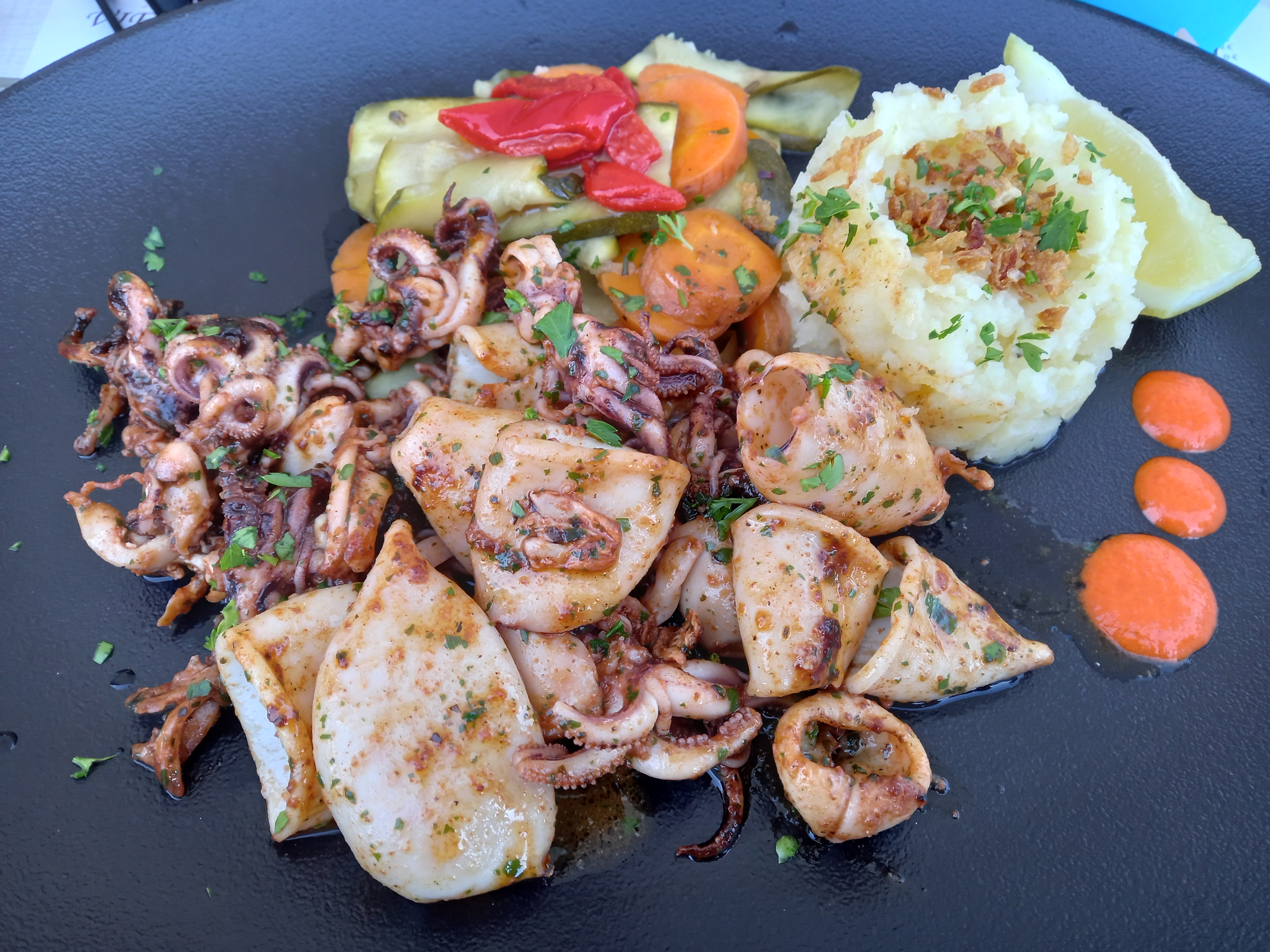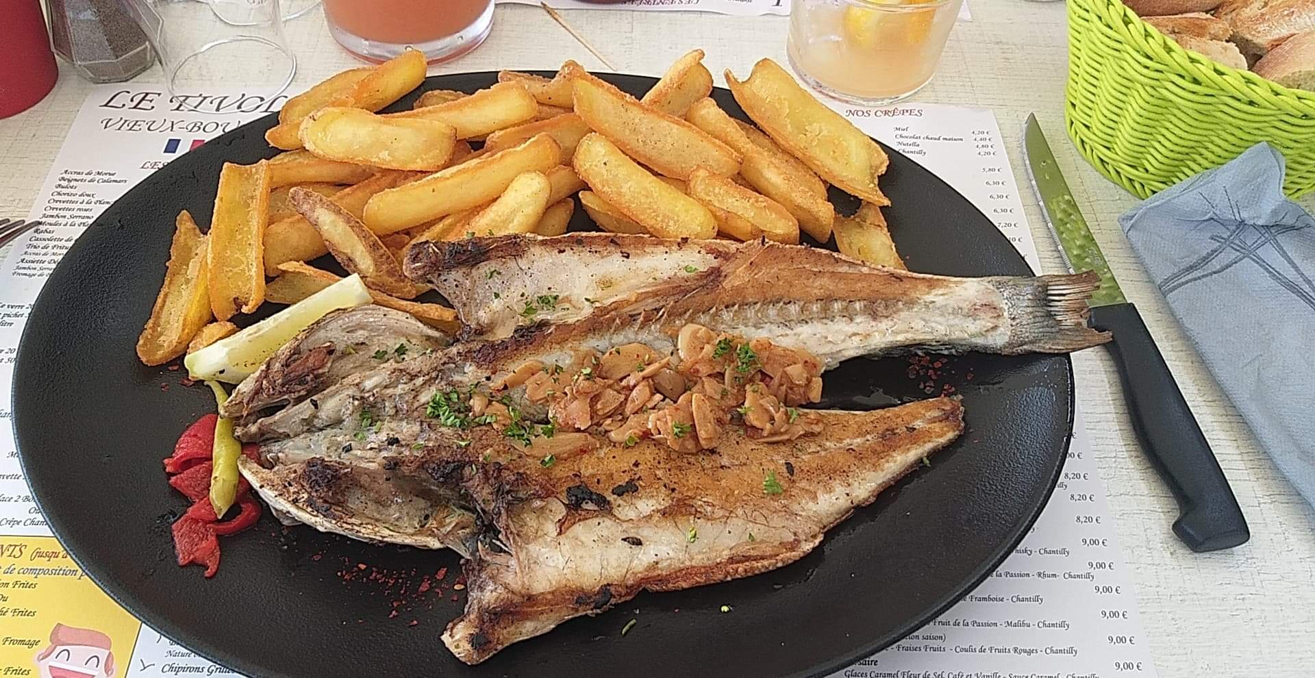 Chipirons délicieux pour l'apéro avec un punch correctement dosé en rhum. Bar et daurade à l'espagnole très bien préparés et cuits avec de la salade des tagliatelles à la tomate. Bonne galette de Pont-Aven avec viande hachée et oeuf.