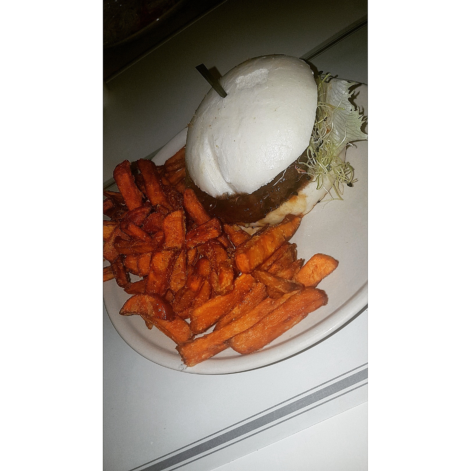 Burger asiatique appelé bao burger (Brioche chinoise cuite à la vapeur) servi avec des frites de Patates douces. Un vrai délice ! Environ 13 euros.