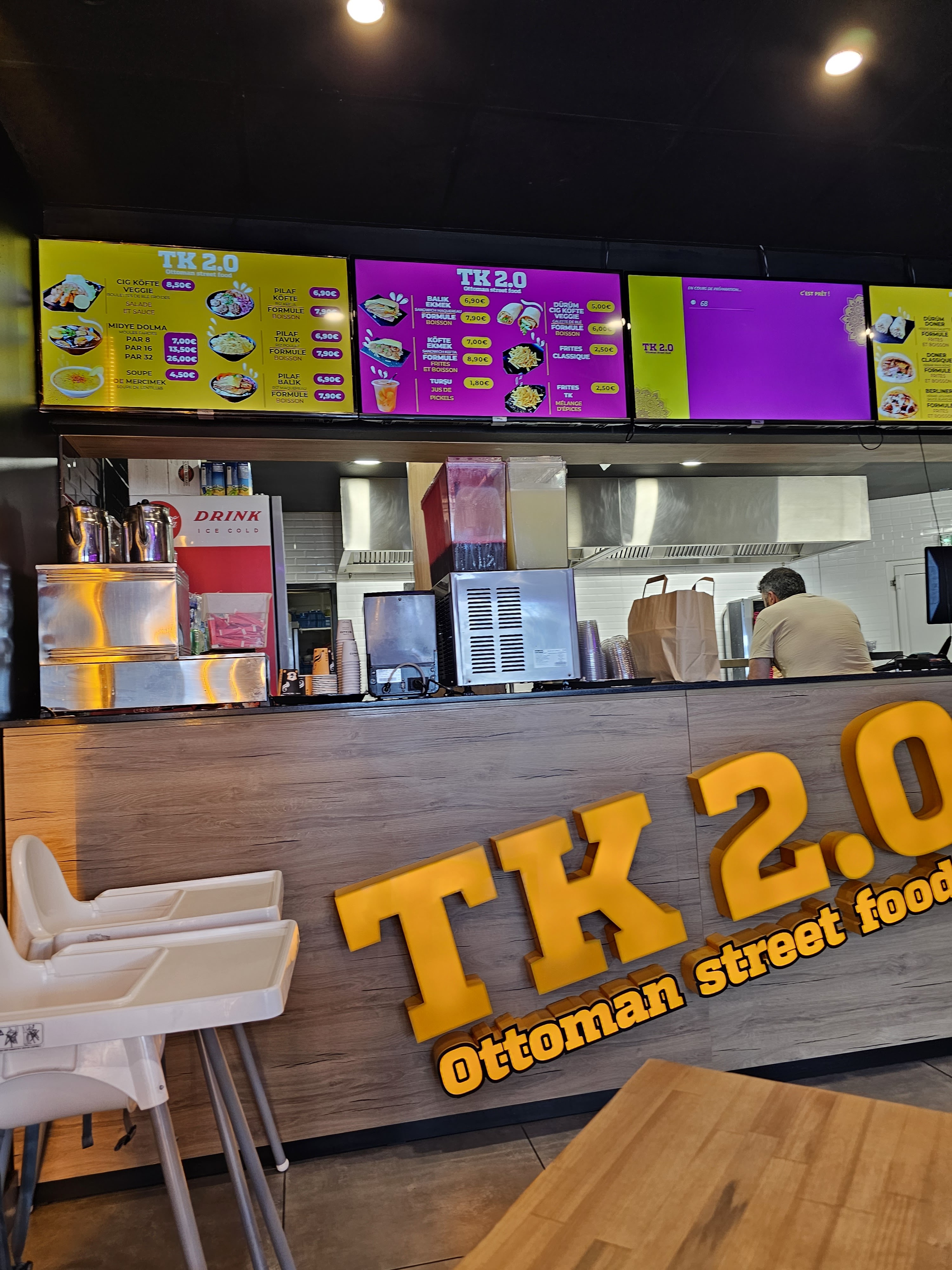 Super accueil, j'ai gouté tous les menus avant de donner mon avis. C'est une tuerie, beaucoup de choix moules farcies au riz et sandwich au poisson comme dans le Bosphore qui change la donne, kebab délicieux surtout le berliner, kefta fait maison succulent que je conseil de gouter . On peut choisir nos menus sur des bornes, l'intérieur propre et moderne, bravo TK vous méritez bien le 2.0