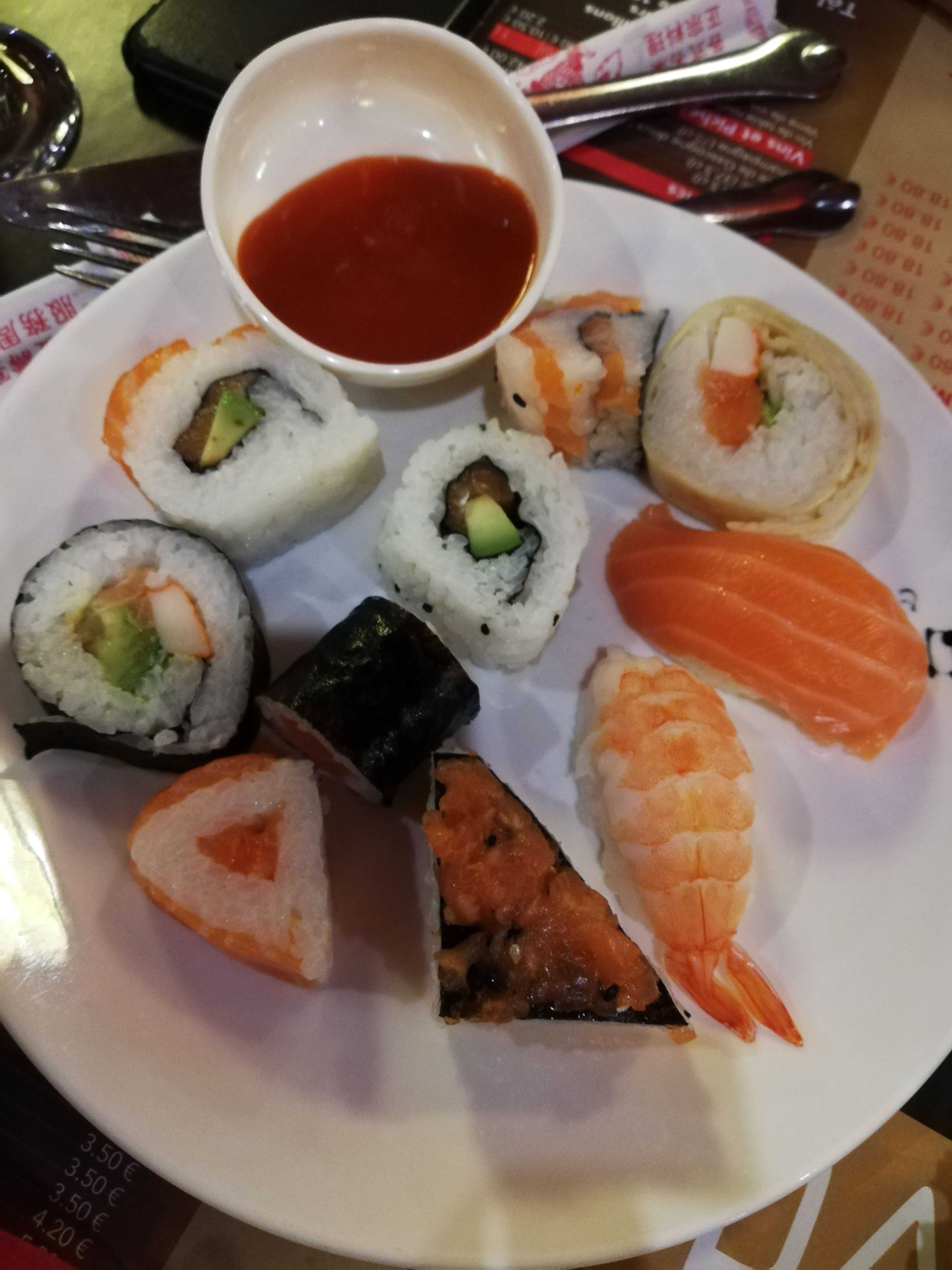 -Trop bruyant à mon goût (placé trop près du parc à jeu pour les enfants), brouhaha de cantine (on ne sentant plus parlé). -Repas à volonté pour 18€80 tous les soirs. -1 seul WOK et une seul grille pour tout le resto, cela fait un peu juste pendant le coup de feu. -Pas de saké offert. -J'ai essayé, mais je n'est pas vraiment apprécié, j'irai ailleurs la prochaine fois.