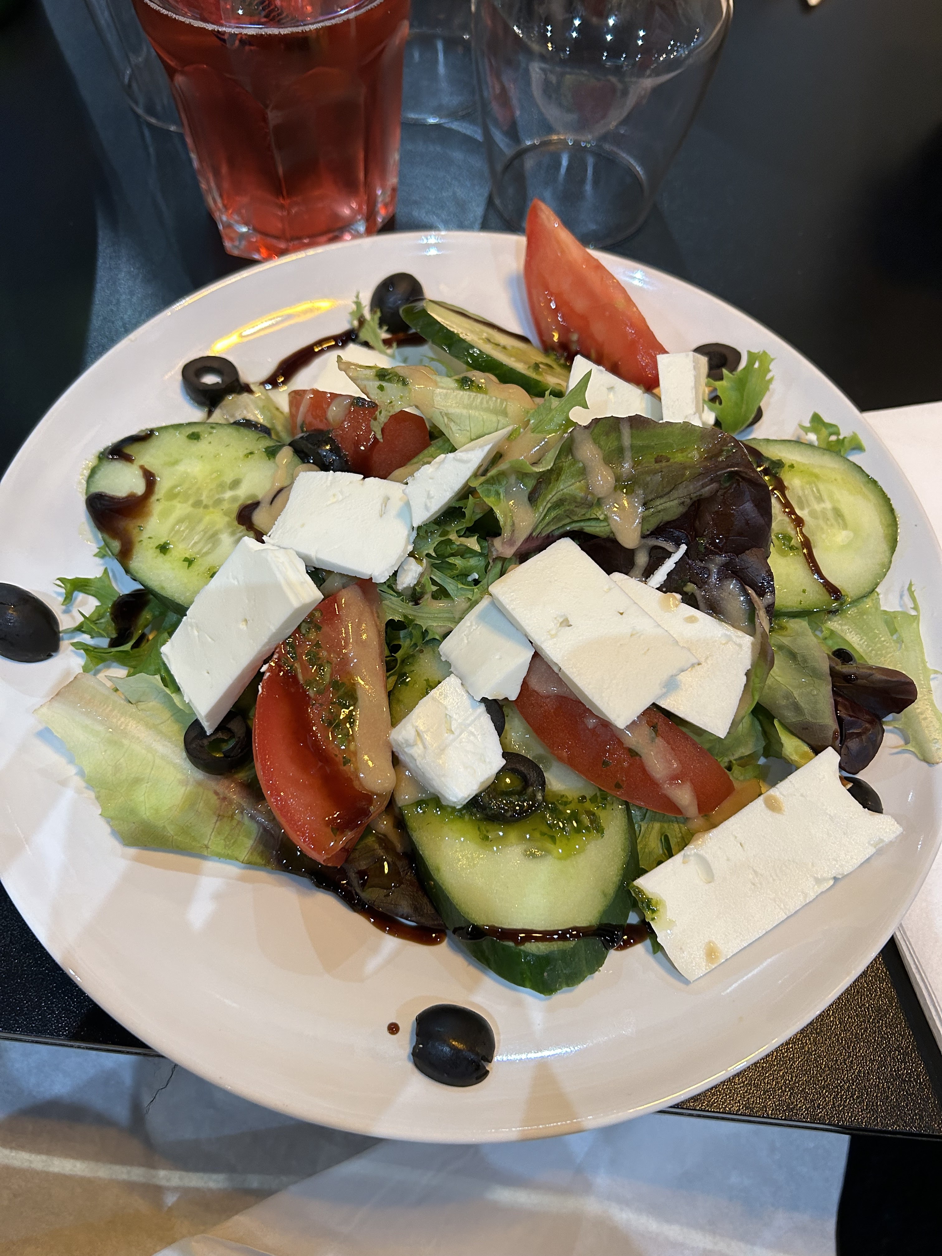 Une soi disant salade greque 3 feuilles de salade 1 œuf dur 1 tomate 3 bout de fêta 14 euros !!!!!! Présentation !!!!