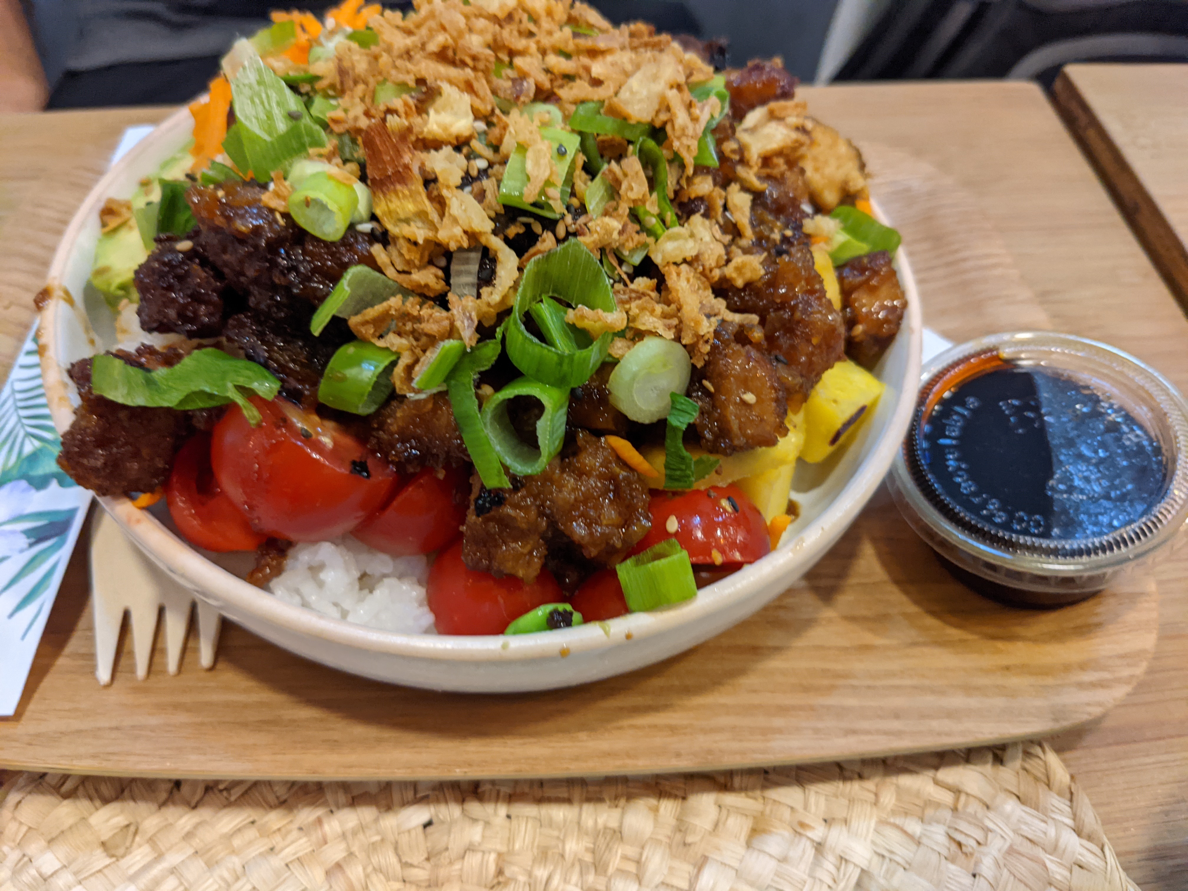 Je ne pourrais pas être plus heureux avec mon poké bowl végétalien. Délicieux riz à sushi, tofu soyeux, légumes frais, une combinaison de saveurs vraiment délicieuse, dont les graines de grenade, la mangue et l'avocat. Tout semblait frais et léger mais c'était quand même très copieux. Je pense que le prix était très bon, surtout compte tenu de la qualité des ingrédients. L'emballage était certes légèrement endommagé et fuyait et avait été enveloppé dans du plastique, mais l'emballage reste un bon point dans l'ensemble car le bol était en carton et la fourchette en bambou ; assez écologique. Je recommanderais certainement ce restaurant aux végétaliens et à tous ceux qui aiment la délicieuse cuisine saine.