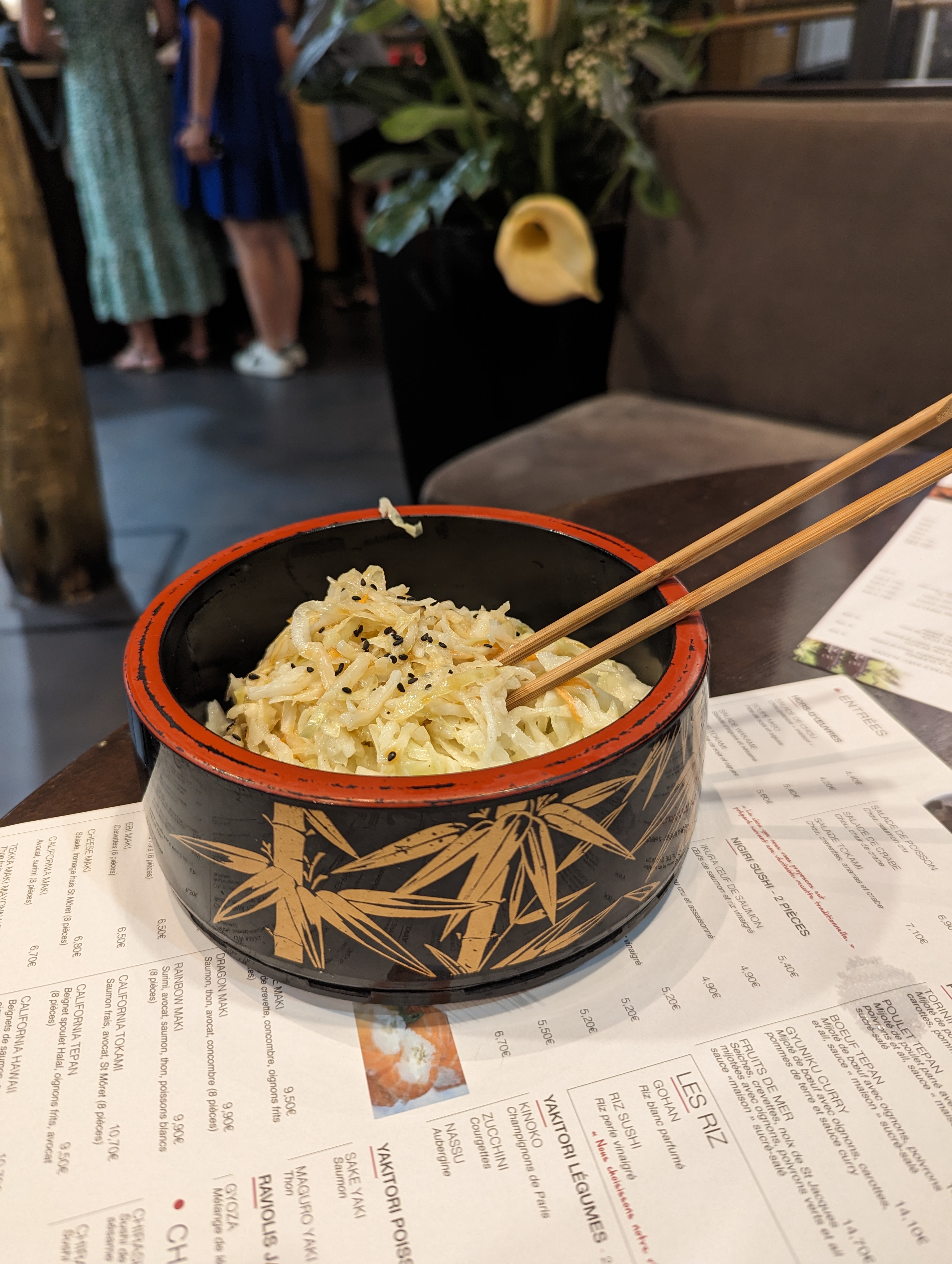 La meilleur salade de chou de Toulouse, un patron super sympa au petit soin des employer a 300% J'ai eu l occasion d y mangé plusieurs fois, une fois au comptoir ce qui offre la possibilité de manger tout en observant le savoir faire, de ma soupe miso excellente au passage au brochette,maki,sushis.. jai adoré puis une autre fois un peu plus intimiste en salle bien placer vraiment je recommande cette endroit cest chaleureux , convivial, et surtout très bo n amateur de cuisine japonaise, cest un régal !!!