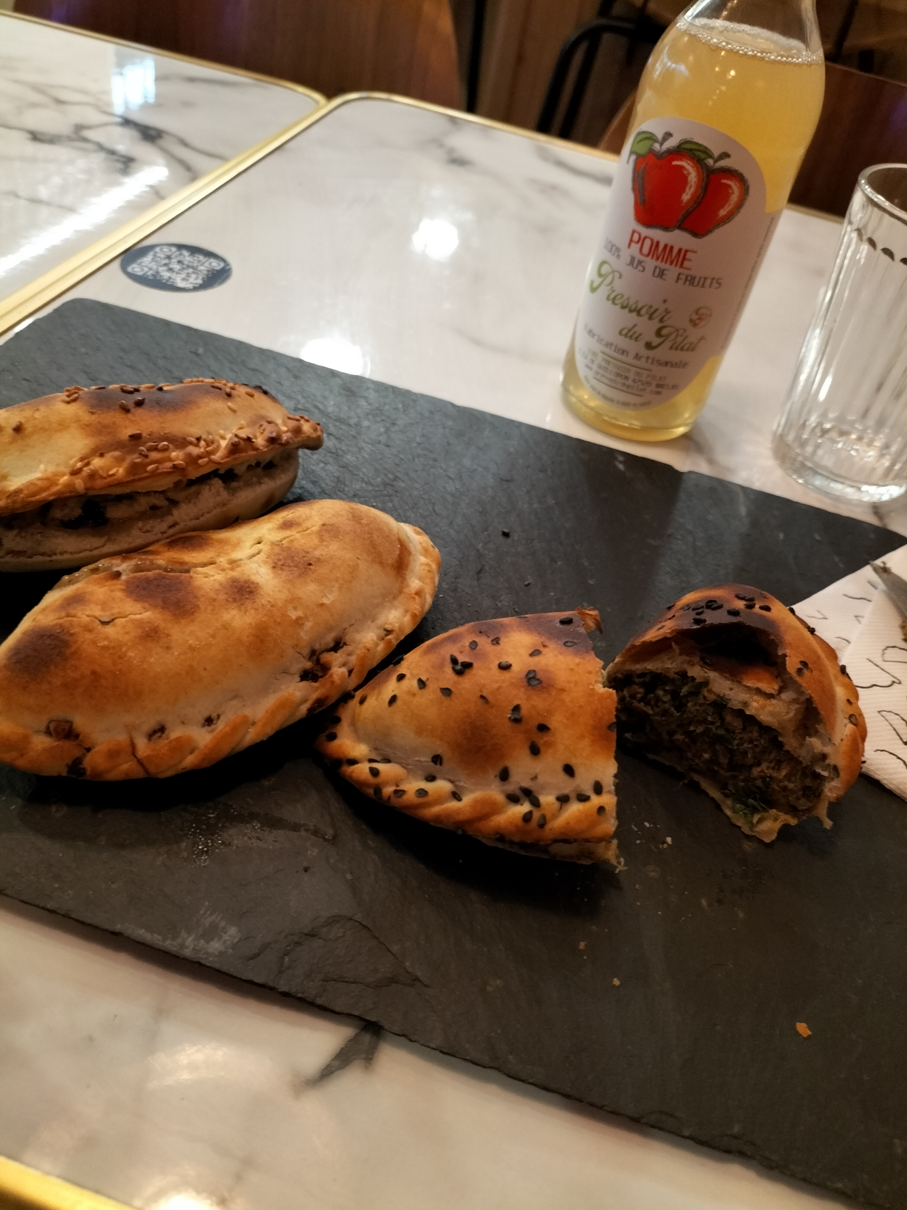 J'avais commandé en livraison alors je ne vais pas parler du restaurant en lui-même vu que je ne sais pas à quoi il ressemble. Je ne note donc pas non plus l'ambiance ni le service Les empanadas sont vraiment vraiment délicieux. Je conseille le fermier et le celle au jambon-fromage qui pour moi sont les meilleures. Y'a une version sucrée à la pomme-canelle qui est bonne également. Vous avez une version menue avec 3 empanadas ou encore si vous voulez goûter le plus d'empanadas vous avez des box allant de 4 à 12 empanadas. Avec mon amie on s'est partagée une boîte de 8 avec le fermier, jambon fromage, curry et burger et on s'est régalé