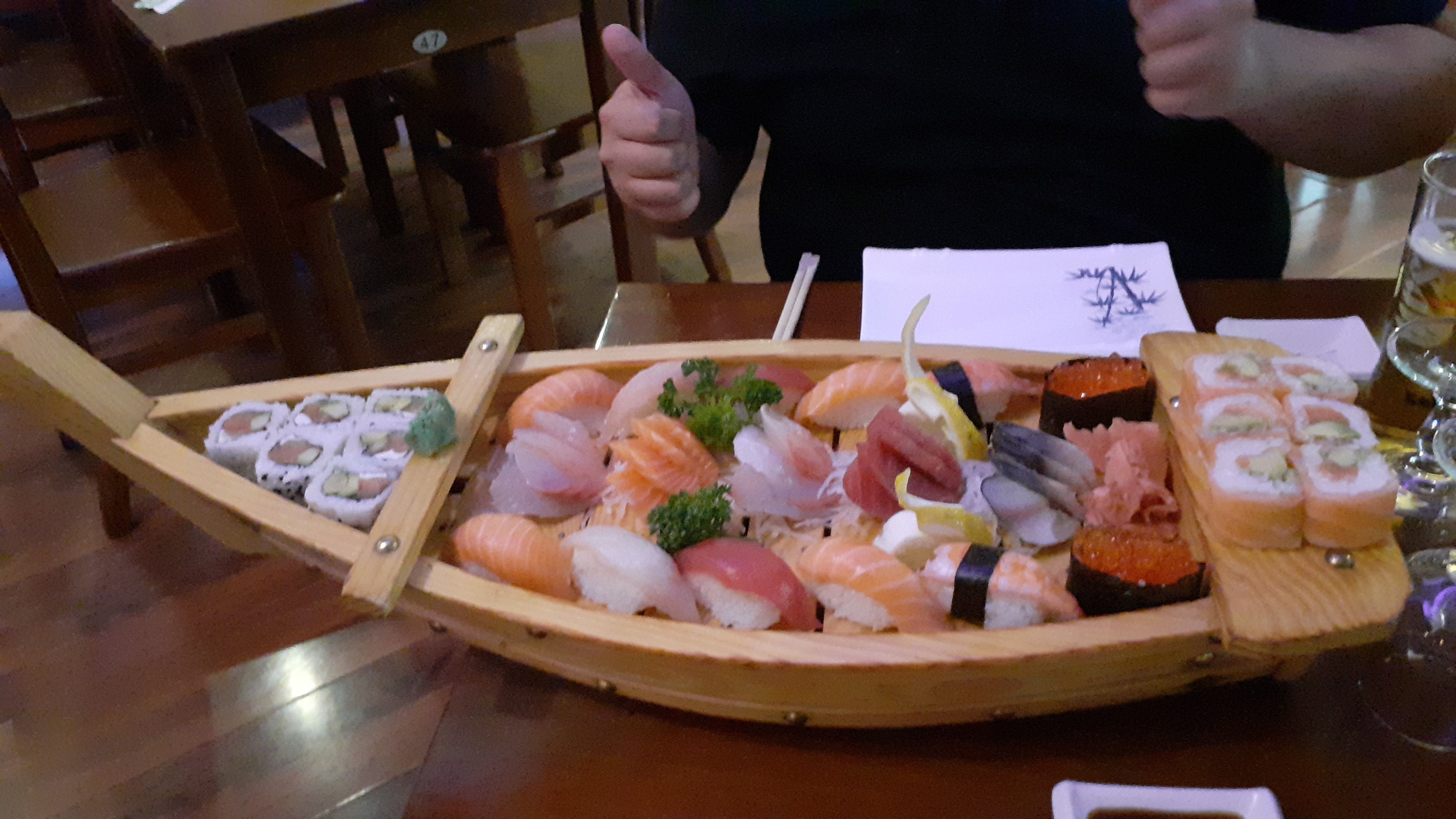 Super endroit pour sushi, cadre agréable. Nous étions quatre personnes, avions un bateau à sushi pour deux et deux jeux de lances avec du riz. Plein de nourriture. Serviteur sympathique mais un peu lent par rapport aux États-Unis.