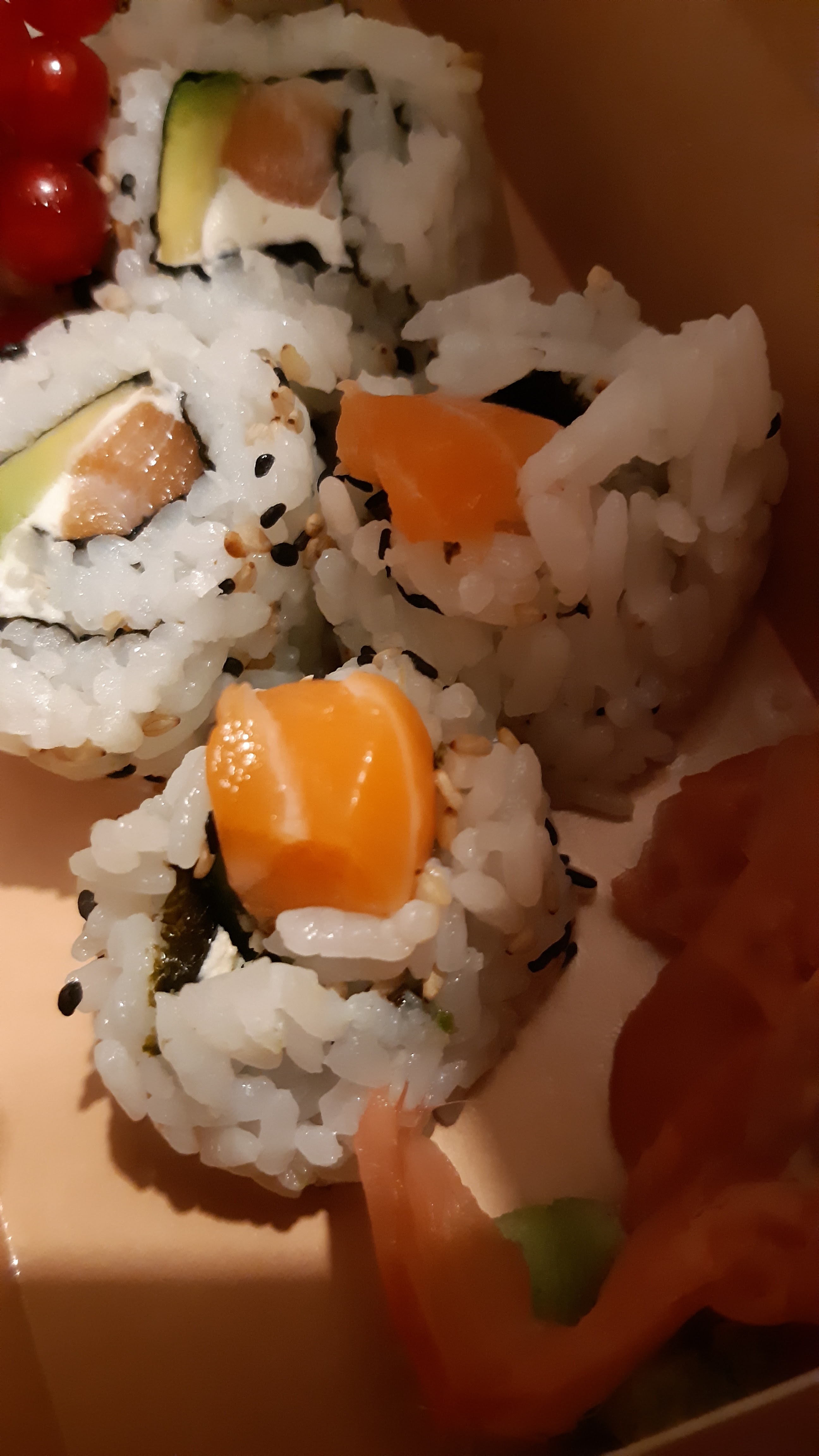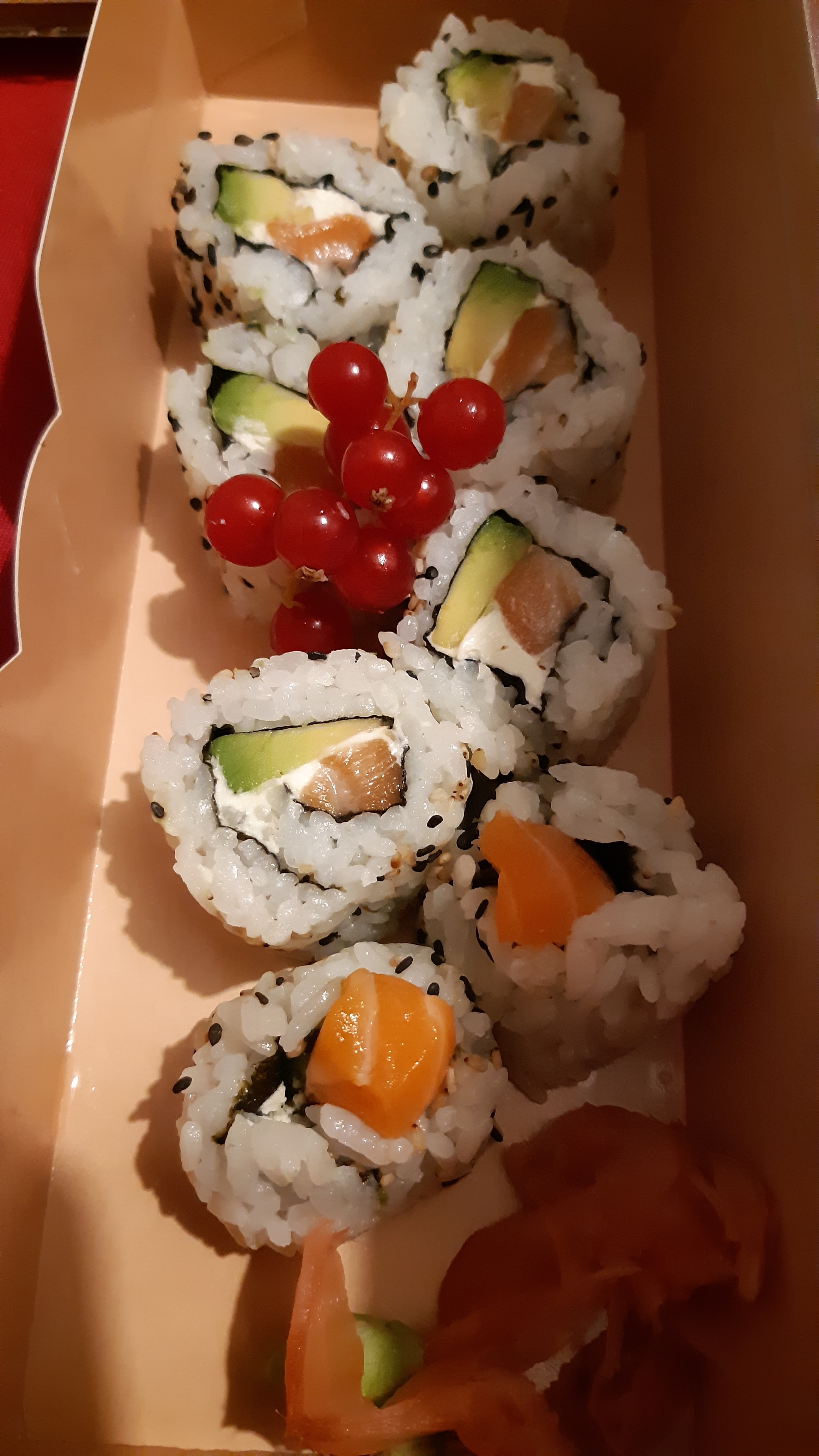 à la livraison : une boite simple, aucune sauce salé ou sucré, pas de gingembre, le wasabi une boule à l'intérieur de la boite qui c'est écrasé sur 2 3 cali donc immangeable, pas de baguette... pour le prix je trouve ça pas ouf... 4 cali complétement défait. Concernant le gout c'est correct mais je m'attendais à mieux vu la réputation. assez généreux sur les California en terme de garniture à l'intérieur