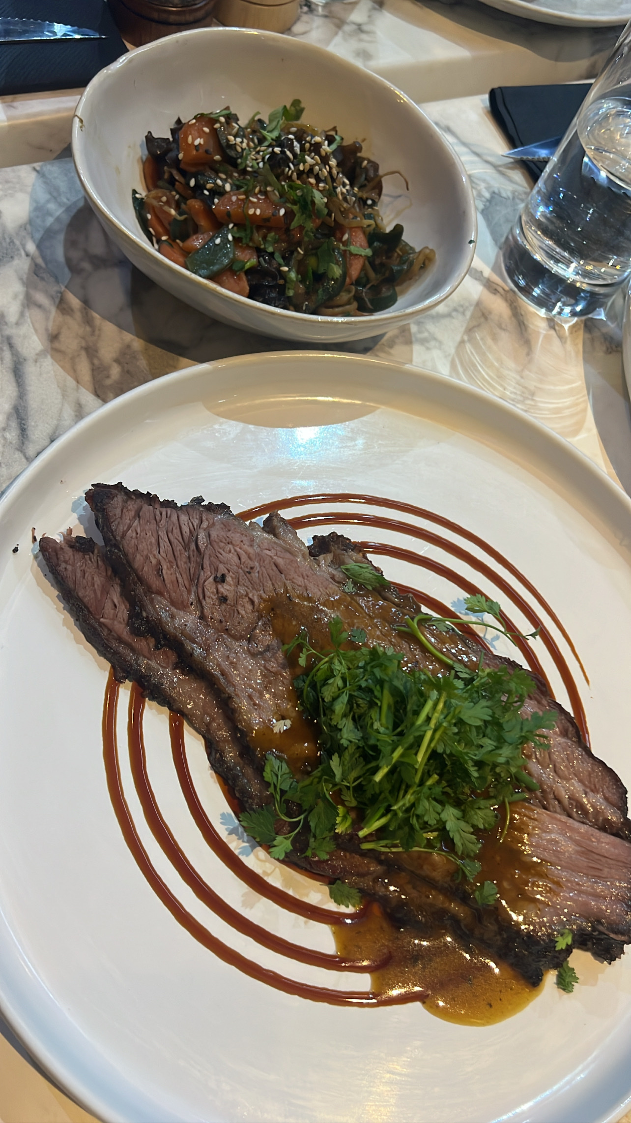 La devanture du restaurant est joli et donne envie de rentrer à l'intérieur pour découvrir ce lieu. Vous trouverez en entrant des frigos d'affinage de la viande, de très belles pièces pour le amateurs de viande. Le personnel est accueillant, la musique de fond est moderne, la décoration est soigné, en fait l'on se sent à l'aise. Les gyozas sont bon et bien servi, juste un bémol, j'aurai aimé qu'ils soient plus croustillants. Le brisket portion est très bien servi et la viande est excellente. Les frites de pomme de terre ou de patates douces un régal. Le wok de légumes, les légumes on du goût et sont craquant je recommande. Le désert banoffé, personnellement je n'aime pas la banane, mais la photo m'a donné envie, j'ai pas été déçu, il est excellent. Au final un restaurant sympathique pour un dîner en amoureux.