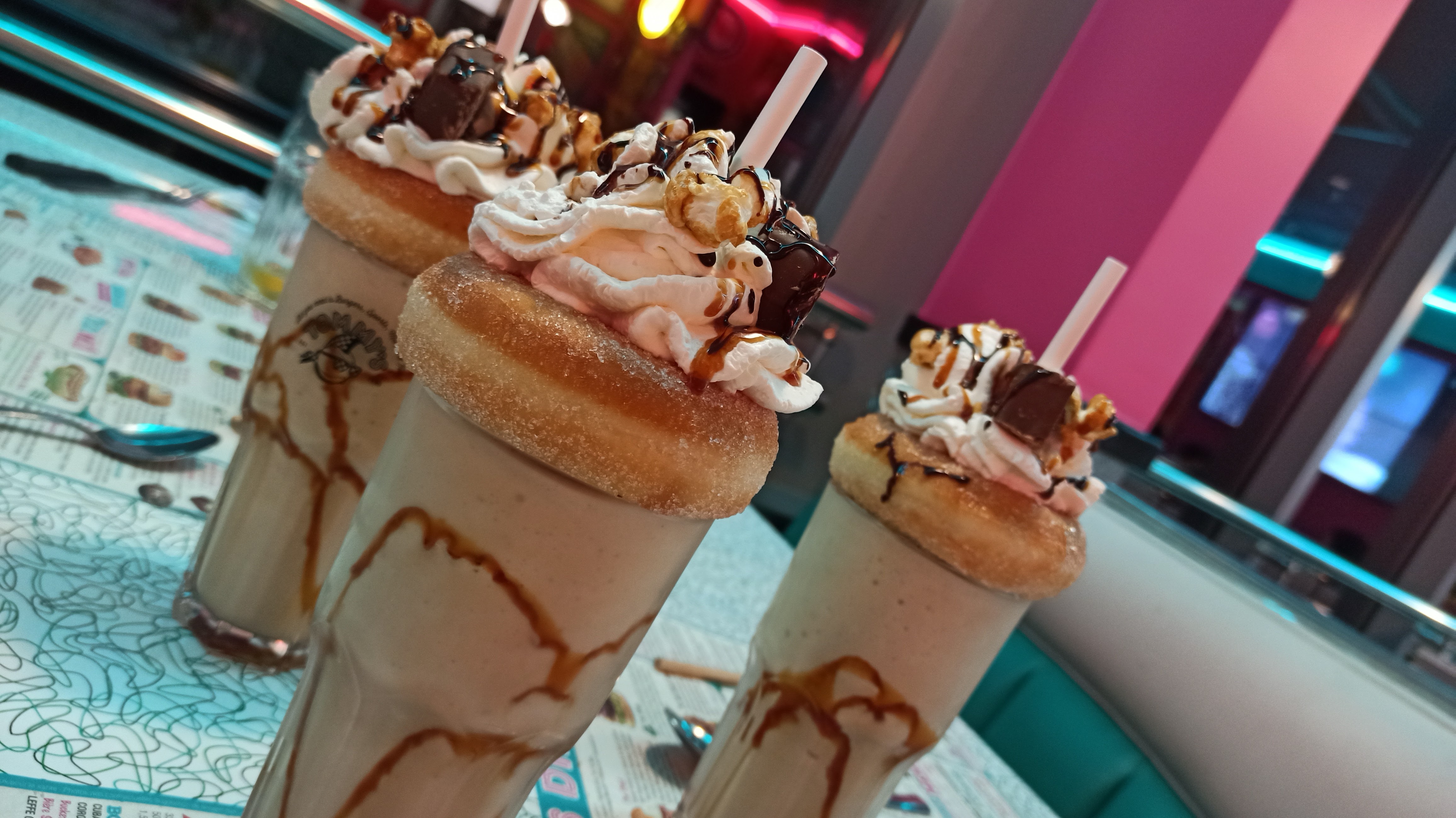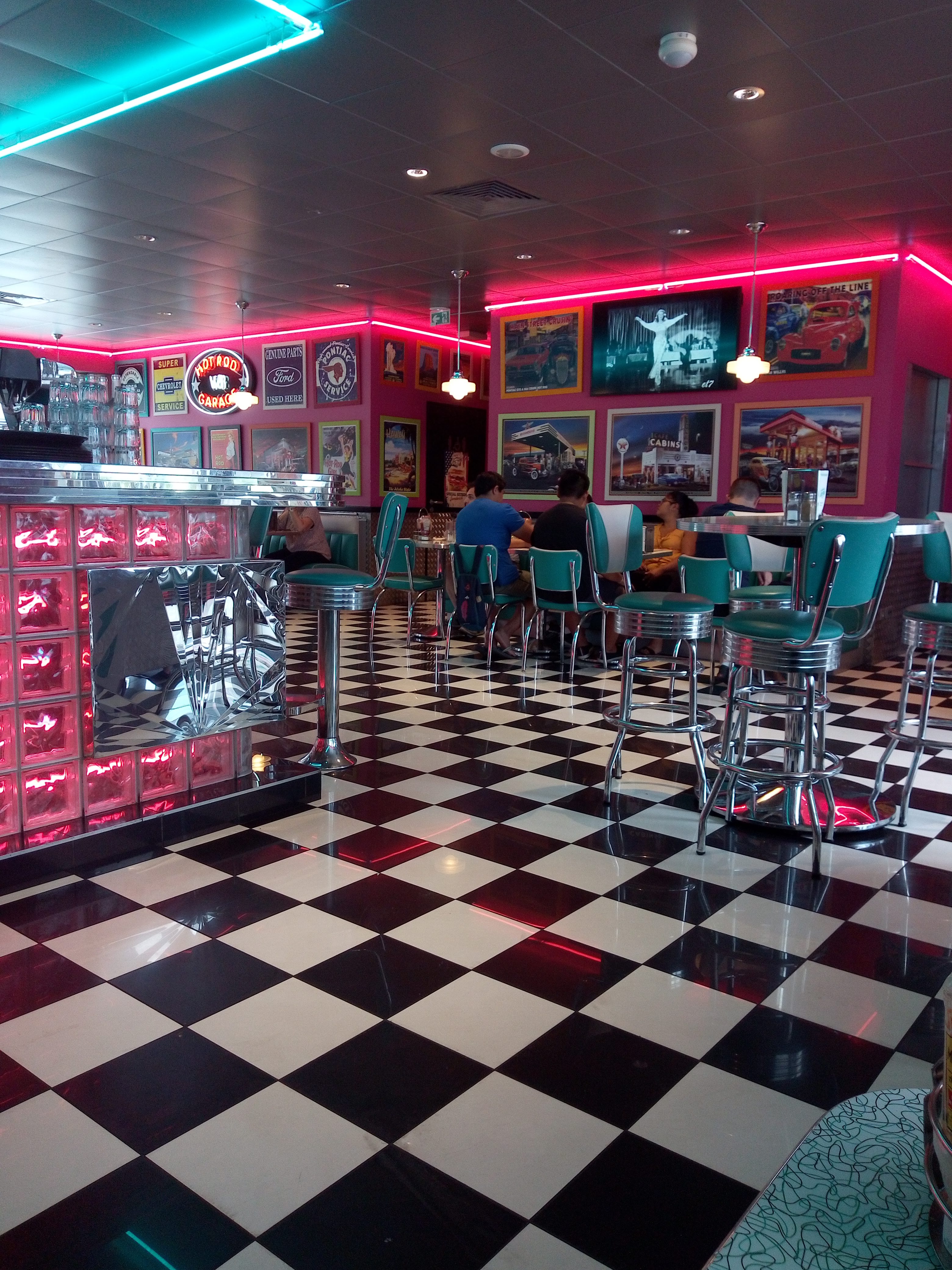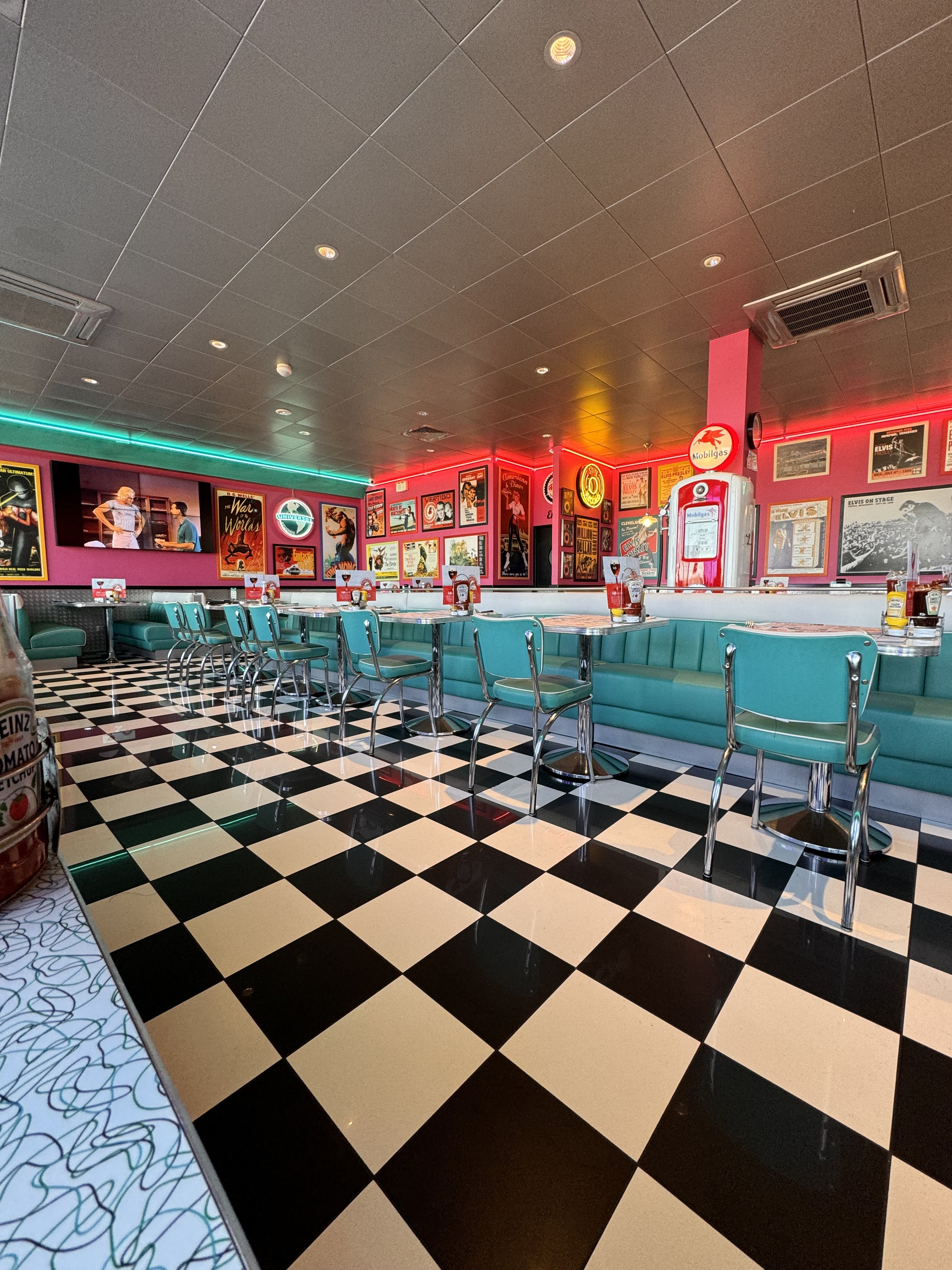 L'ambiance rétro est intéressante. Concernant la nourriture, le steak haché est en général sec et manque de saveur. Il faut absolument prendre les burgers premiums les plus chers pour avoir une chance d'être satisfait. Les autres ne sont vraiment pas terribles et sont beaucoup trop chers pour ce que c'est. Les milkshakes manquent d'onctuosité et sont trop sucrés. Ils offrent un carambar au caramel à l'addition...