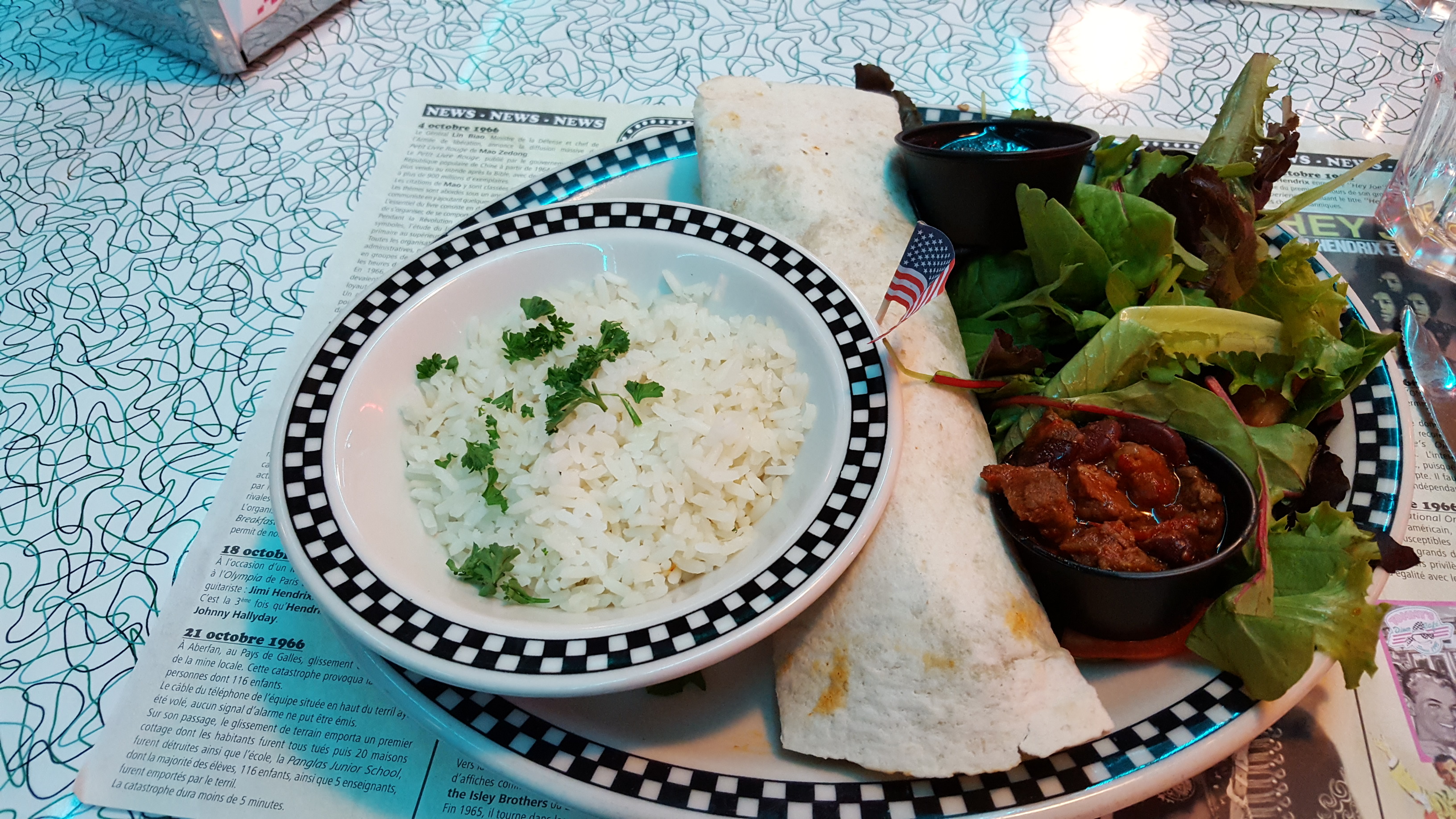 Une serveuse qui semble agacé et qui ne lève pas la tête de son clavier pour prendre notre commande. C'était de bonne guerre car la voir mâcher son chewing gum en nous parlant avec un débit mitraillette non maîtrisé était pour notre part également agacant... Un avis mitigé sur les plats. Mes quesadillas etaient pateuses et avec peu de saveur alors que les Ribs et burgers de mes amis étaient de convenables à très bons. La décoration nous met bien dans l'ambiance des sixties et hormis Calimity Jane et mes quesadillas nous avons passés un bon moment. Toutefois je ne pense pas y retourner.