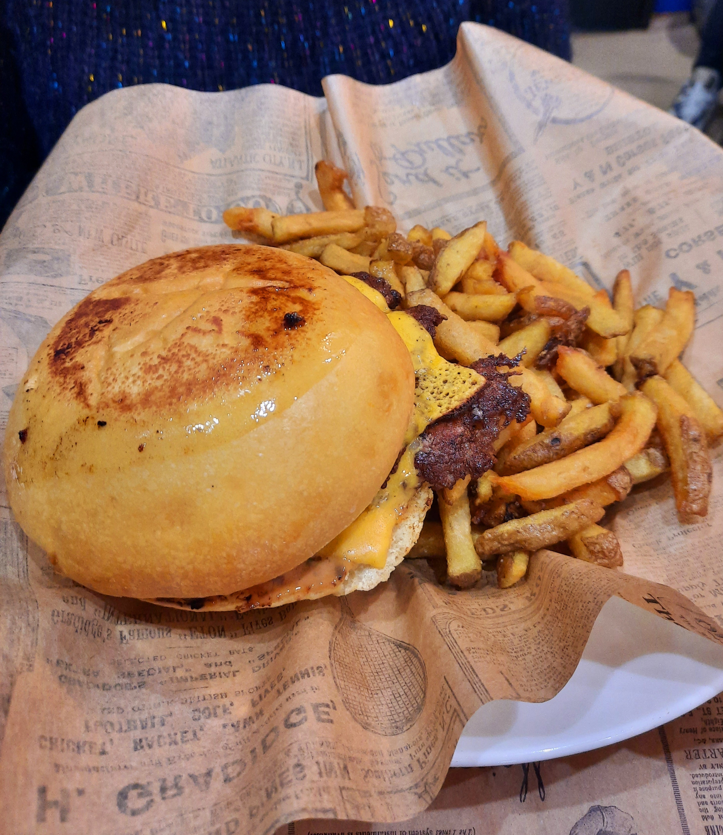 Très bon accueil, les emballages des burgers et frites façon papier journal sont sympas. Mais... les frites sont très brunes et certaines cuites façon chips. Il faut aimer le croustillant. Autre bémol : on ne demande pas la cuisson de la viande pour un burger, c'est pour problématique car ainsi on risque de ne plaire ni aux personnes qui aiment plus saignant ni à celles qui aiment plus cuit. Ce n'était pas le rush, juste un petit point à améliorer pour plus tard. Bon, là c'était bien trop cuit à mon goût - viande noircie. Encore une chose : le pain du burger était noirci sur le dessus, c'est dommage car ça donne un sale goût de brûlé. Dommage car le burger est copieux et le personnel très cool. À retester une fois.