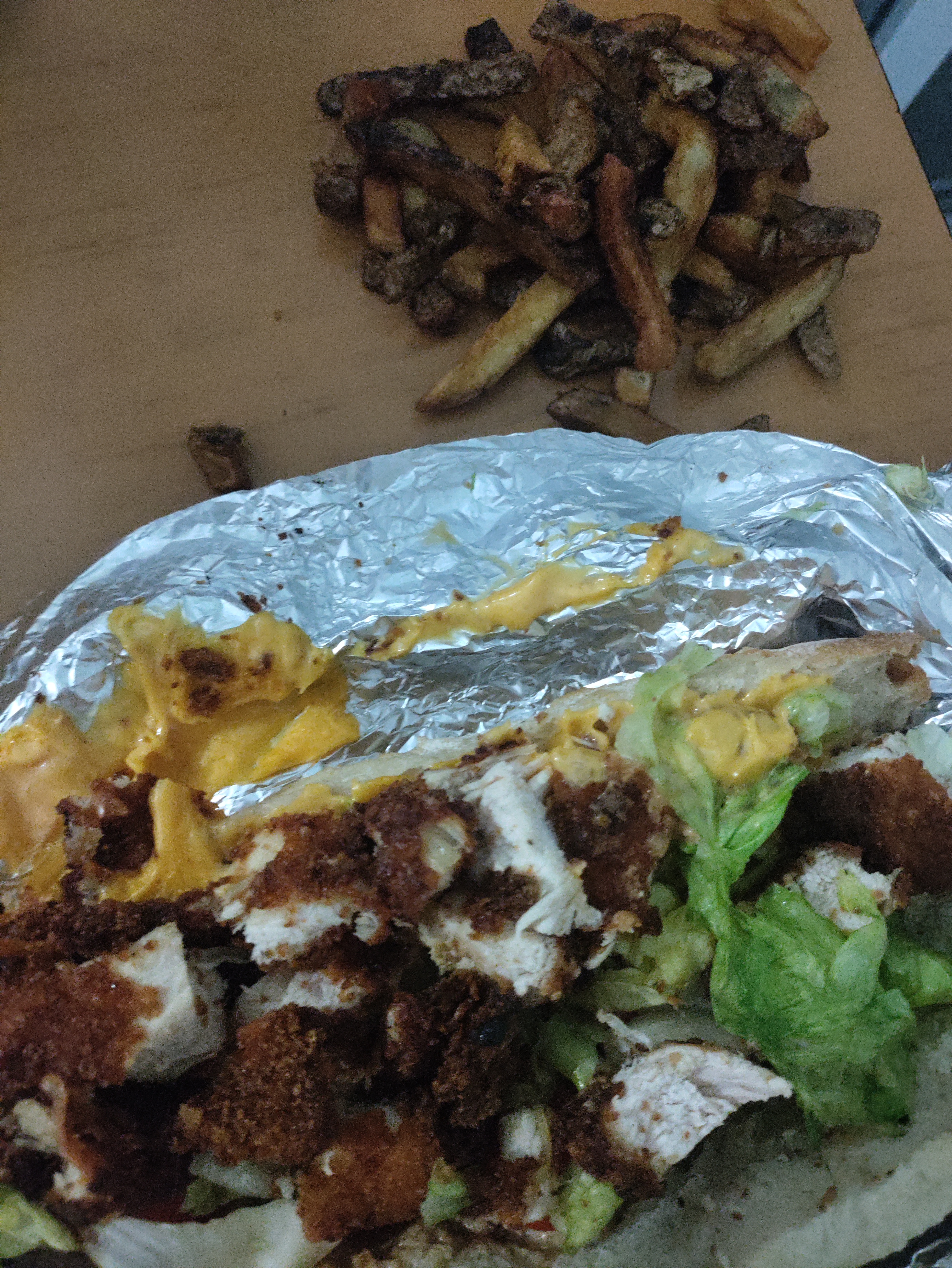 1h30 d’attente (livraison). Le poulet était sec, bcp trop cuit ou mal cuit. Les frites super grasses (dommage pcq elles ont l’air faites maison, mettre moins d’huile ça serait meilleure :) ). La présentation était bien, mais ce n’était pas bon et j’ai attendu bcp trop longtemps pour ça