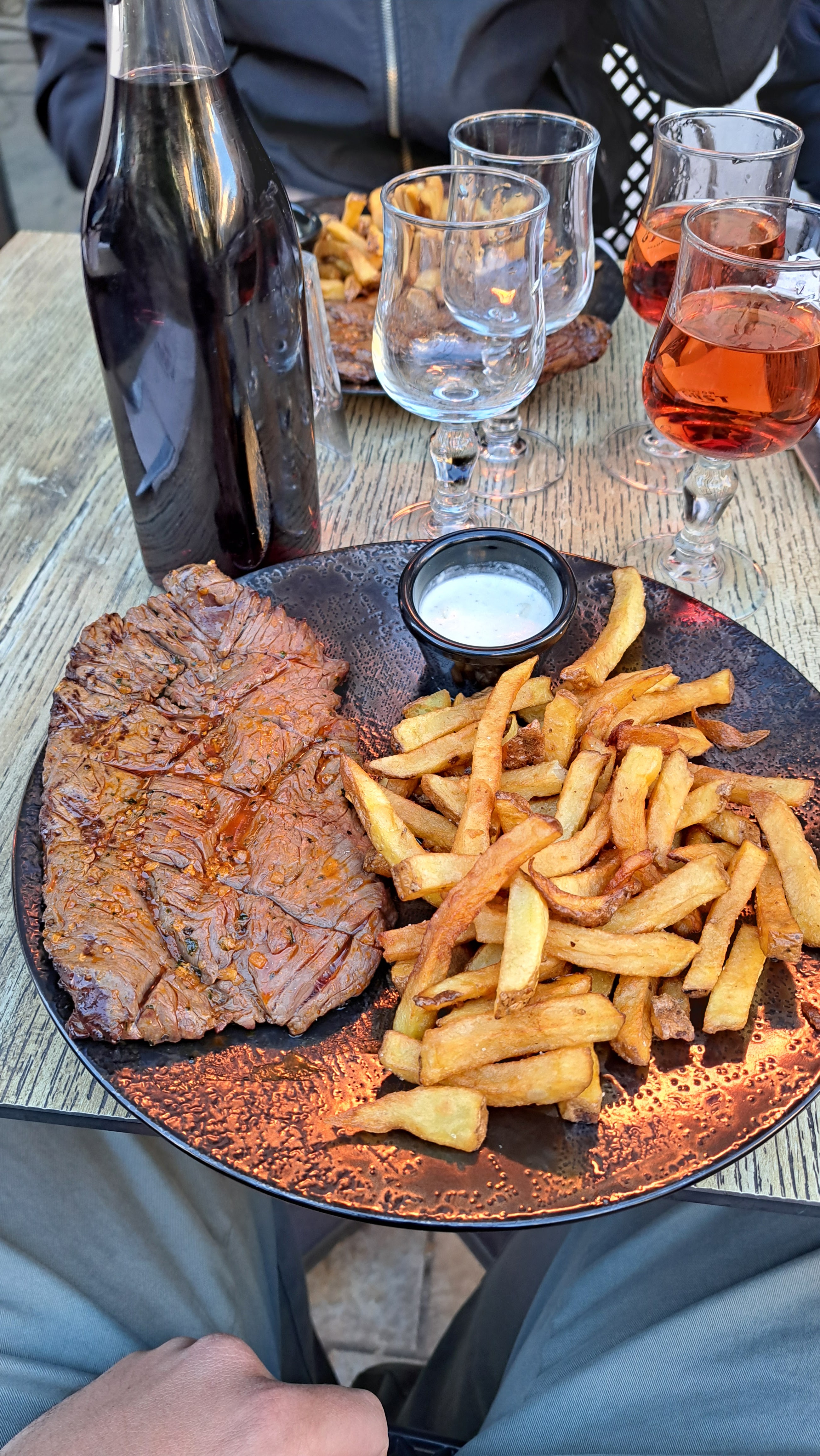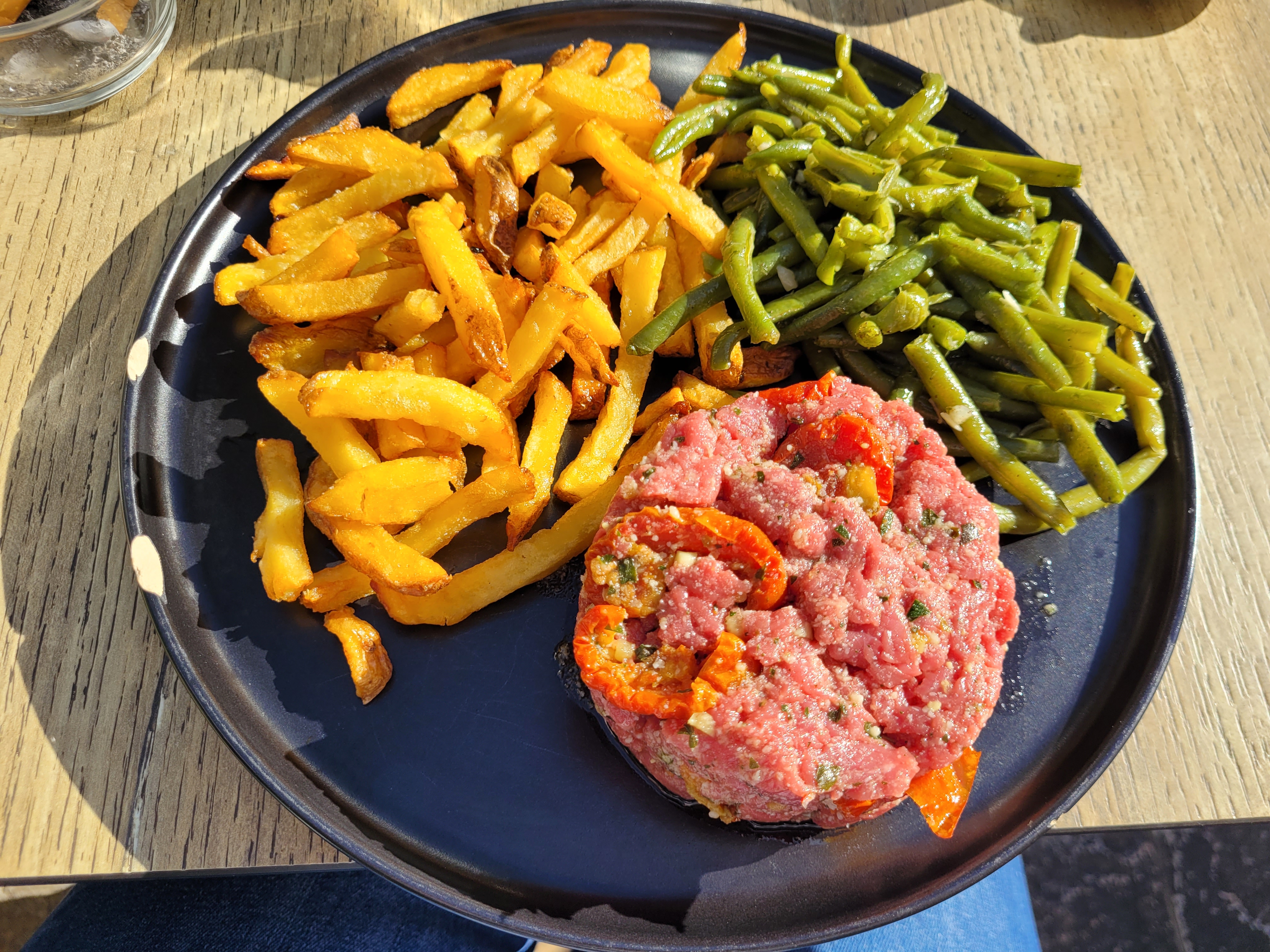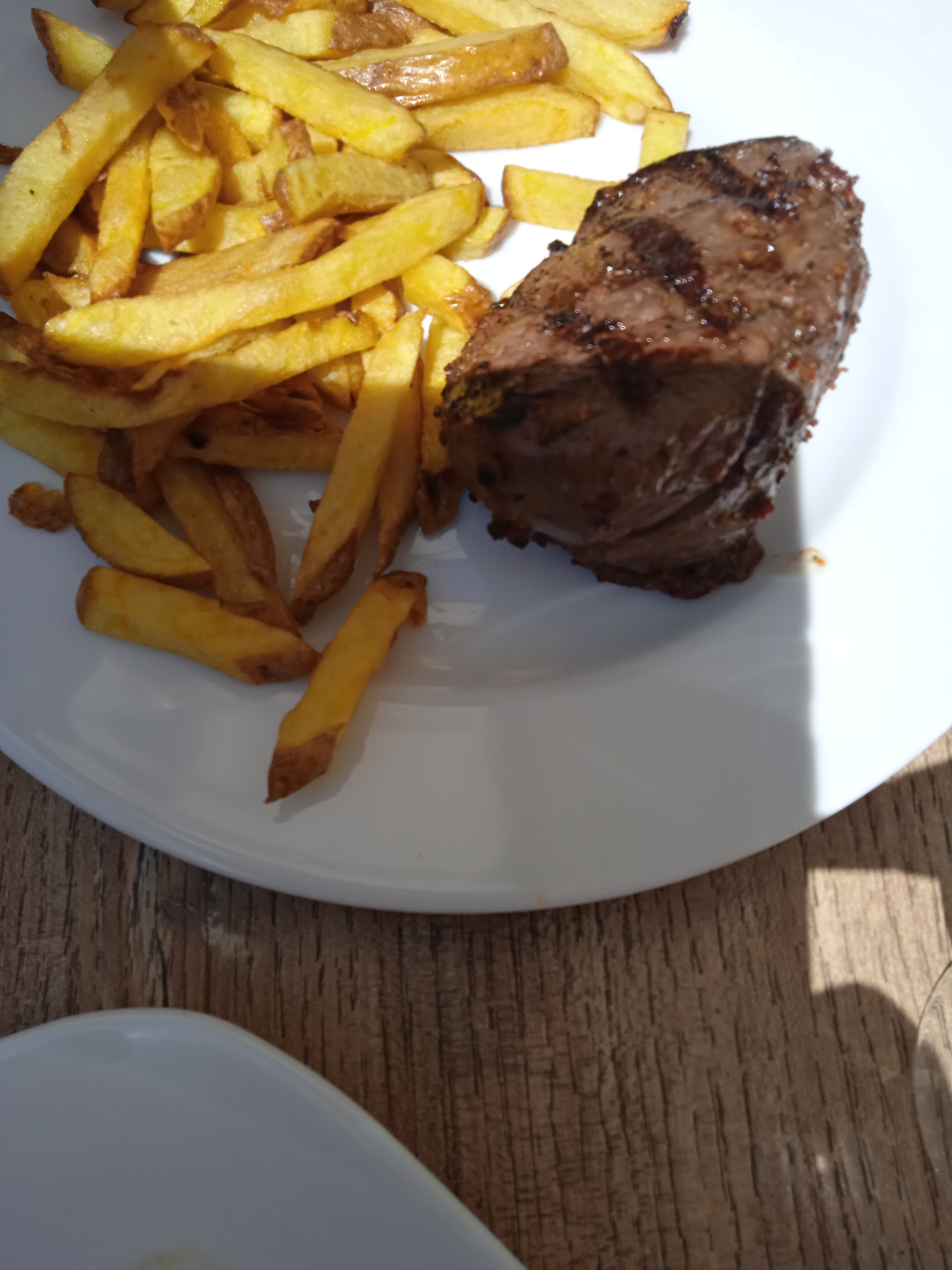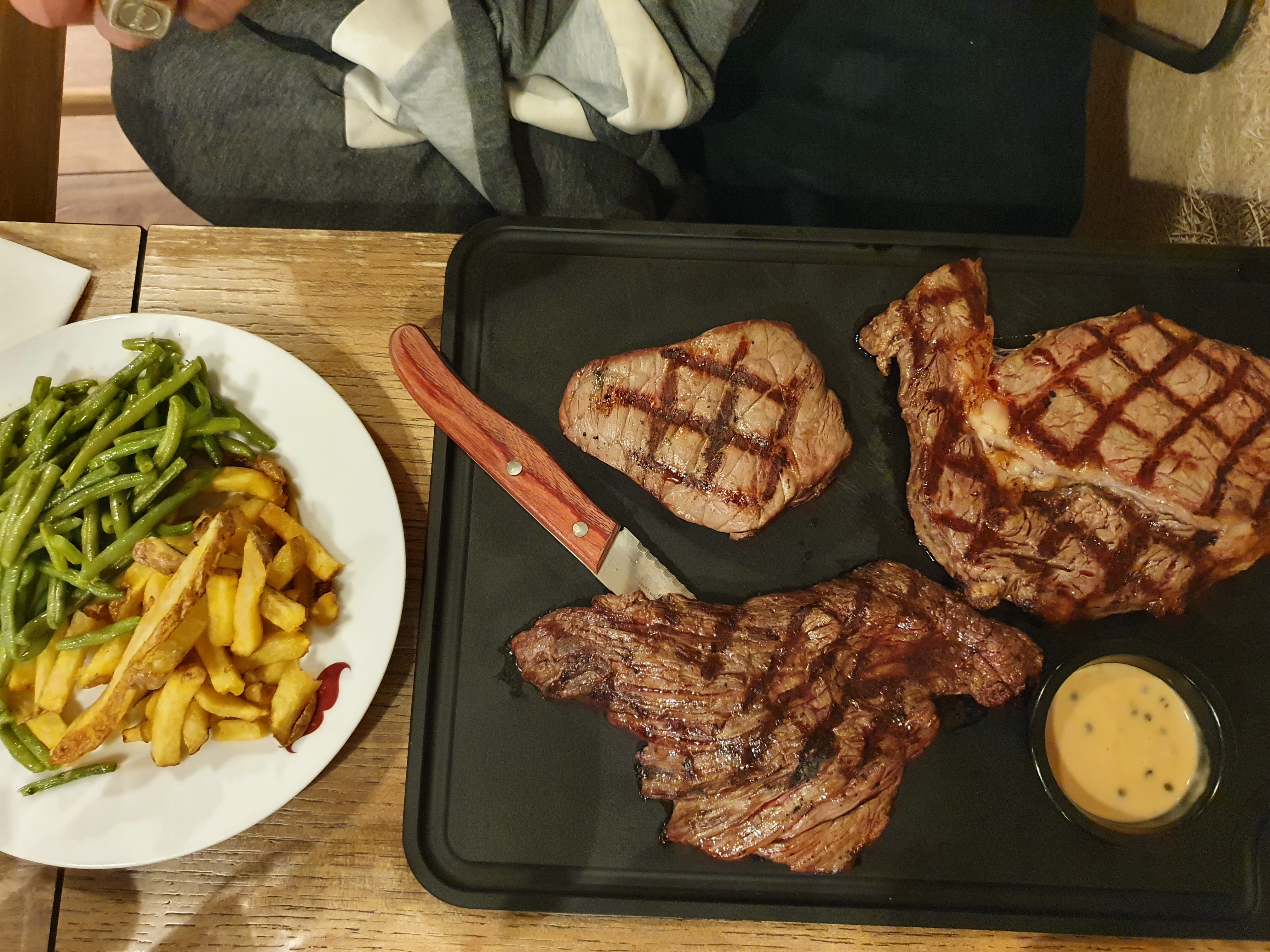 Viande de qualité (entrecôte au 3 poivre) et très bonne, les frites étaient un peu trop cuites (on dirait pas pas sur la photo mais en dessous il n’y avait que des chutes trop cuites) sinon tout était très bon. Je recommande