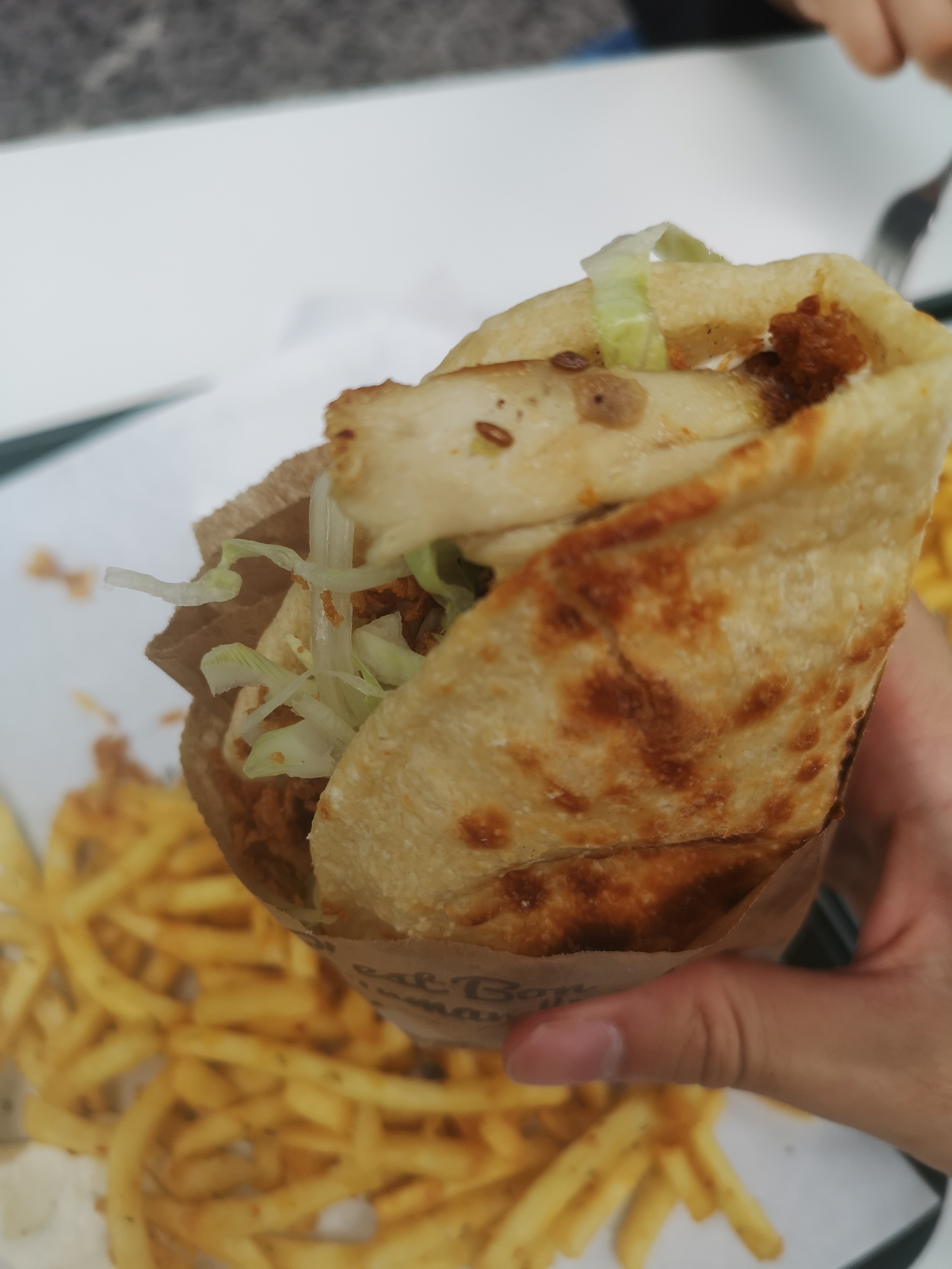 Nourriture très fraîche et délicieuse! Nous avons pris le kebab de poulet. C'était plein de saveurs et servi dans un pain naan frais et moelleux. Les frites étaient également bonnes. J'adore les sauces pour tremper. Bons prix! Nous y retournerons certainement toujours