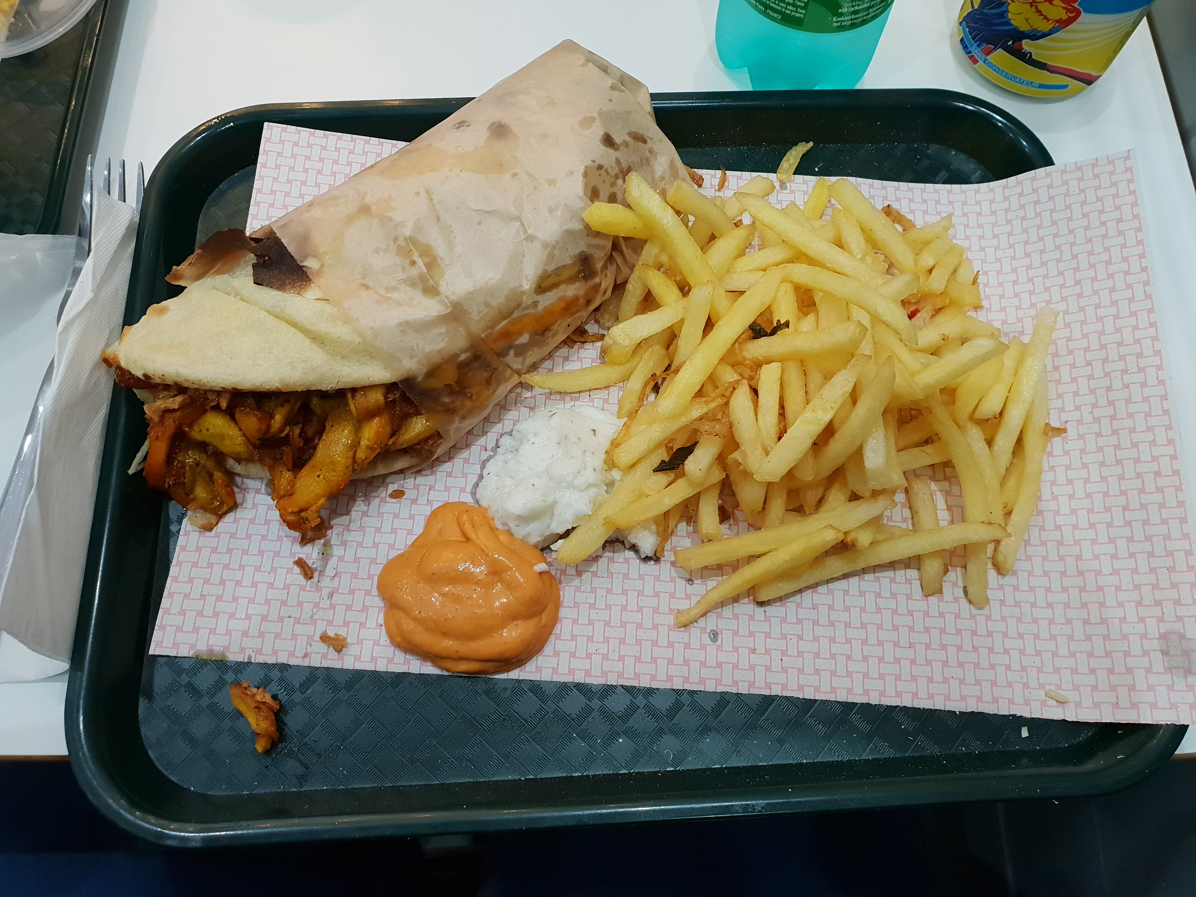 Naanwich bien assaisonné et généreux ! Je recommande le riz en accompagnement plutôt que les frites. Servi avec 2 sauces : à l’ail et pimentée. Très bonnes