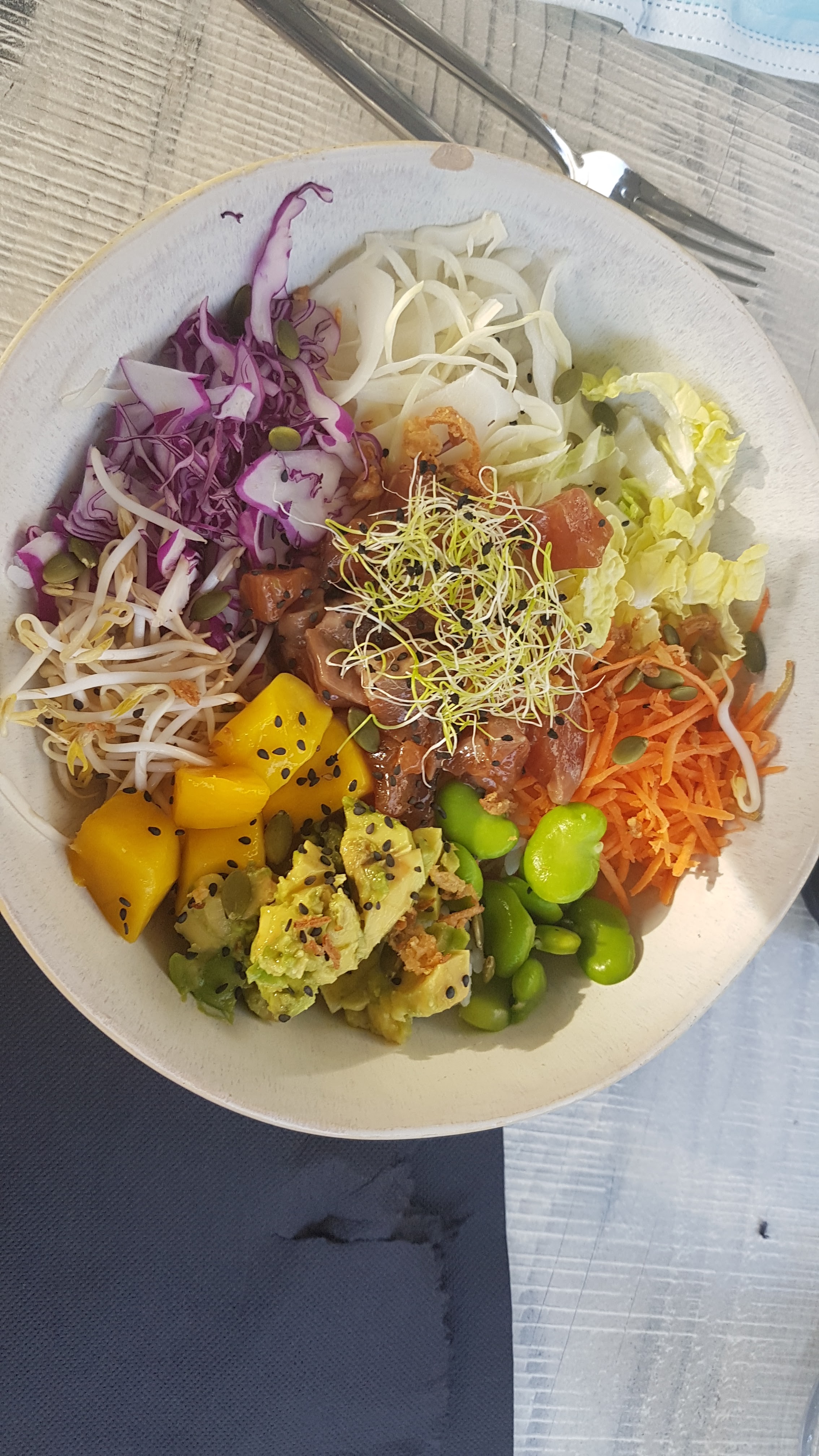 Comment ne pas aimer tarif top notre petite serveuse rien a dire souriante l'endroit sympa 2 salades super une caesar et une détox très frais très bon 2 piscines de rosé généreuse un endroit où nous allons revenir sans problème.merci le service rapide parfait.