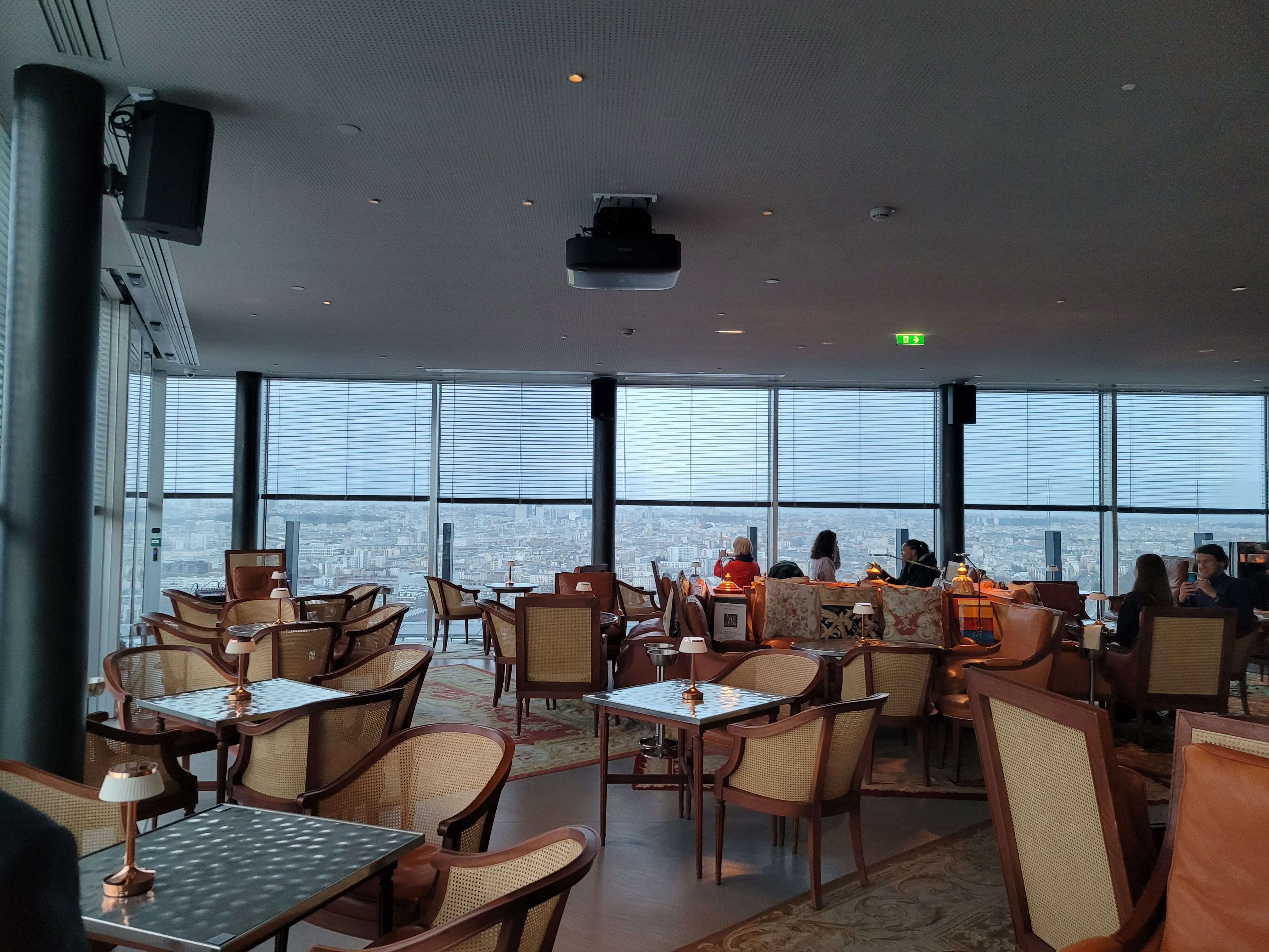Superbe cadre et vue exceptionnelle sur Paris par temps d orage au 27ème étage Cocktails sympas Prix des plats excessifs ! Très bon accueil