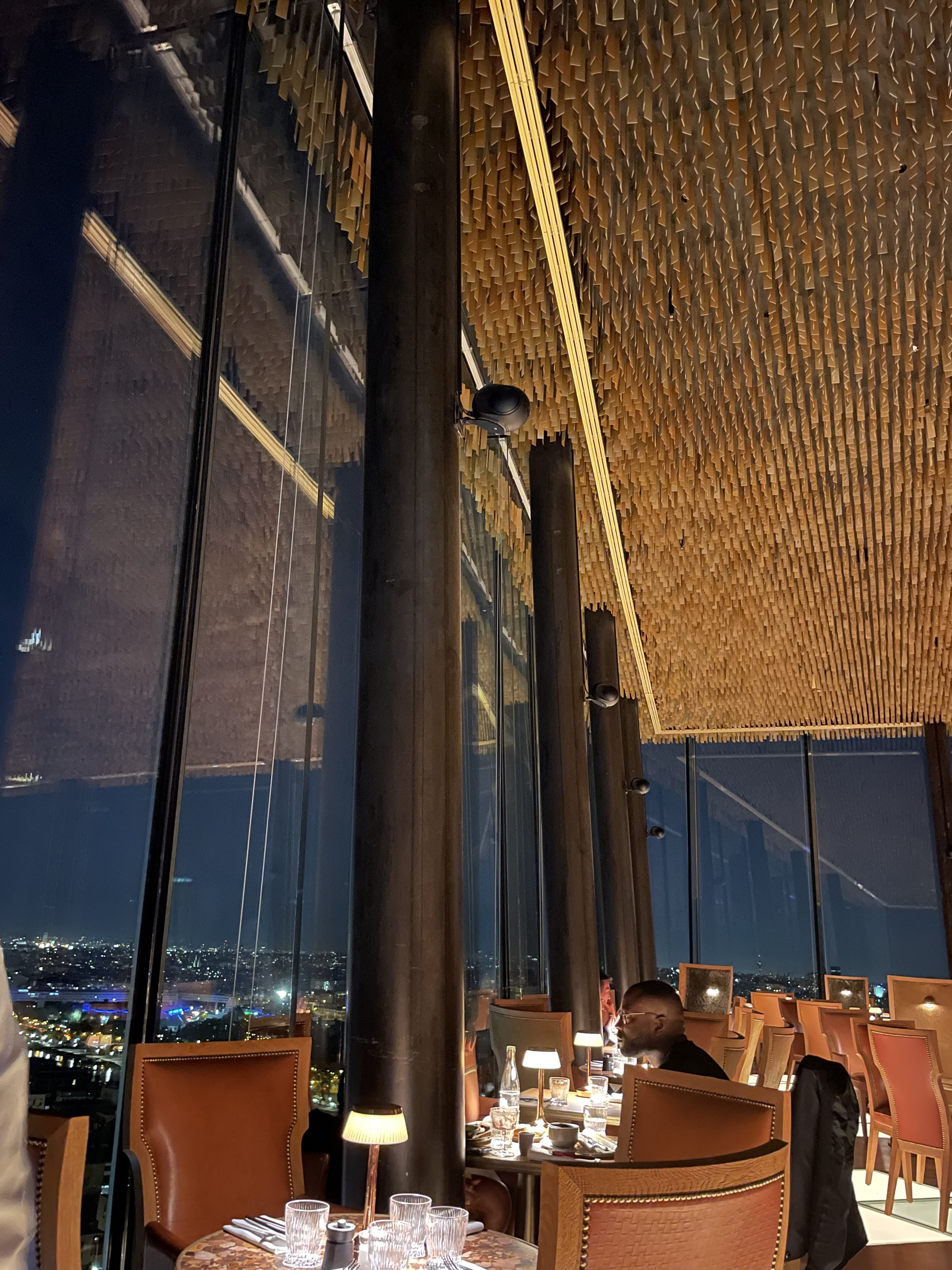 Les + : lieu incroyable; De grandes vitres à l’instar d’un loft New-yorkais, une ambiance tamisée et élégante. Des serveurs aux petits soins. Une vue sur tout Paris. Les plats sont savoureux et originaux avec des influences asiatiques. Les - : Objectivement il faut avouer que le rapport qualité/prix n’est pas très bon. On paye davantage la vue et le cadre que la qualité intrinsèque des plats et des cocktails. Niveau prix on est davantage sur un restaurant 1*. Mon principal bémol est sur la longueur du service. Encore une fois le personnel est très agréable et maîtrise son sujet mais nous avons attendu 1h entre chaque plat. Mon conseil : poursuivez votre soirée au skybar juste au dessus pour profiter de la terrasse.