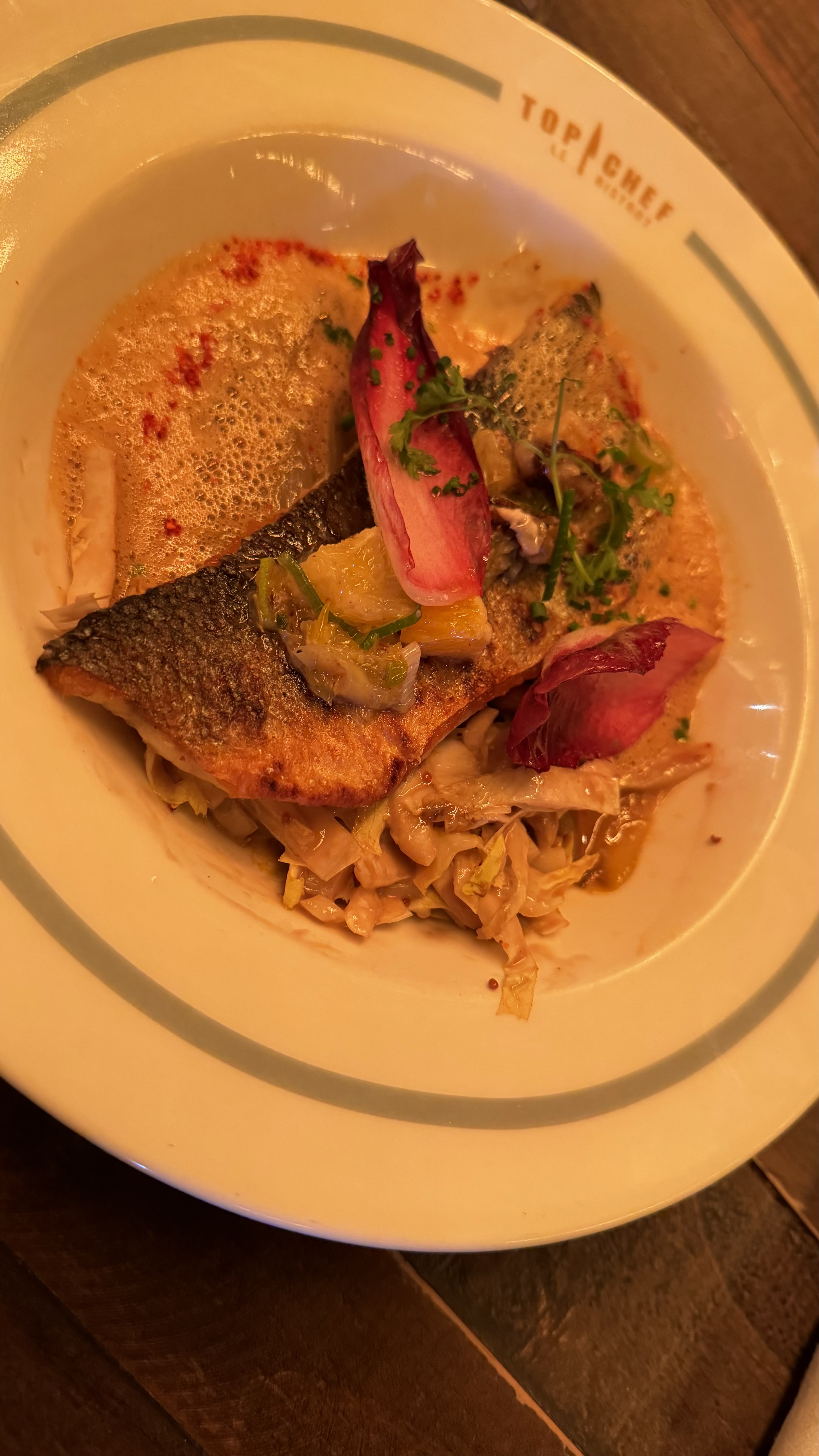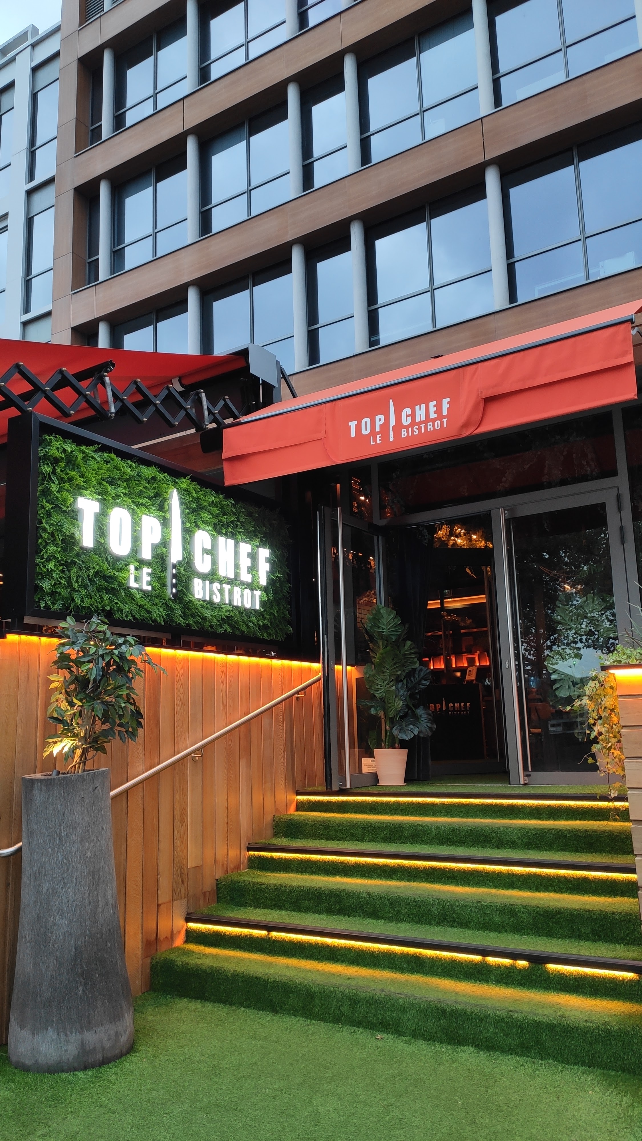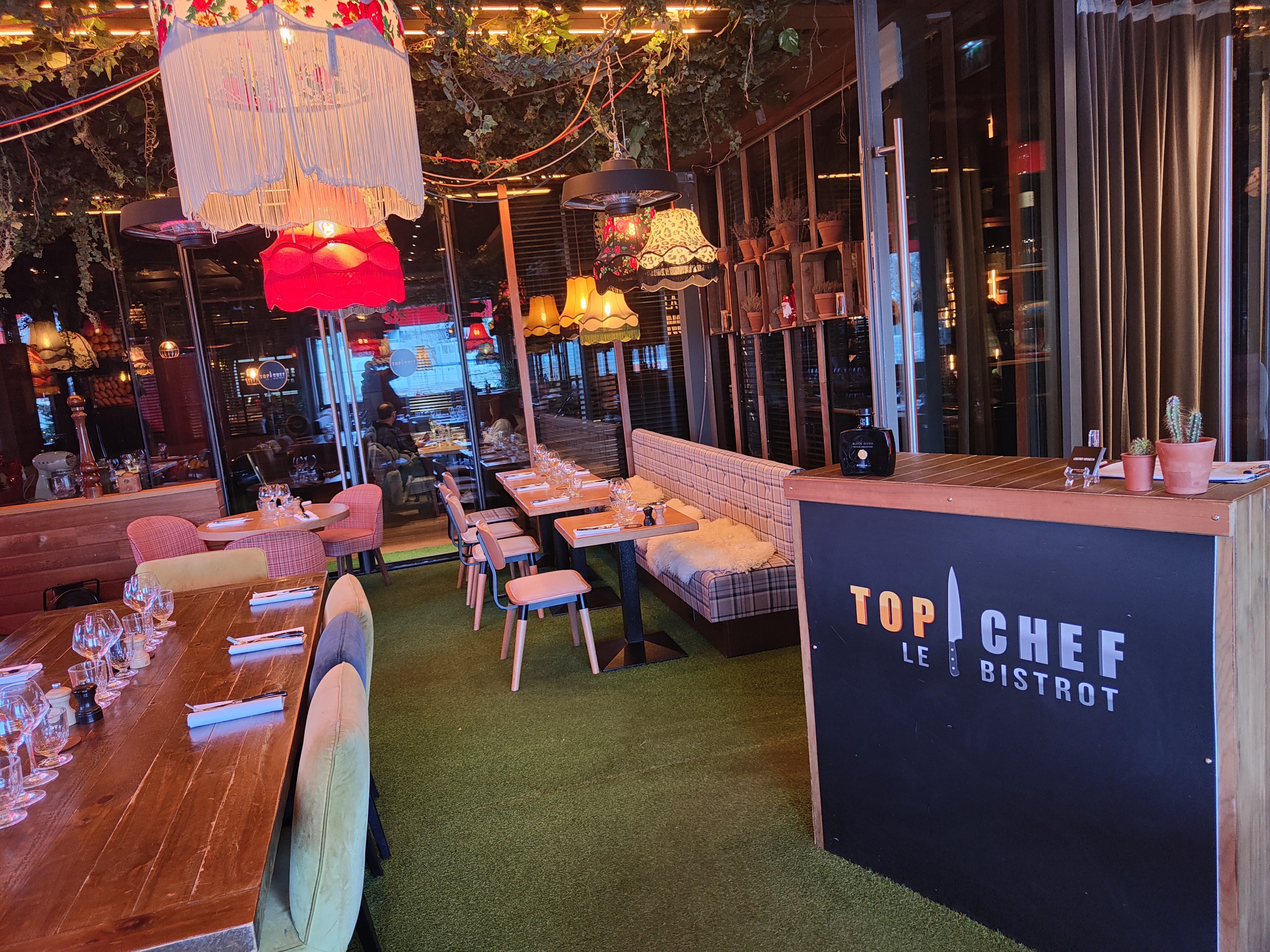 Un lieu avec un très fort parti pris sur la celebre émission. Des decorations extérieures laissant penser à une epreuve. Le cadre nous emmene vite dans le milieu. L'intérieur est plus épuré avec des choix de bons goûts. Ce bistrot, qui clairement n'en est pas, propose un menu unique avec plusieurs choix. Pour avoir essayé la majorité des plats, une chose en ressort clairement, c'est qu'il y a un certain niveau d'exigence, de préparation de décoration, que l'on est pas censé avoir dans un bidtrot classique. Le dressage est très souvent minutieux avec un éventail de couleurs harmonieux disposé dans des élégantes assiettes. Parlons à présent du goût, tout le travail est inspiré des candidats de Top chef, et clairemment, on ressent tout le savant mélange des ingredients - de première qualité - offrant une palette gustative impressionnante avec un équilibre des saveurs presque umami pour certains. En somme, un voyage culinaire à faire si l'on veut s'aventurer vers des mets audacieux et travaillé. Les quantités sont en sus plutôt généreuse. Ma seule reserve reste la carte des vins, certains vins de belles perles tandis que d'autres sont clairement en deça des attentes